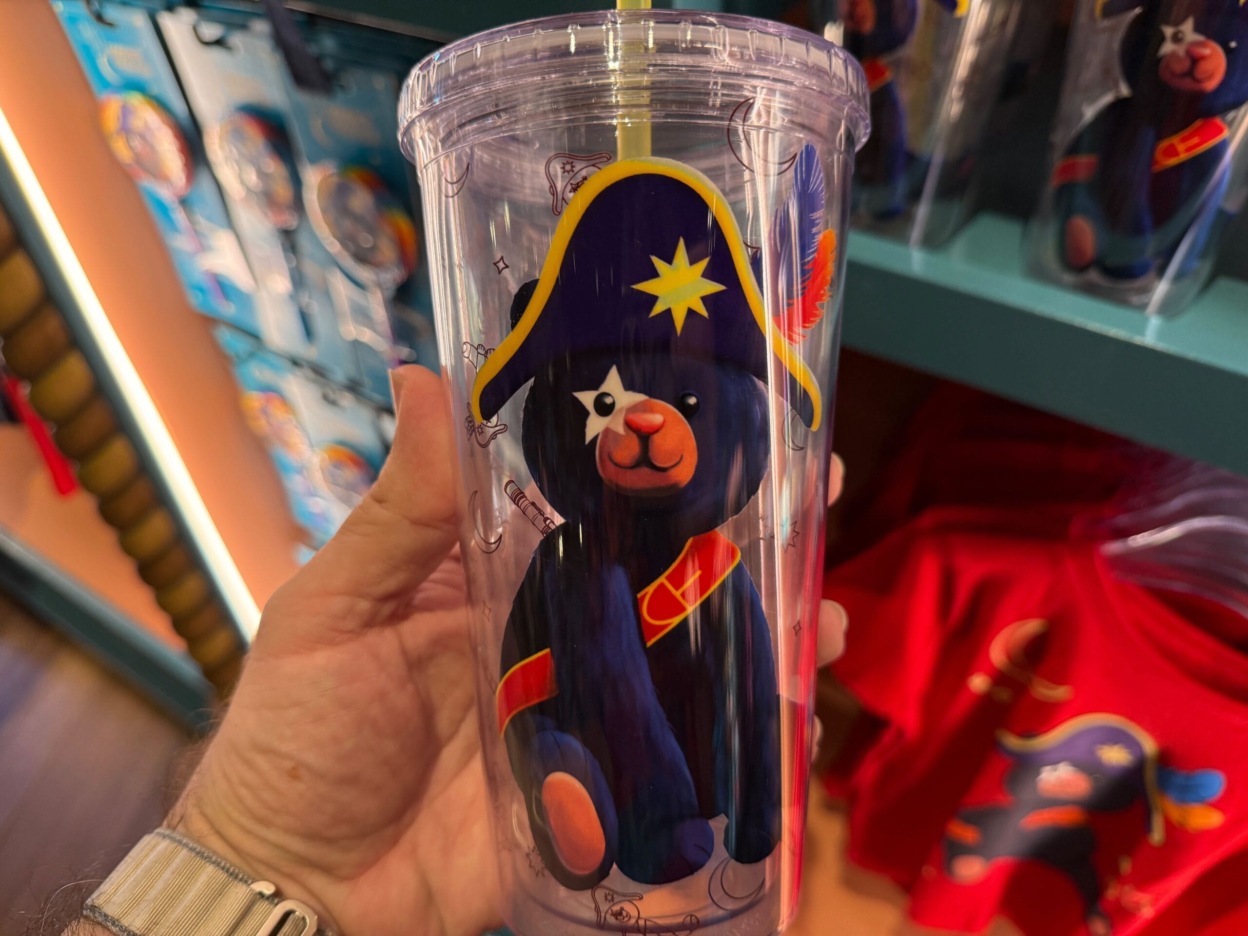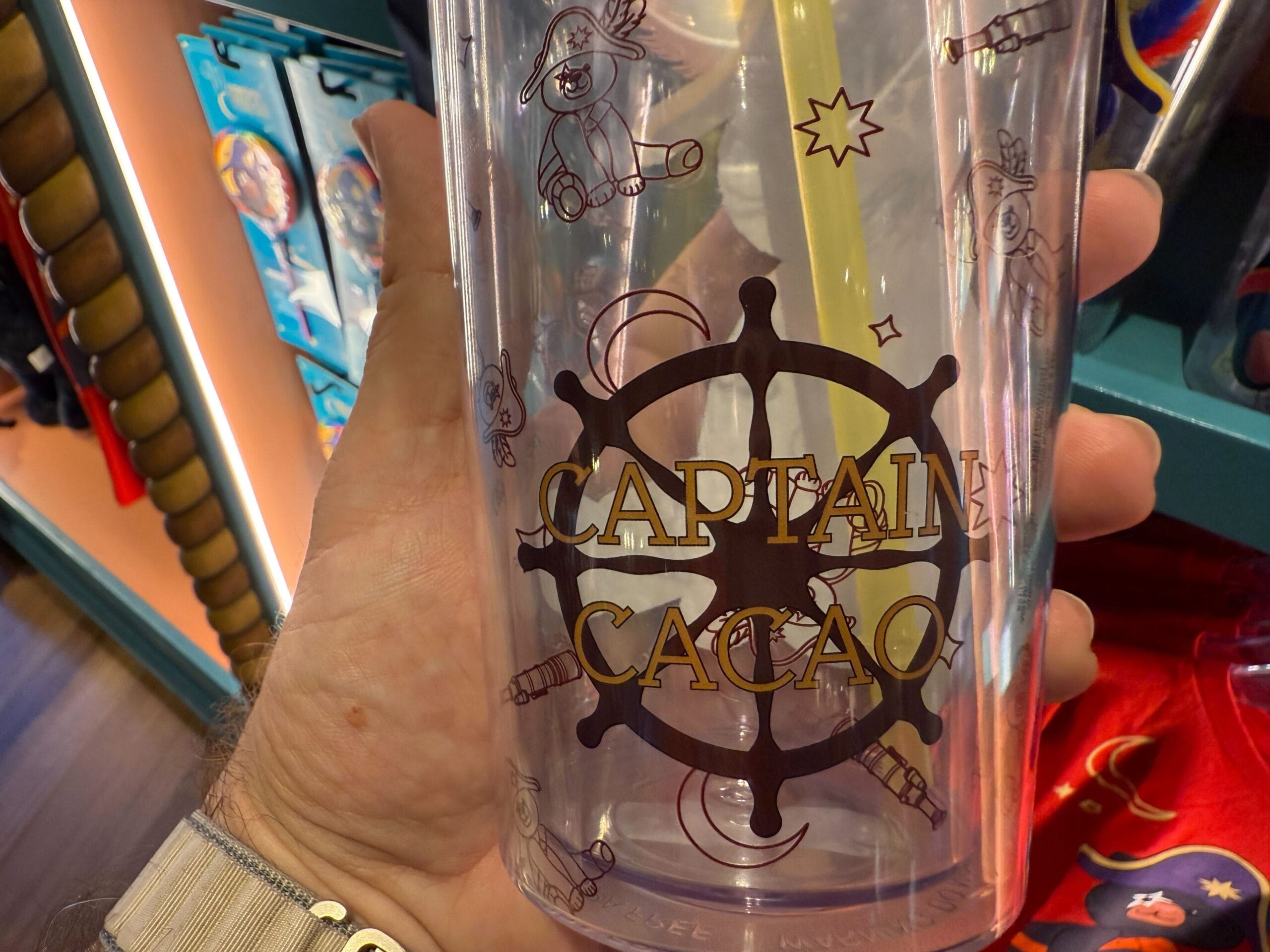 The clear tumbler has an image of Captain Cacao on one side and a helm on the other. There are brown stencil outlines of the moon, stars, and Captain Cacao himself. The straw is yellow.