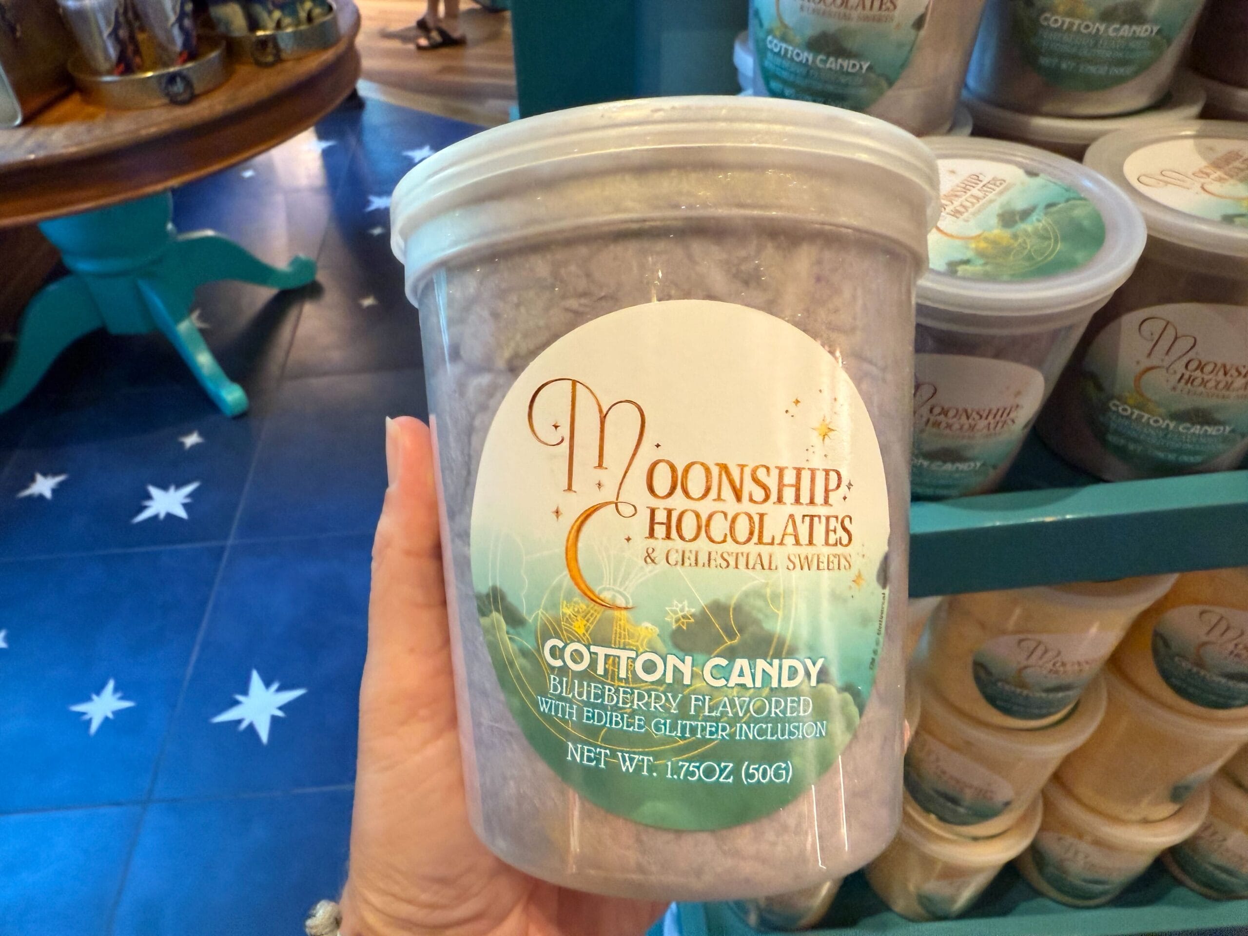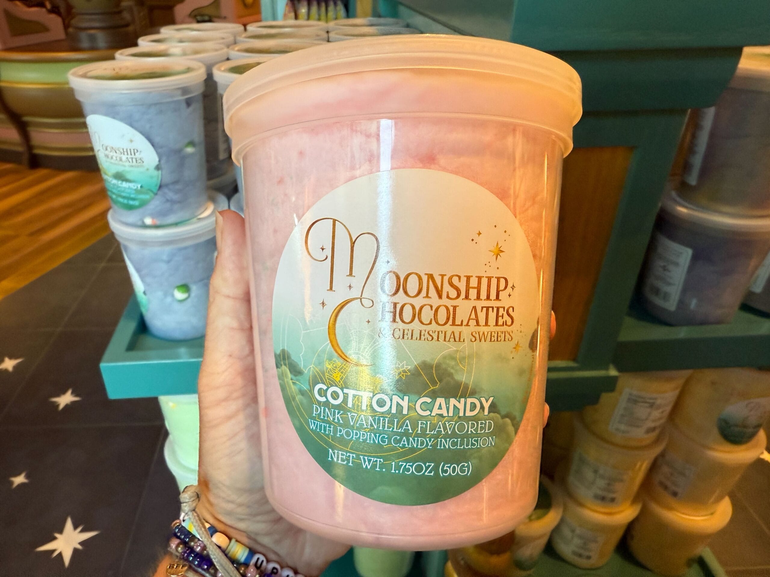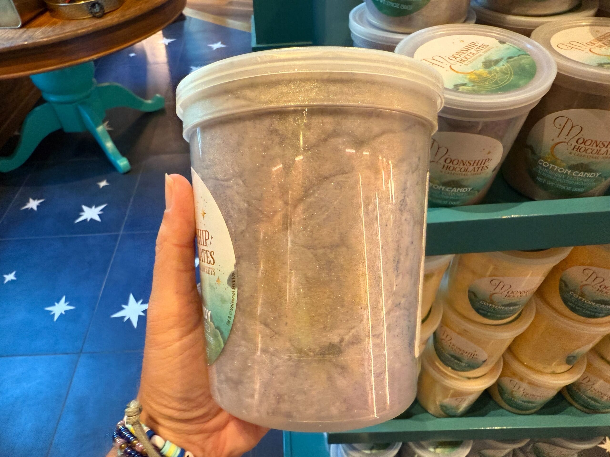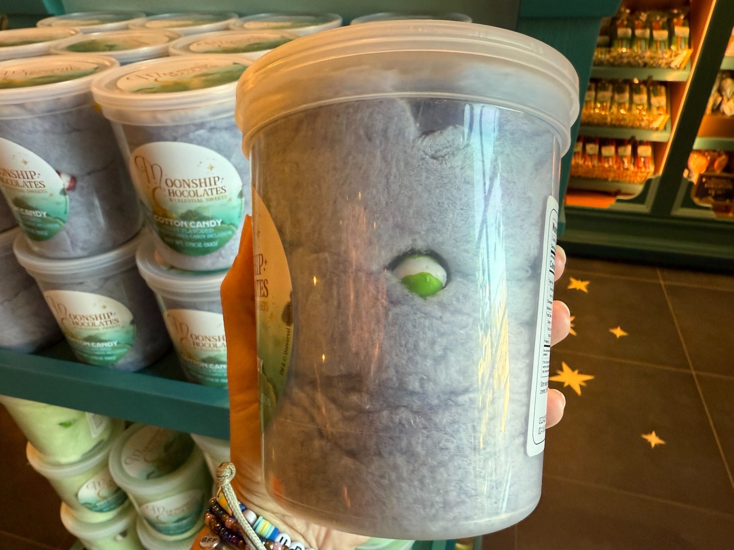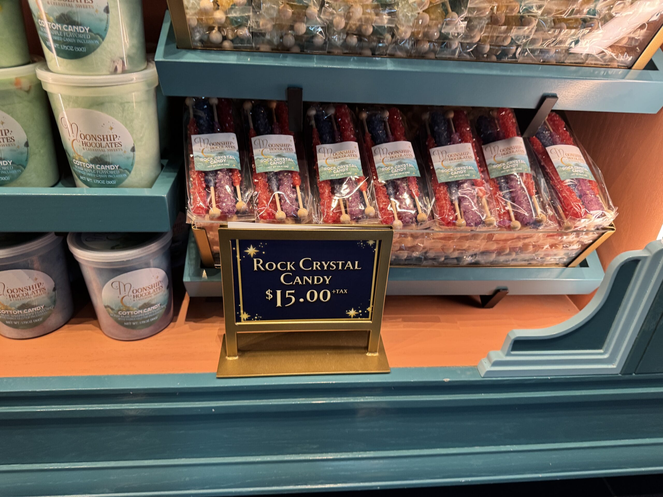 Lastly, grape-flavored cotton candy is available at Moonship Chocolates. Some large hard candy pieces can be seen.