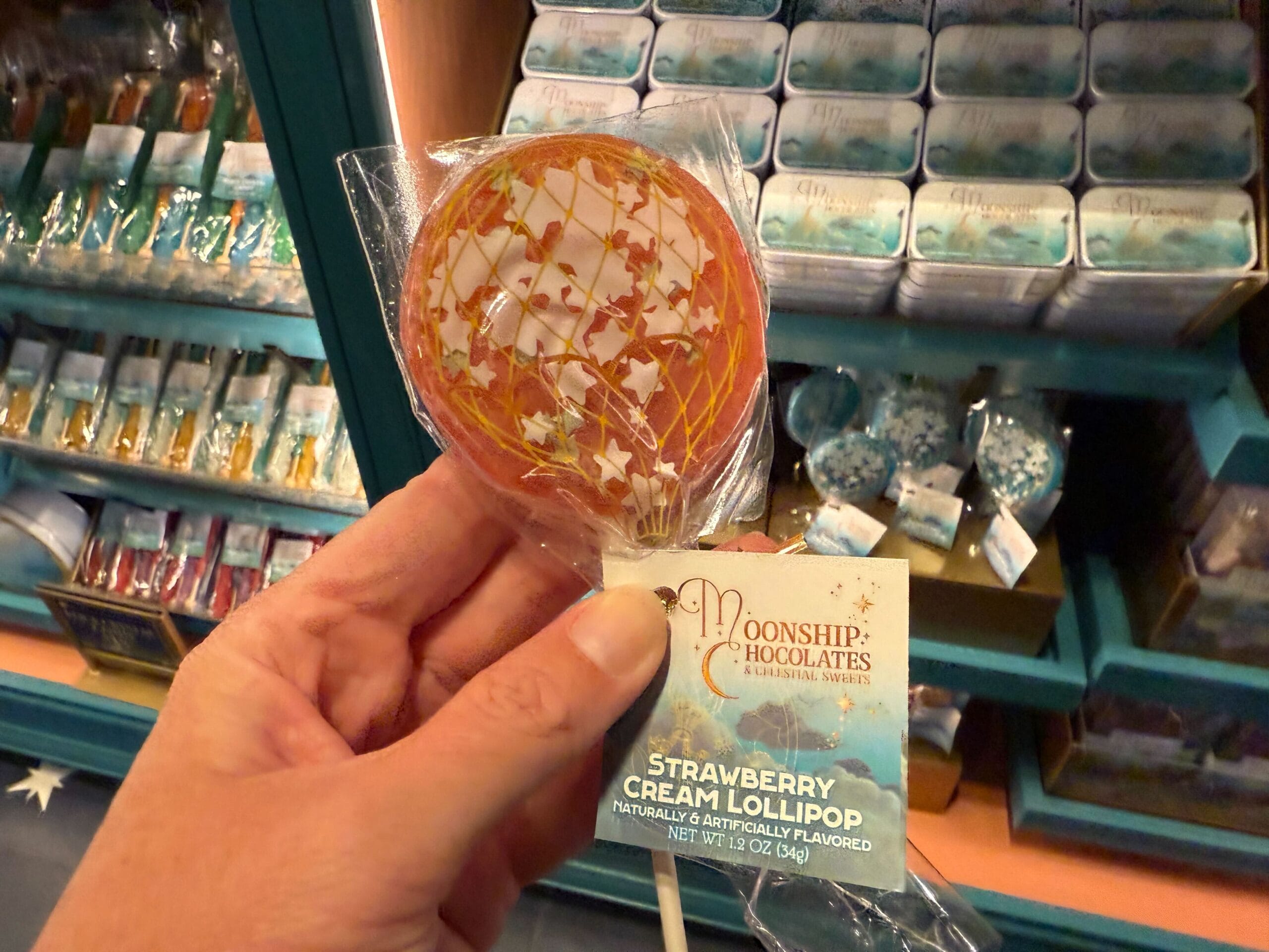 The moonship lollipop is strawberry cream flavored. It’s pink with white stars.