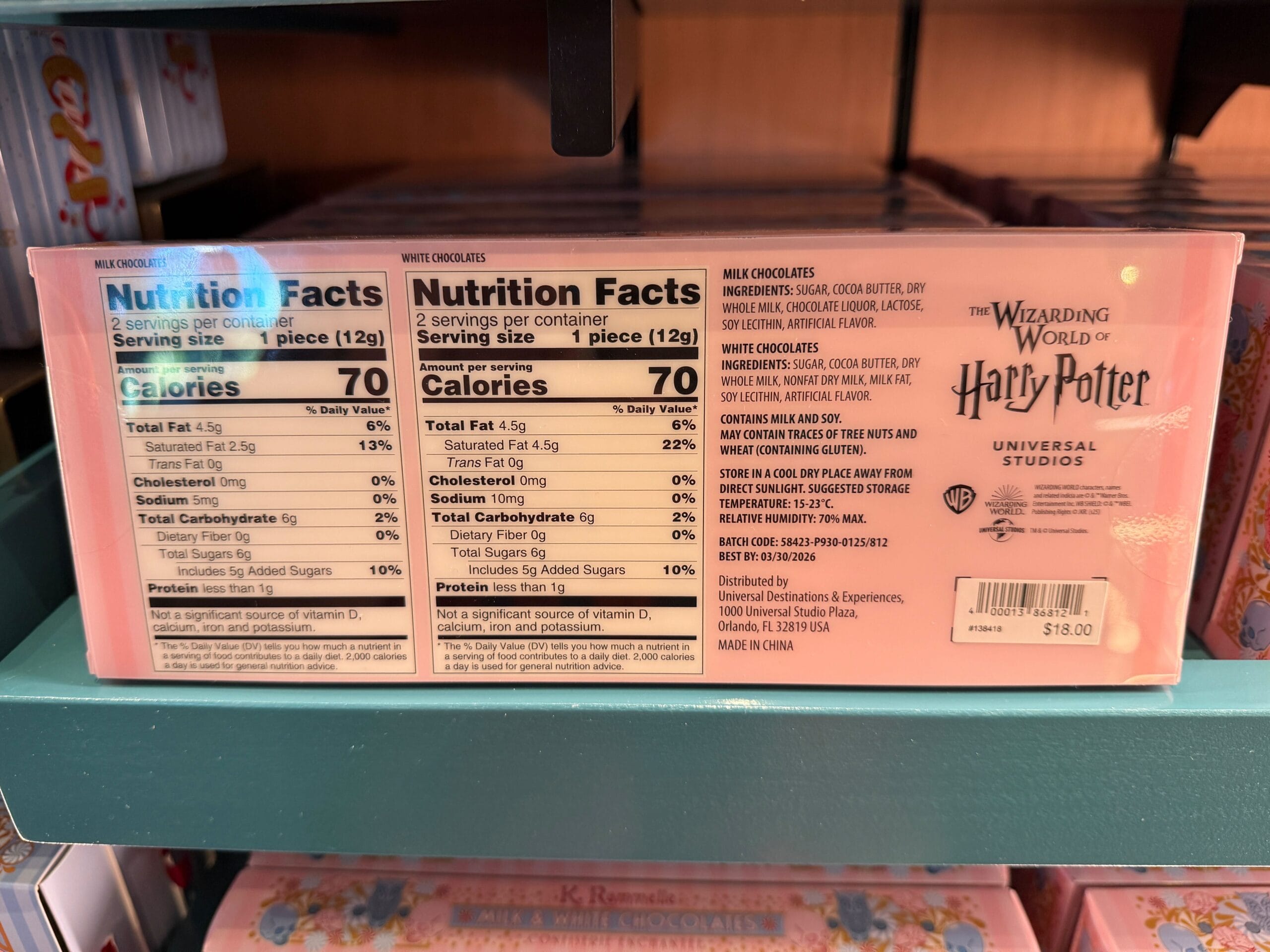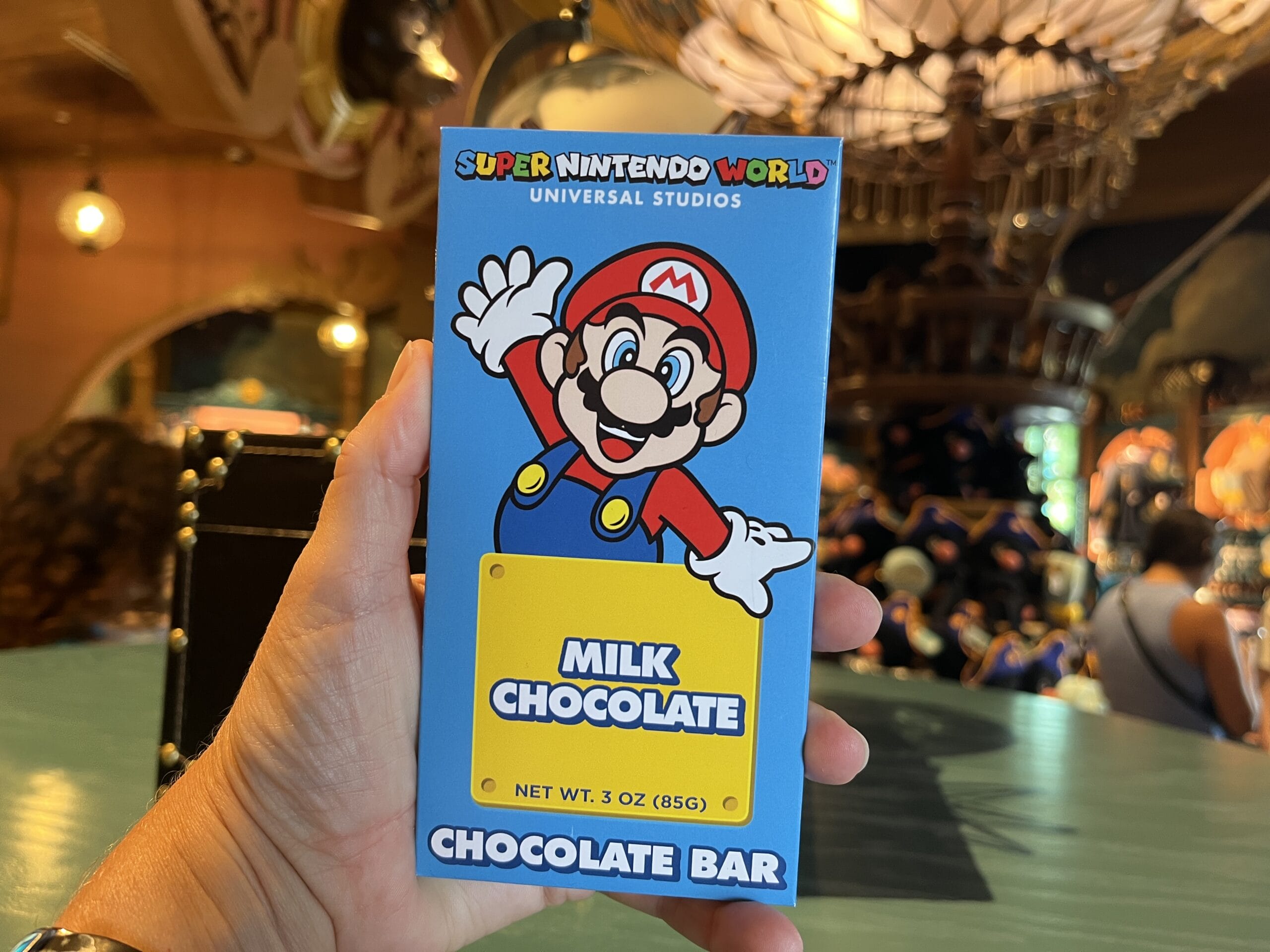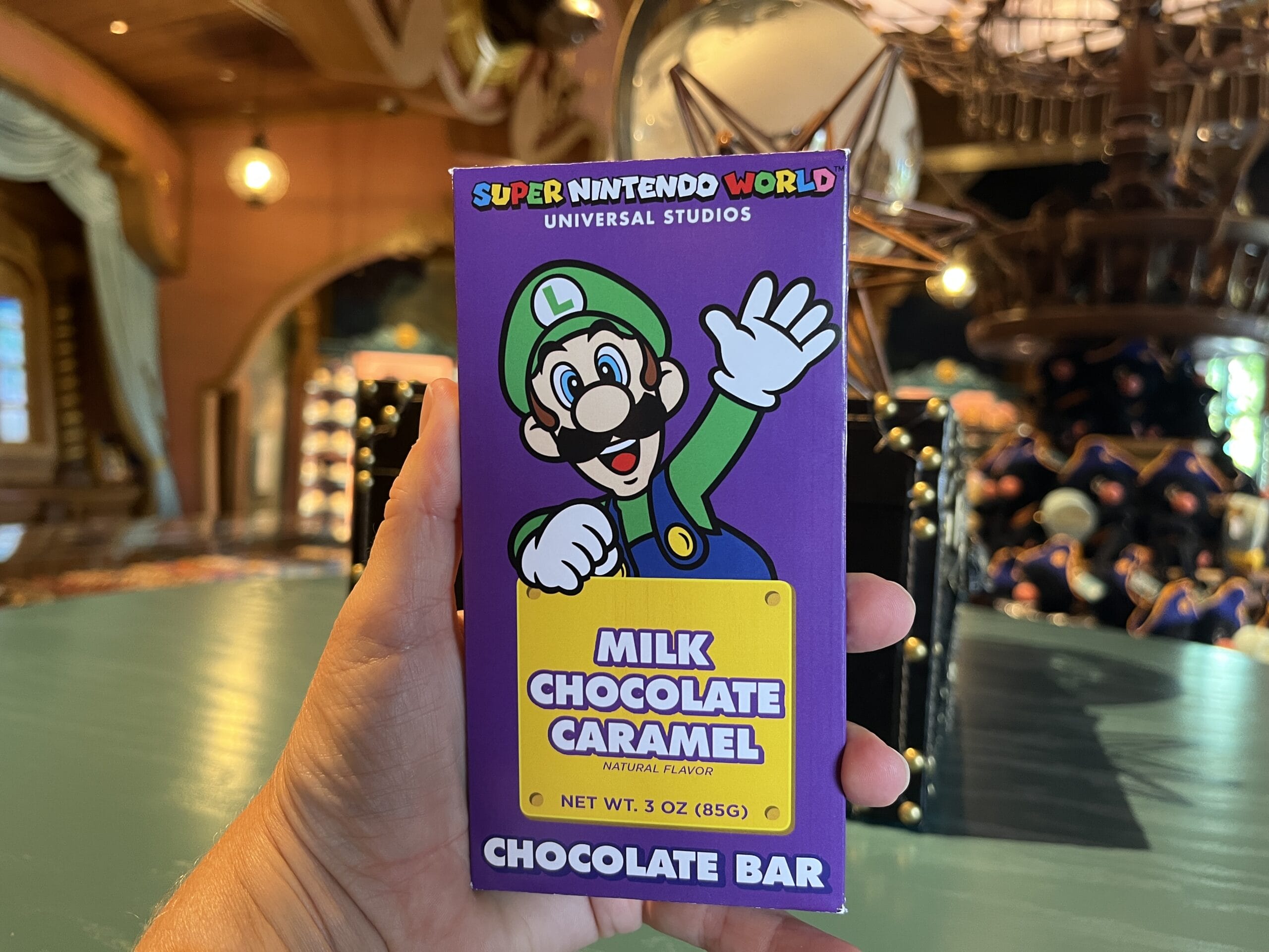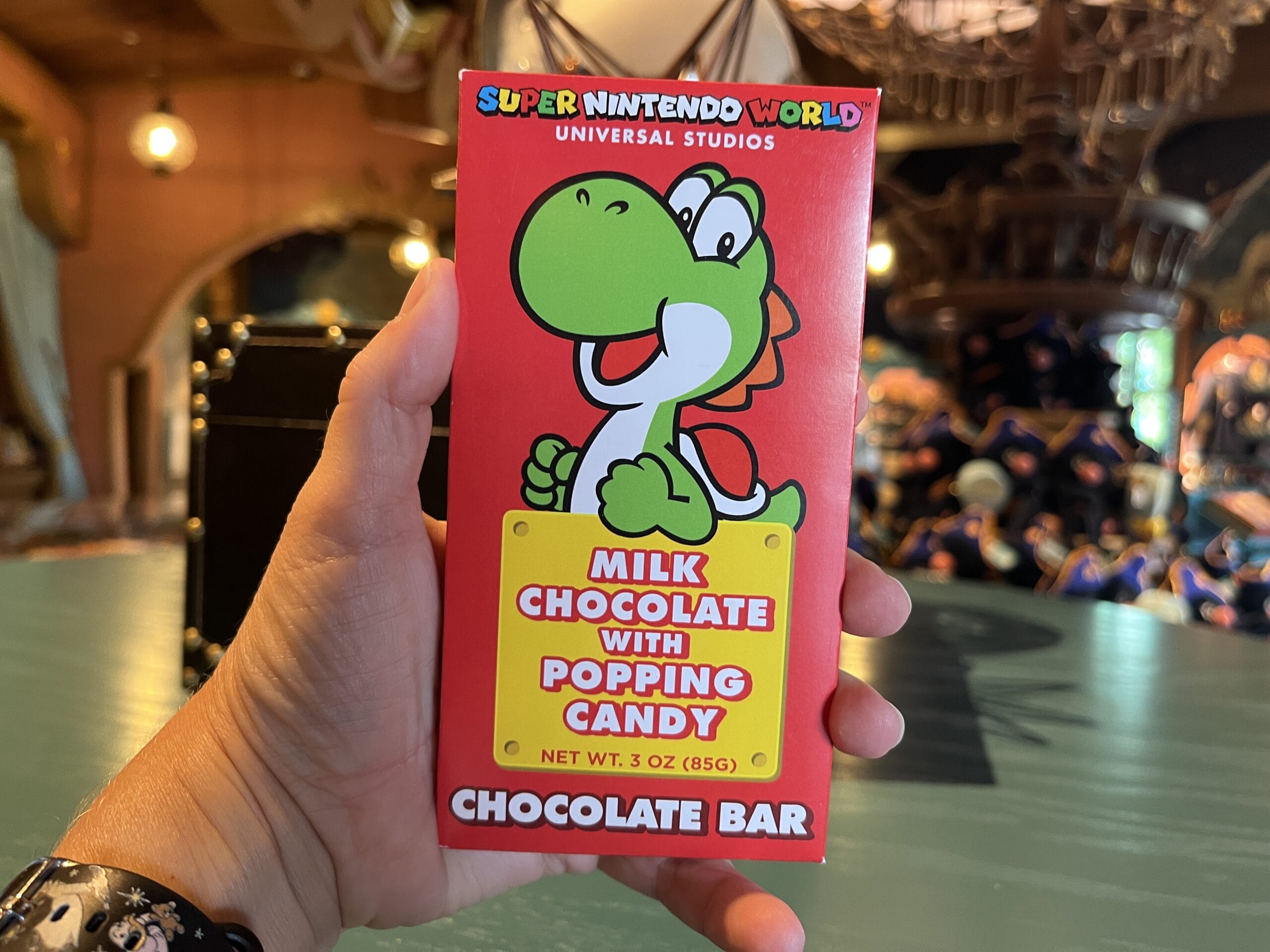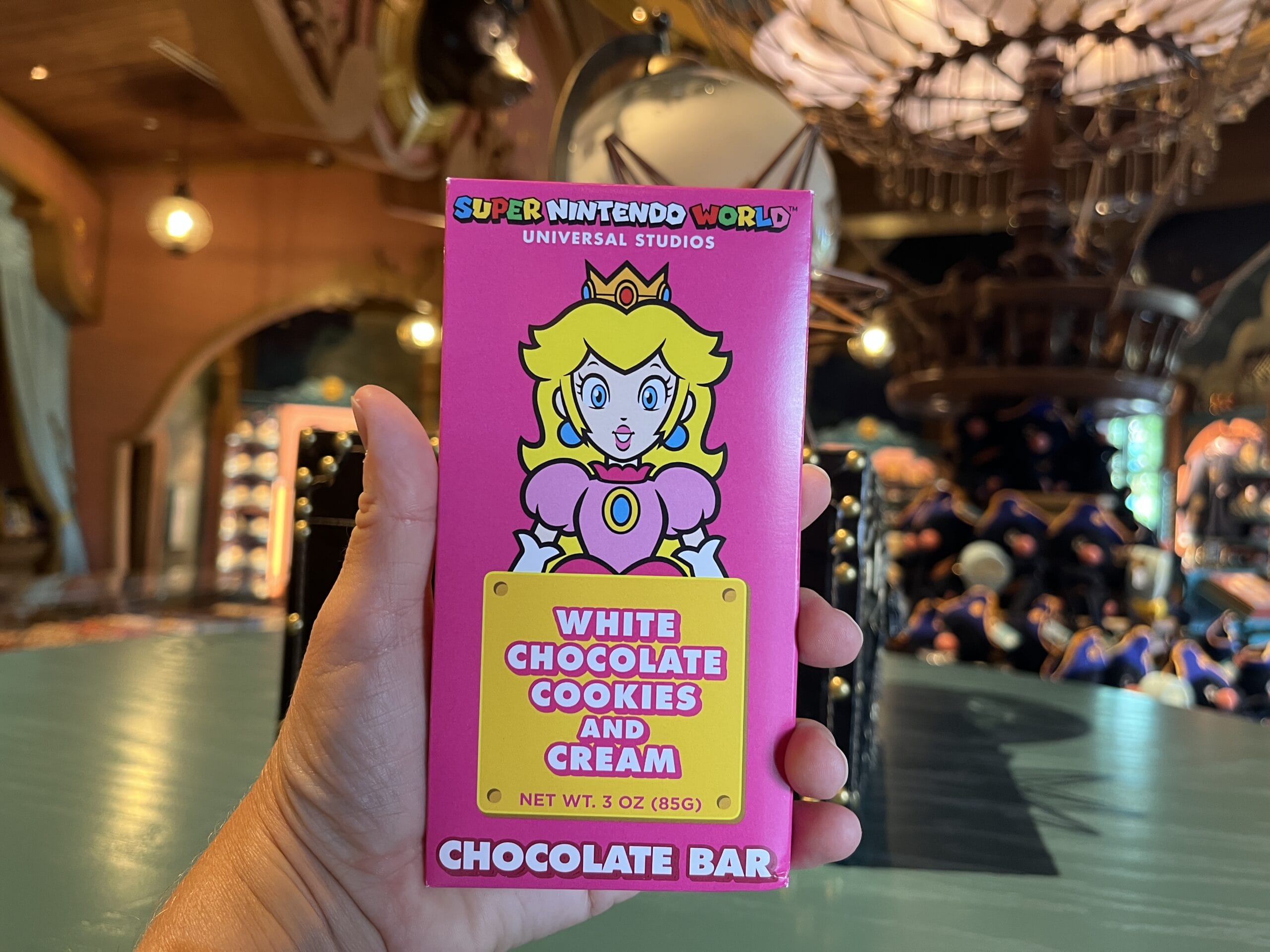 The Super Nintendo World chocolate bars come in four different flavors: milk chocolate, milk chocolate caramel, white chocolate cookies and cream, and milk chocolate with popping candy.