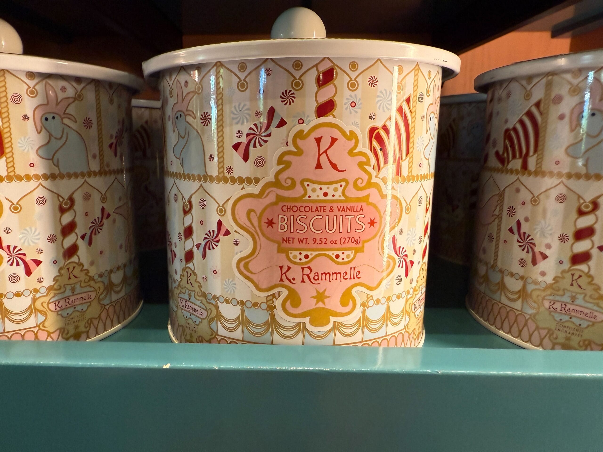 This tin of chocolate and vanilla biscuits has the whimsical candy shop design found on other K. Rammelle-branded products. The lid has red banners and stripes which lead to the center knob. There are 27 cookies.