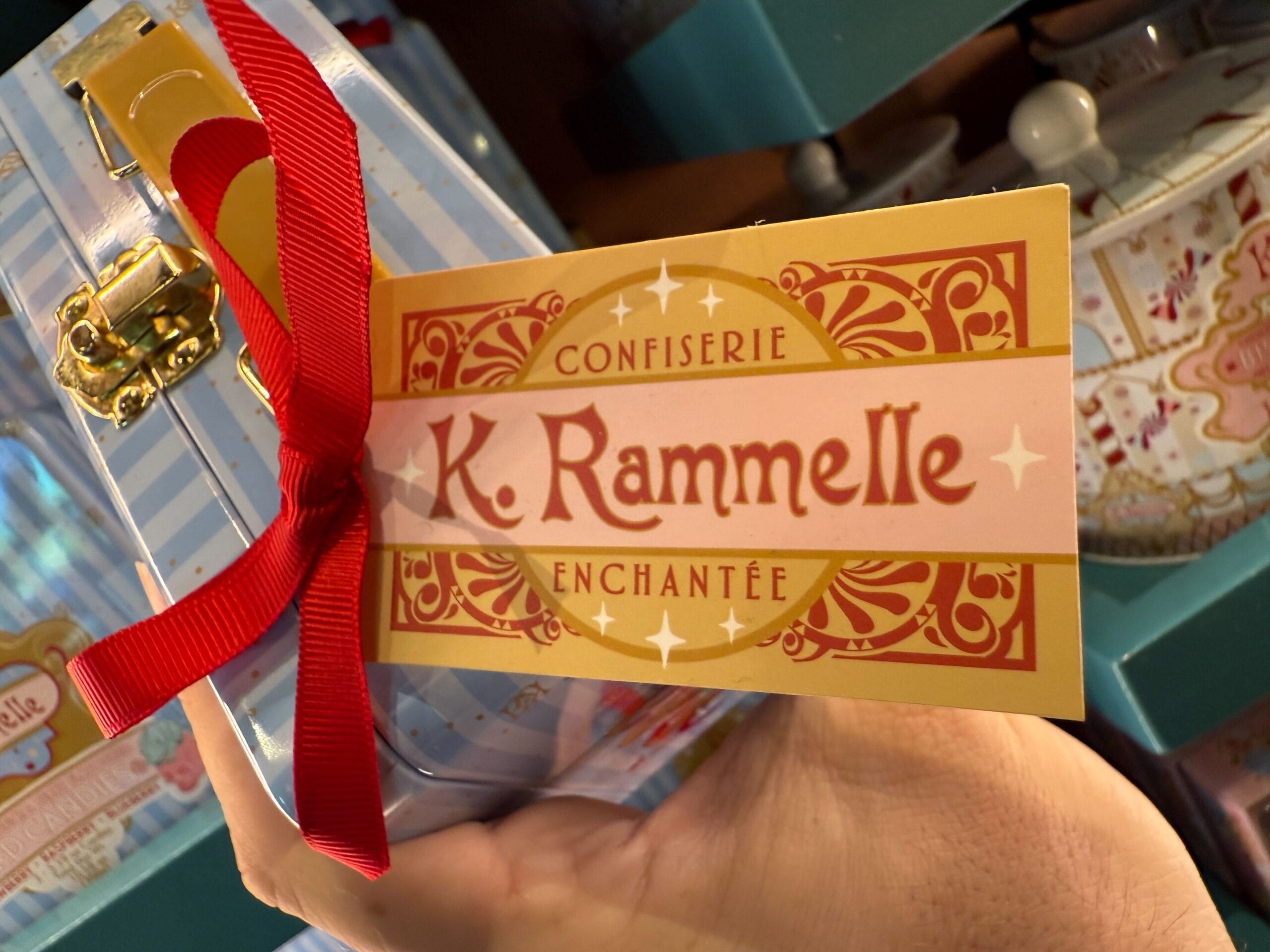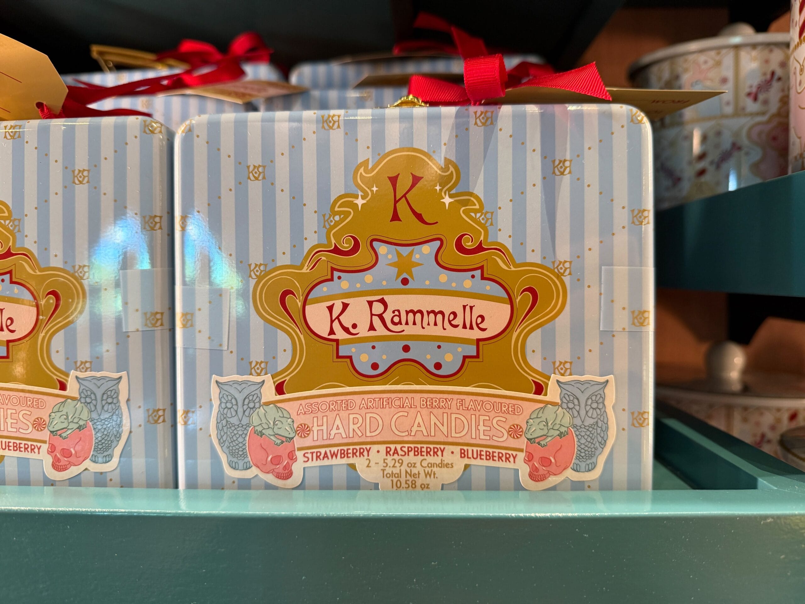 The blue striped tin box has berry-flavored hard candies: strawberry, raspberry, and blueberry. A beautiful tag and red ribbon adorn the top of the tin. The K. Rammelle logo sits in the middle.