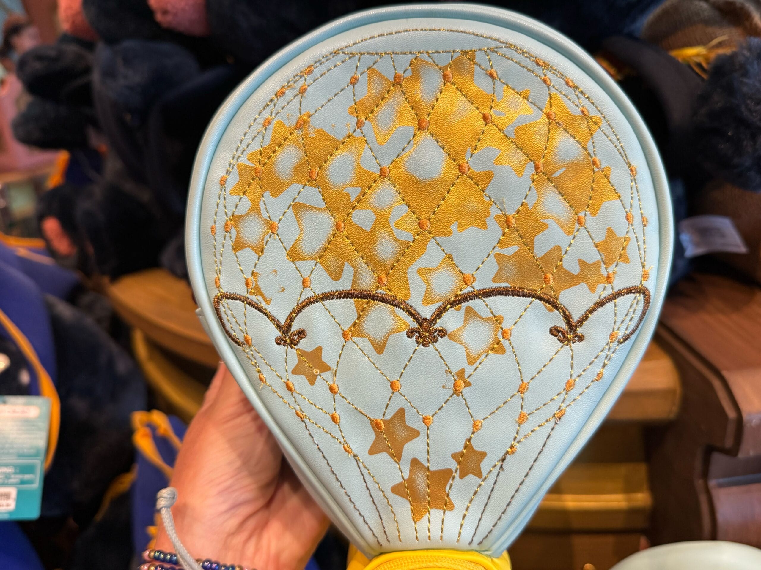 This pale blue crossbody bag is in the shape of a marshmallow airship, the moonship.