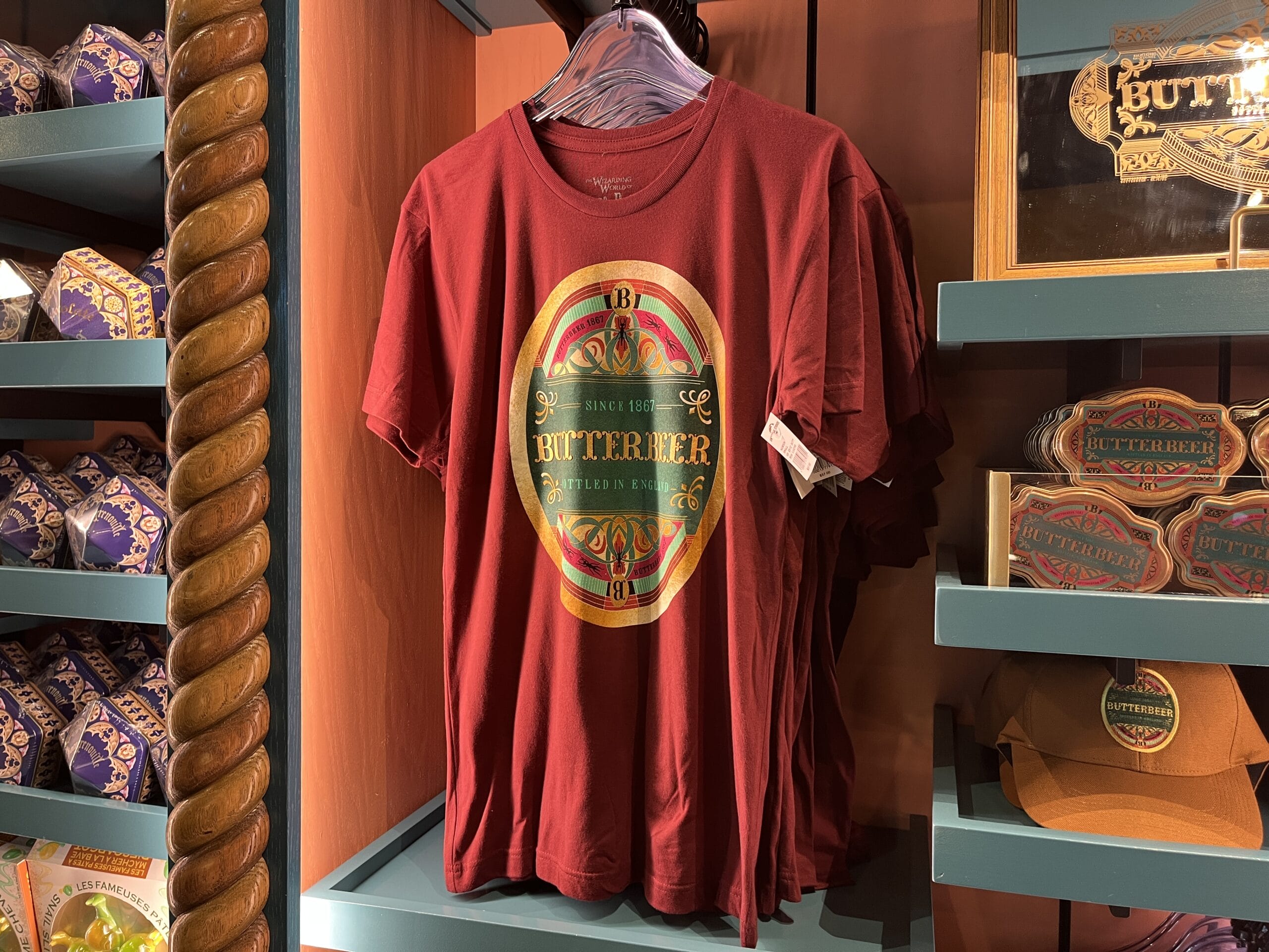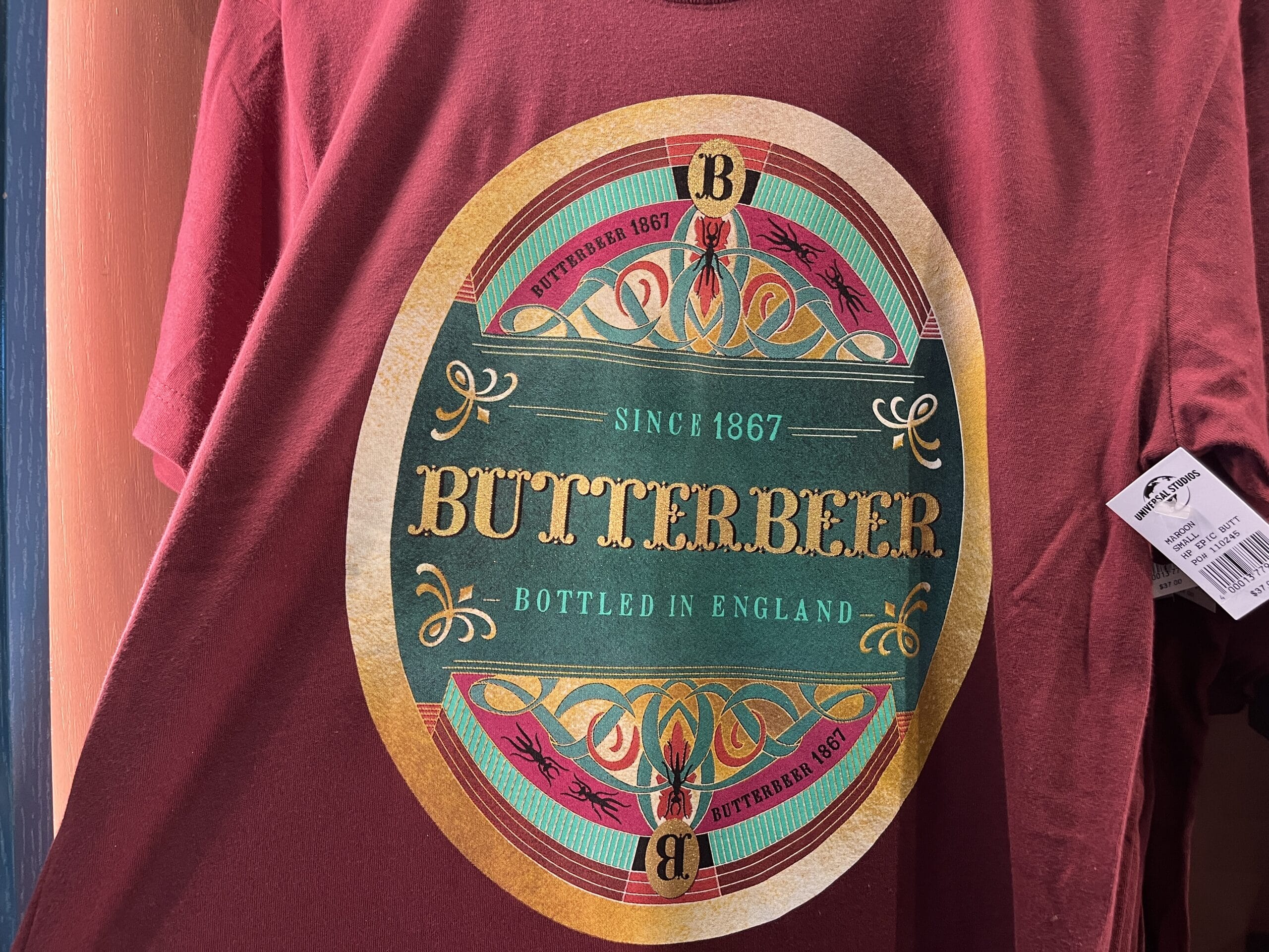 The red Butterbeer t-shirt is short-sleeved with the Butterbeer logo in gold, magenta, teal, and green colors.
