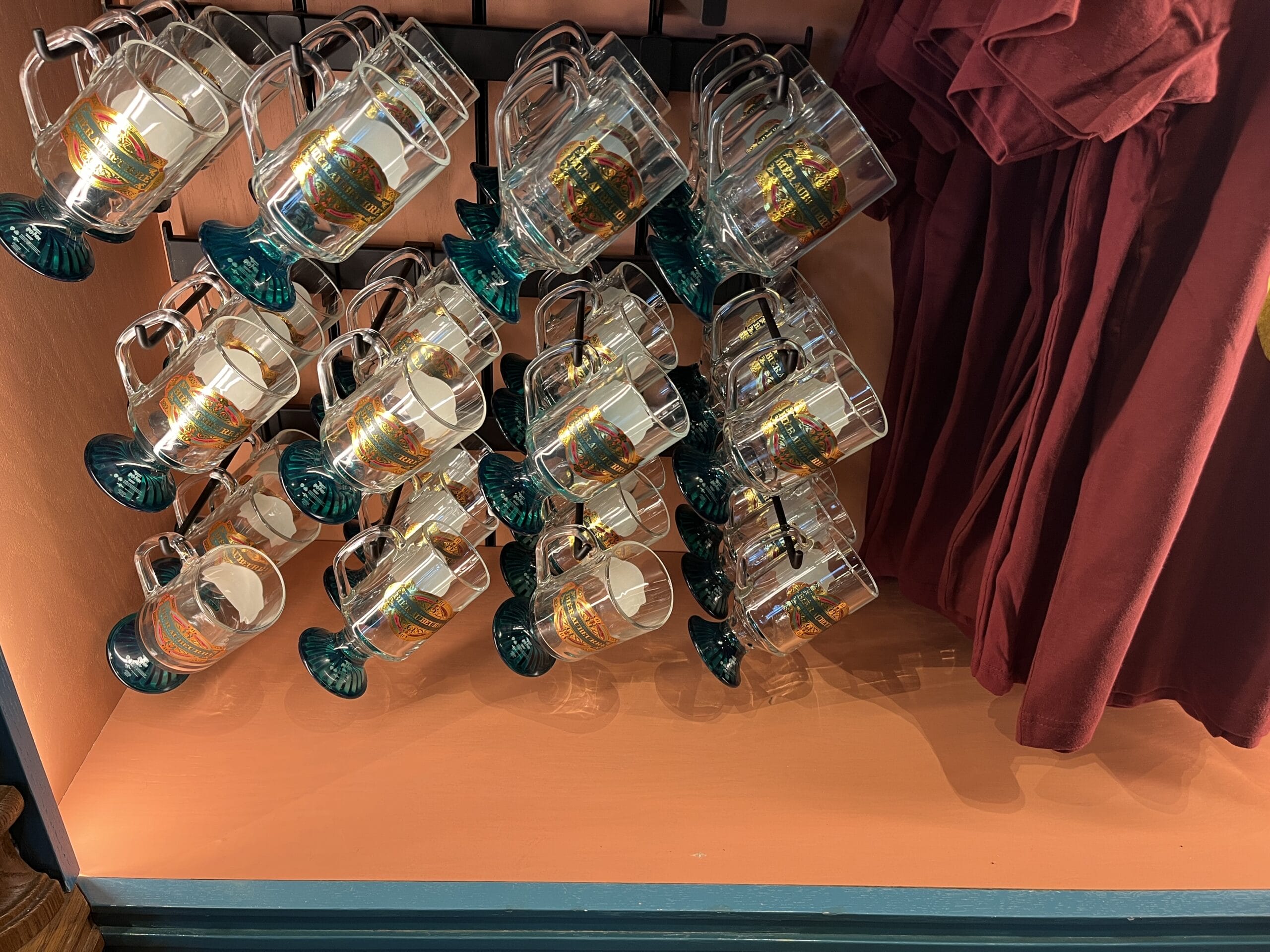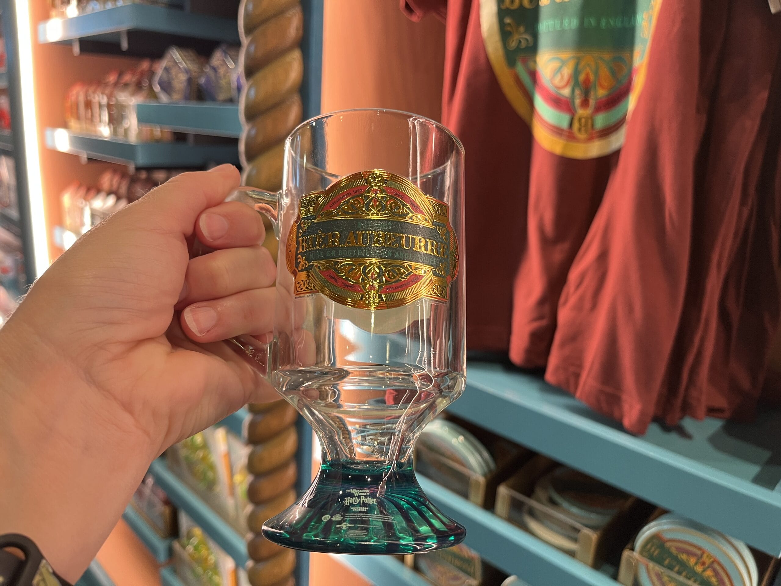 There is also a stemmed glass mug, which is clear with the Butterbeer logo. The base is dark teal.