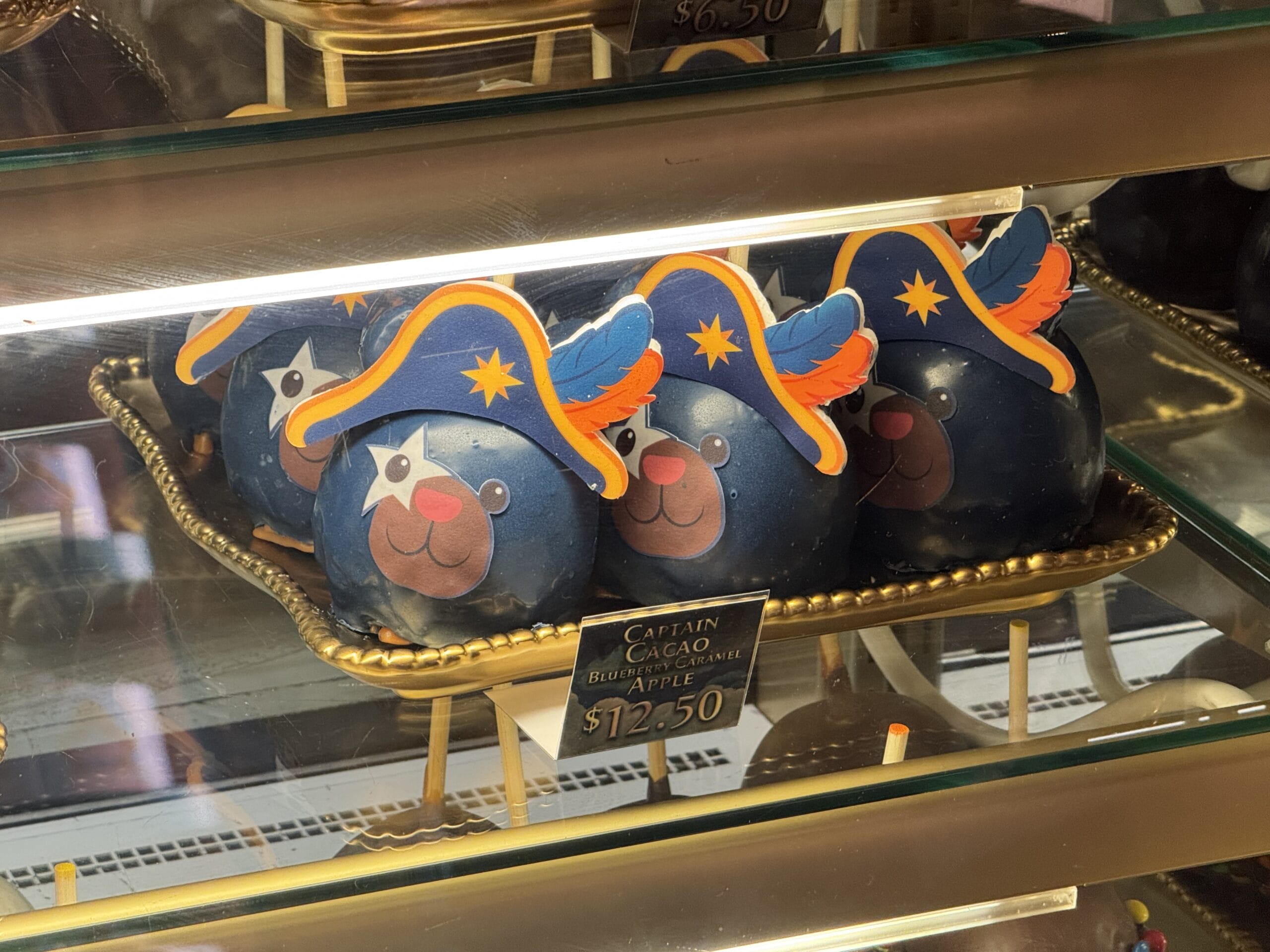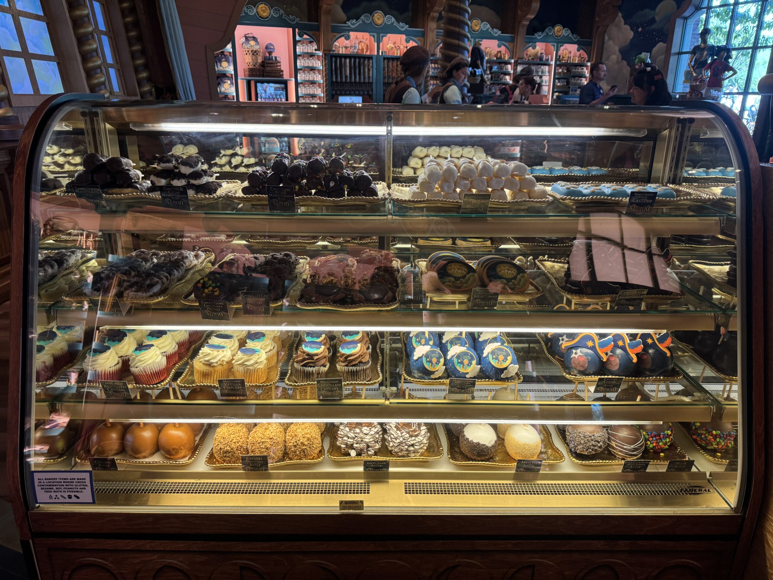 Various confectioneries are located inside a display case, including marshmallow pops, cookies ($6.50), gourmet pretzels ($6), cupcakes ($8), and candy apples ($10 – $12.50).