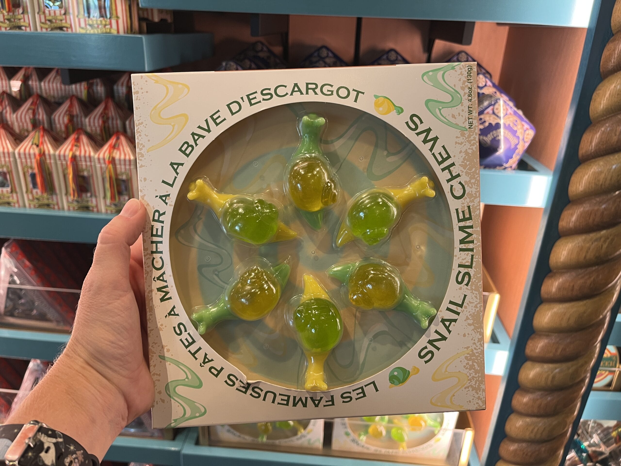 Six snail slime chews come in a white box with clear plastic so you can see them.