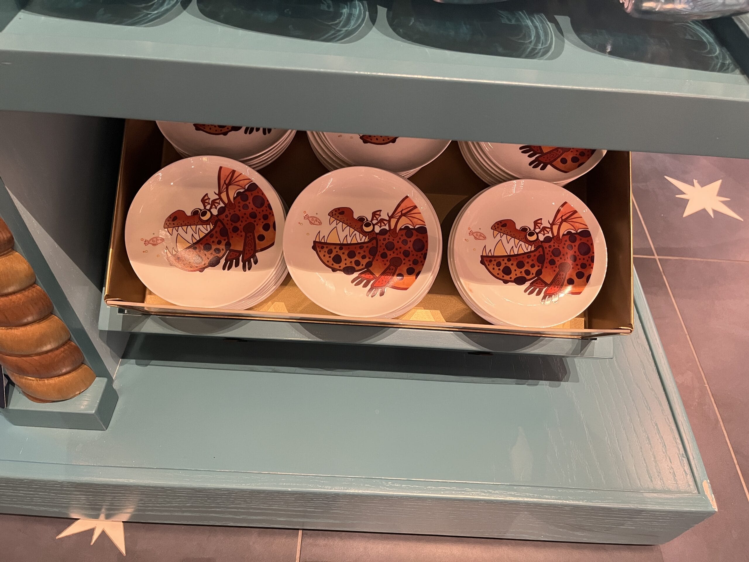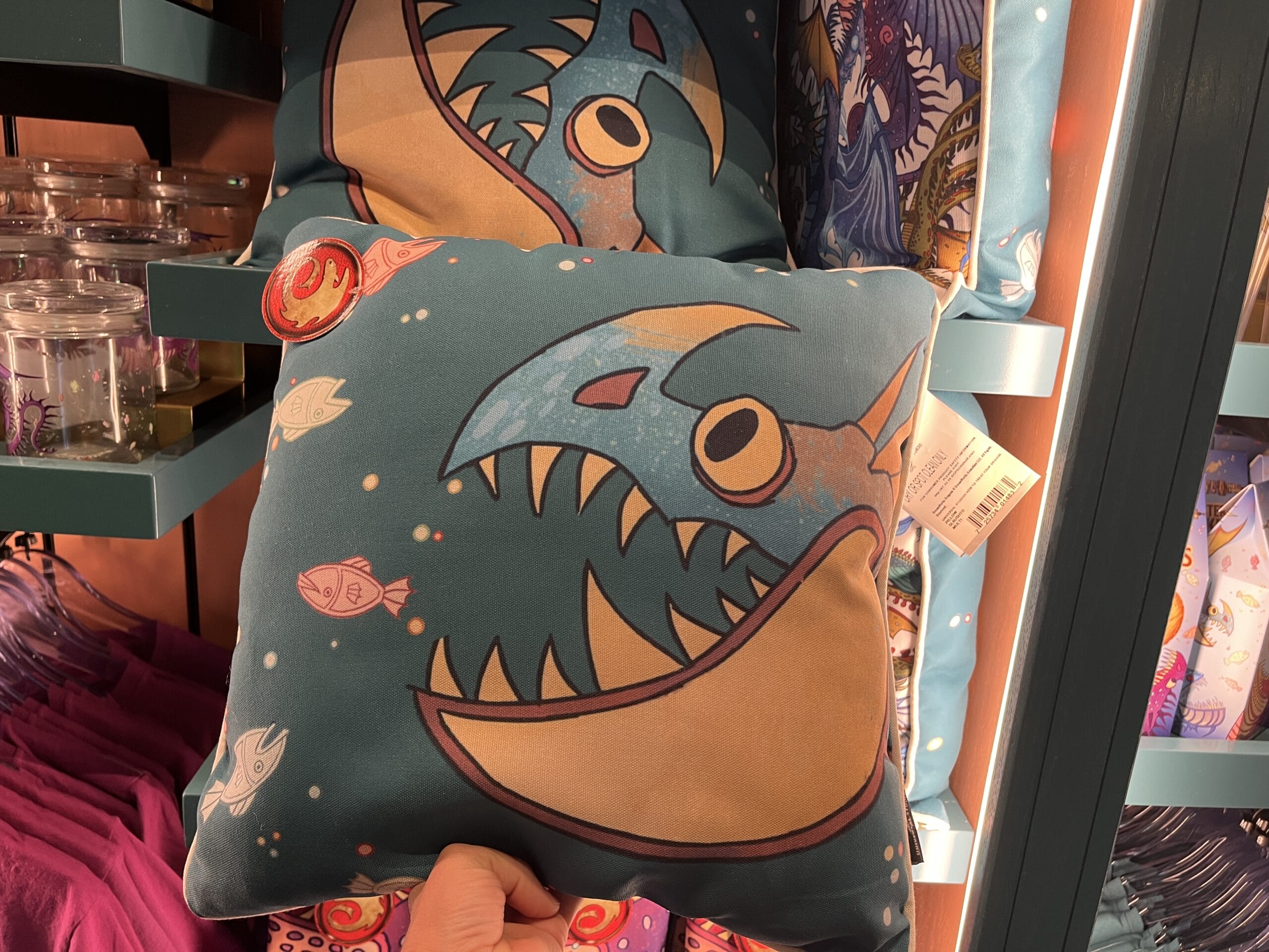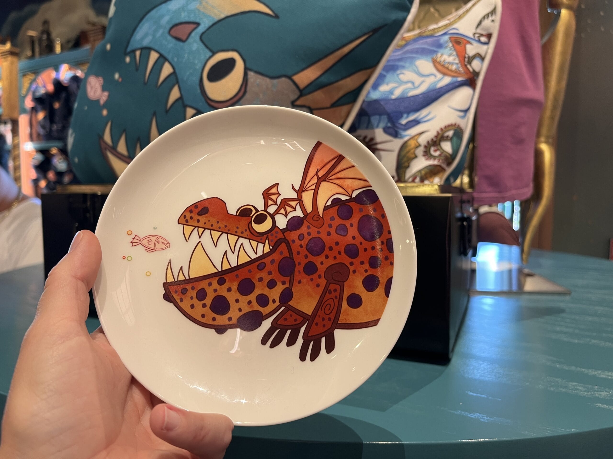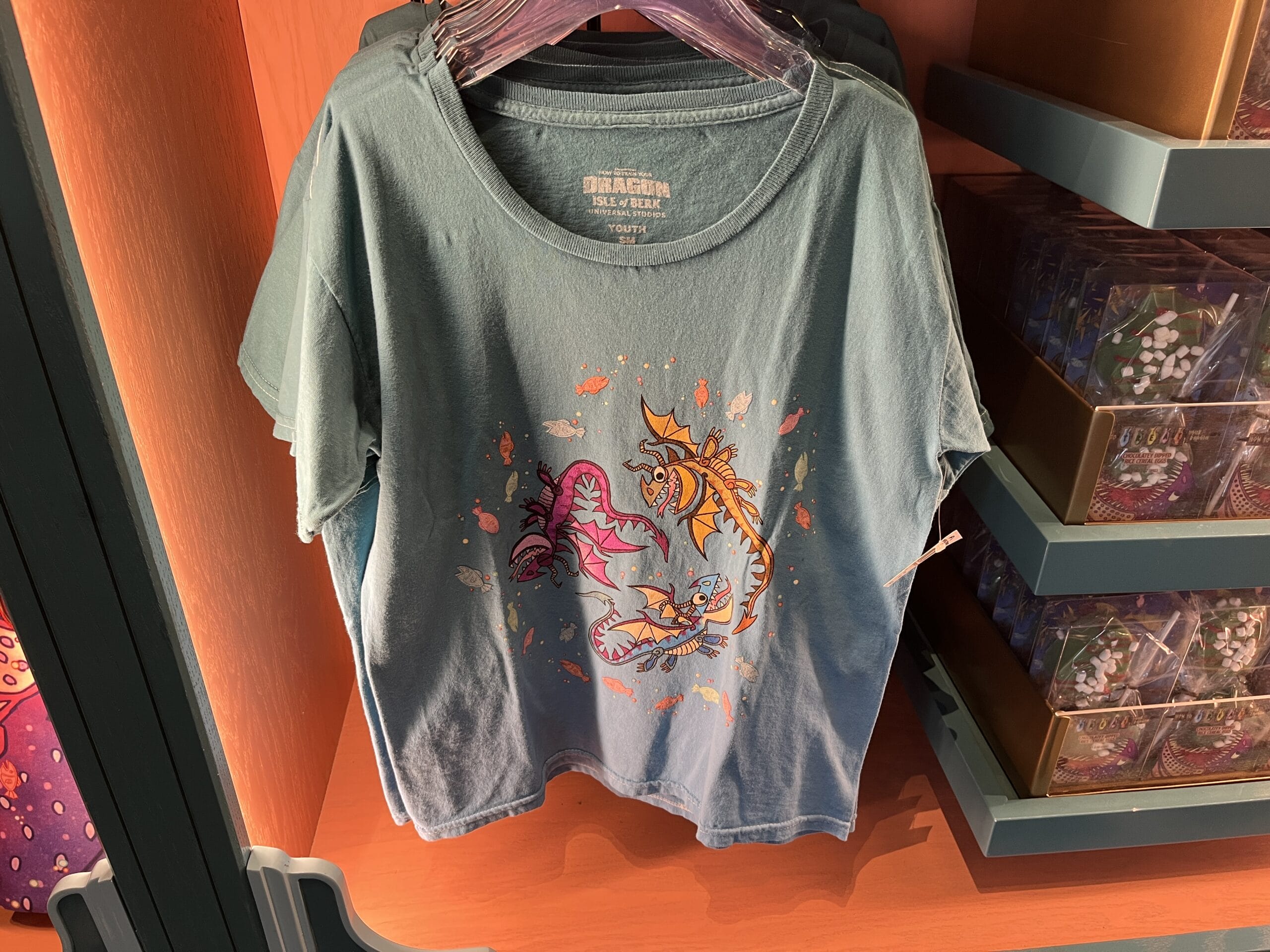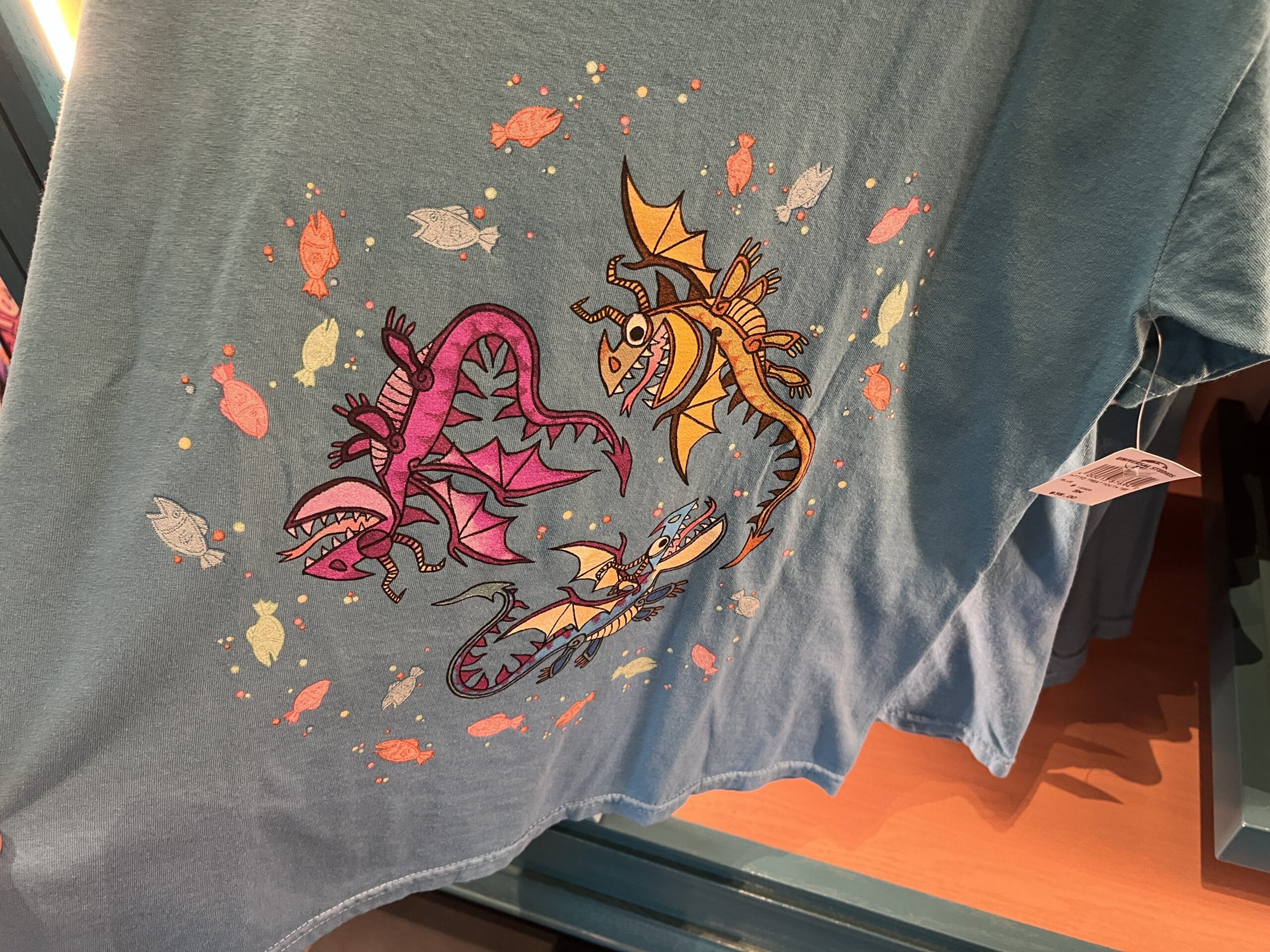 This scoope-style t-shirt is a bluish gray color. On the front, there are three sea creatures surrounded by multiple fish. The back also reads, “How to treat your dragon.” The general color palette is yellow, bright pink, and coral.