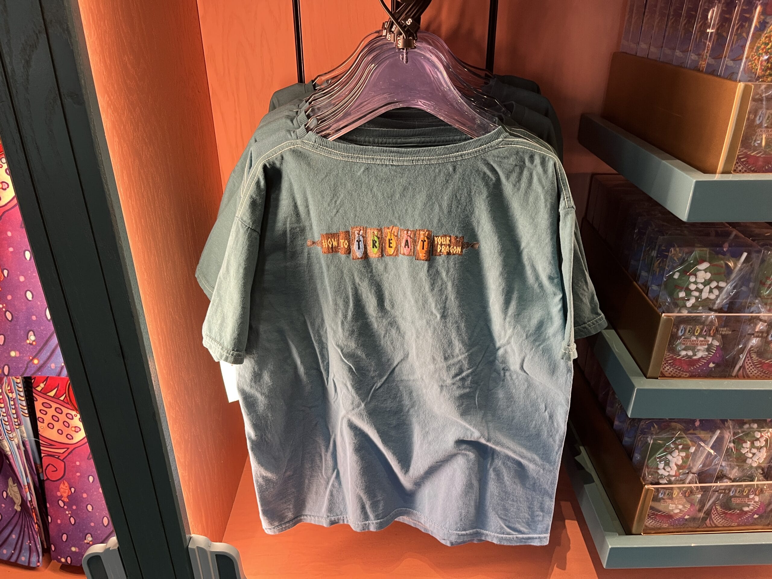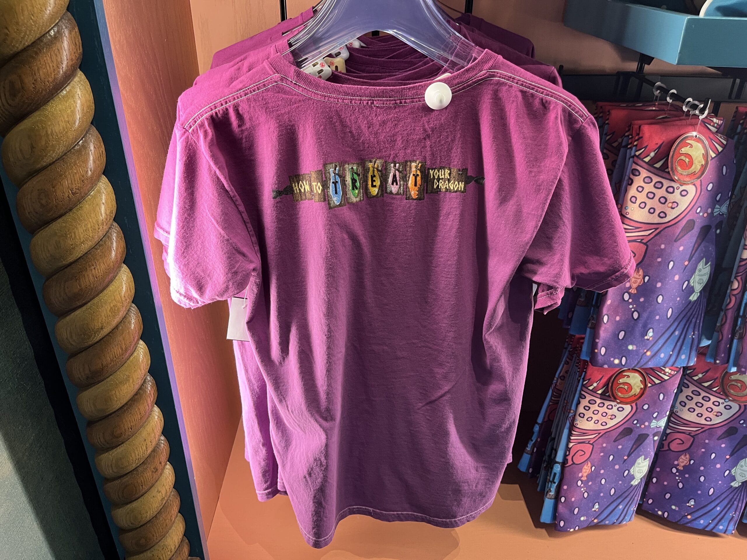 This purple short-sleeve t-shirt has a crew neck. The front has an image of a blue and yellow dragon eating pink, white, yellow, and blue fish. The back reads, “How to treat your dragon,” a nod to the store in Isle of Berk.