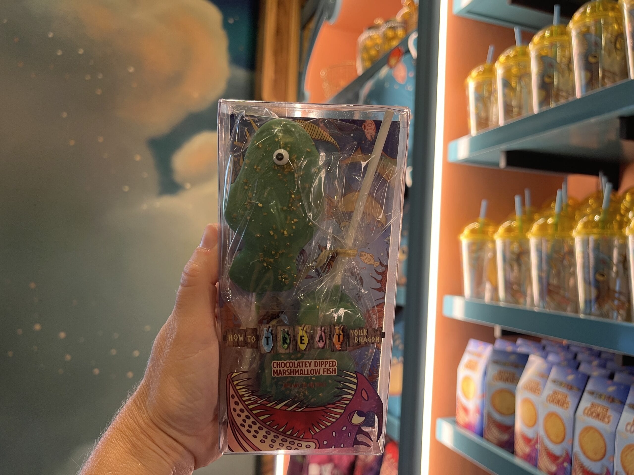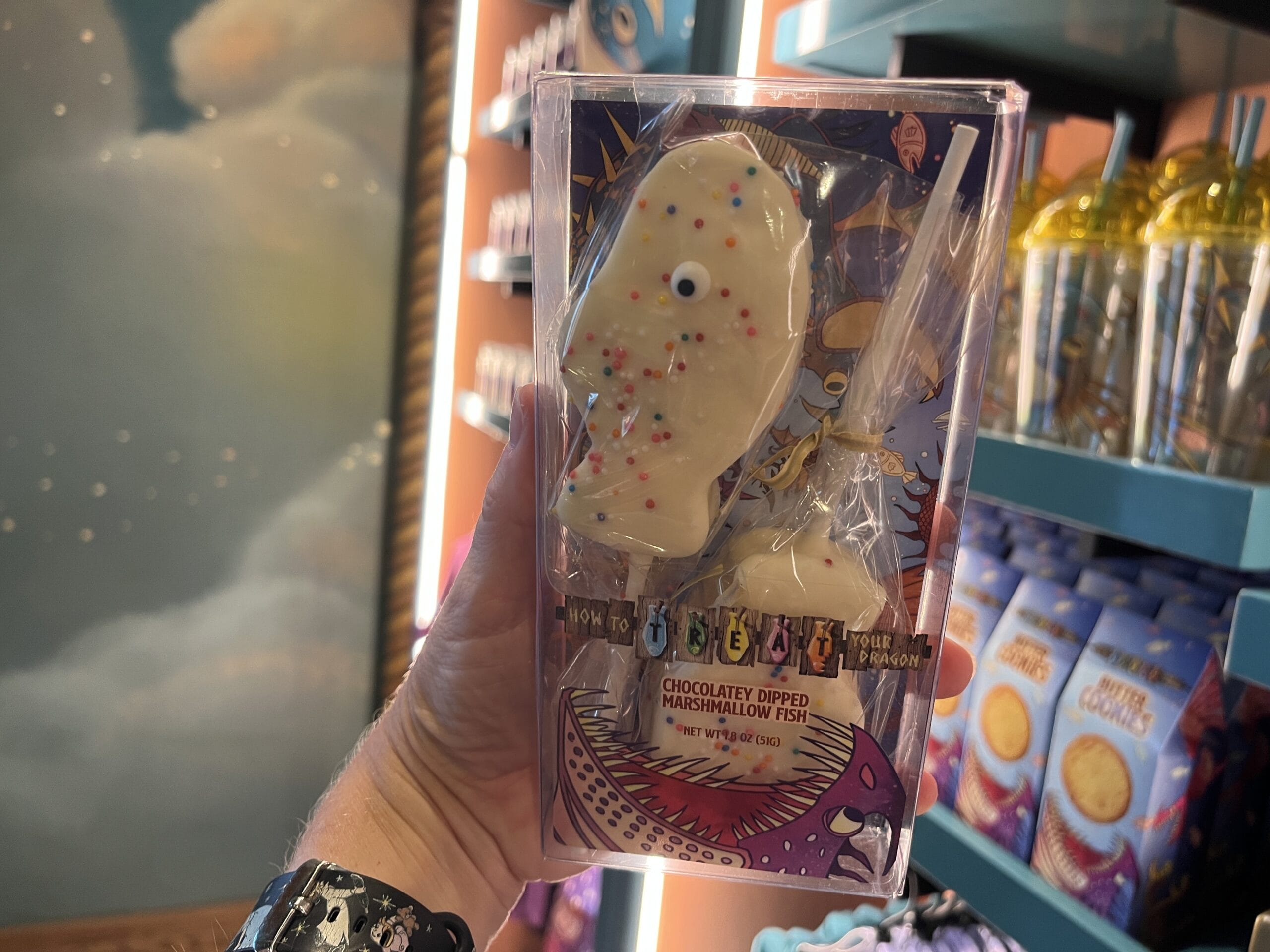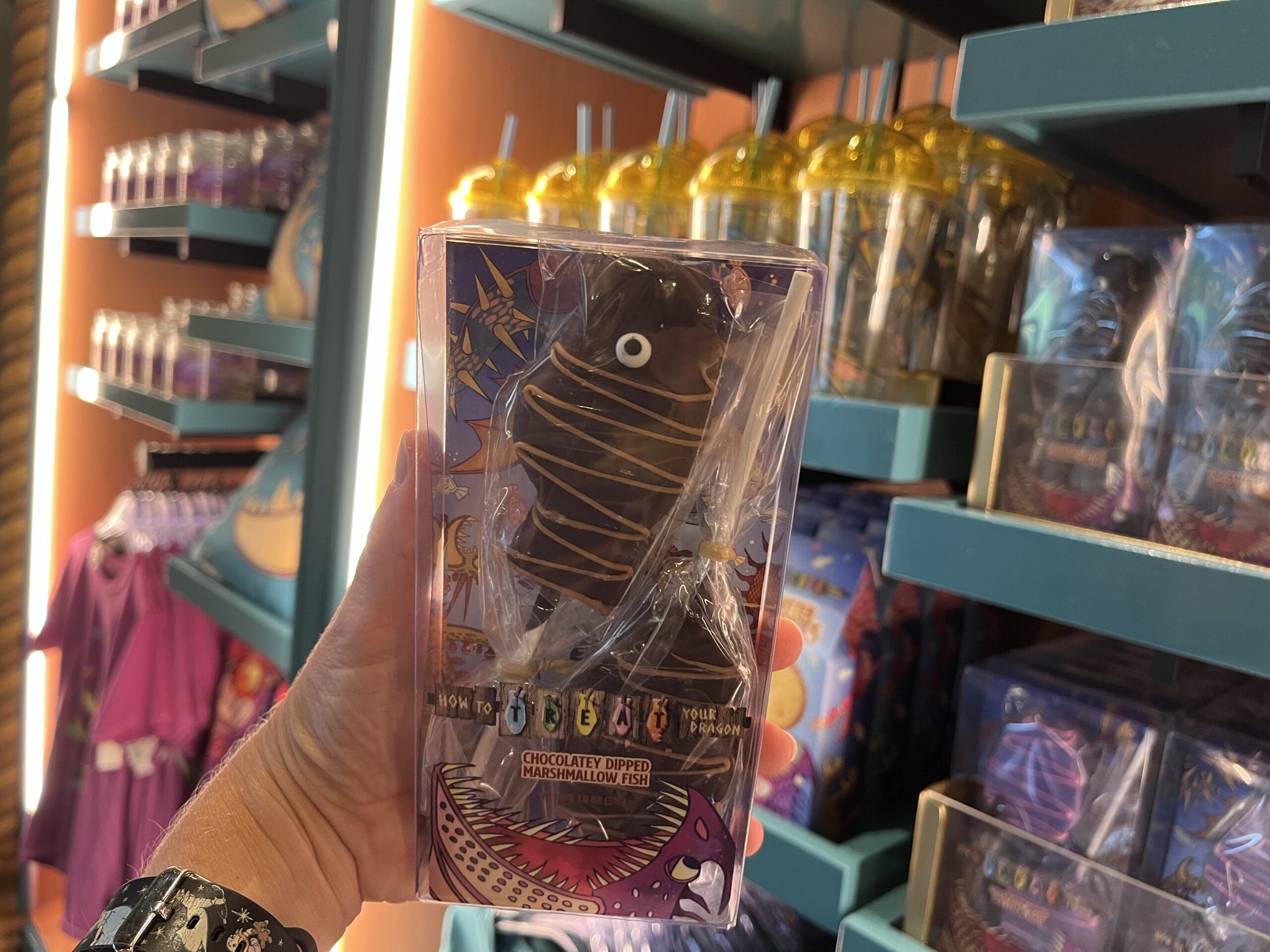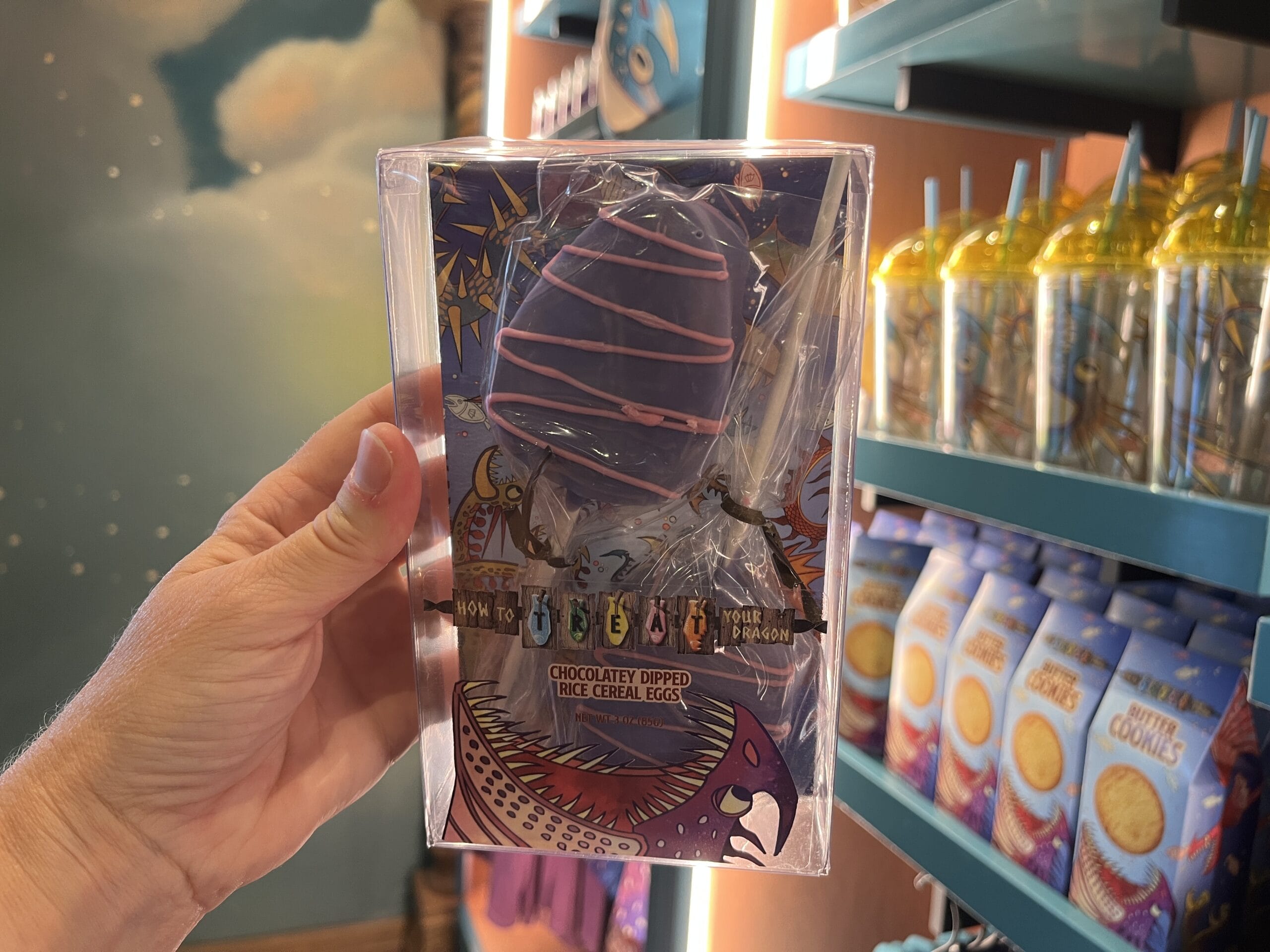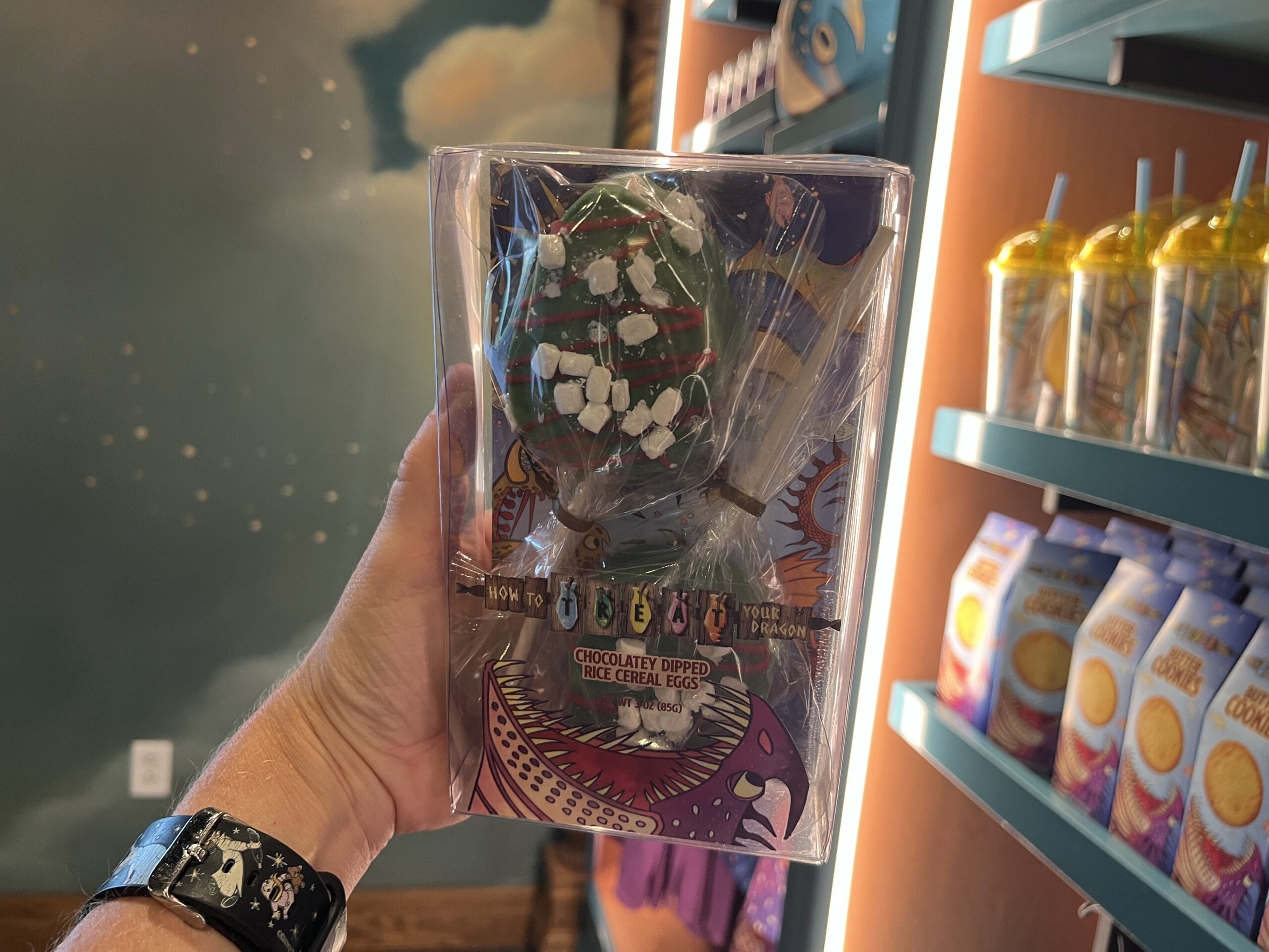 Rice cereal dragon eggs that are dipped in chocolate are also available. There are three different colors/designs: purple with pink stripes, rainbow sprinkles, and green with marshmallows and red stripes.