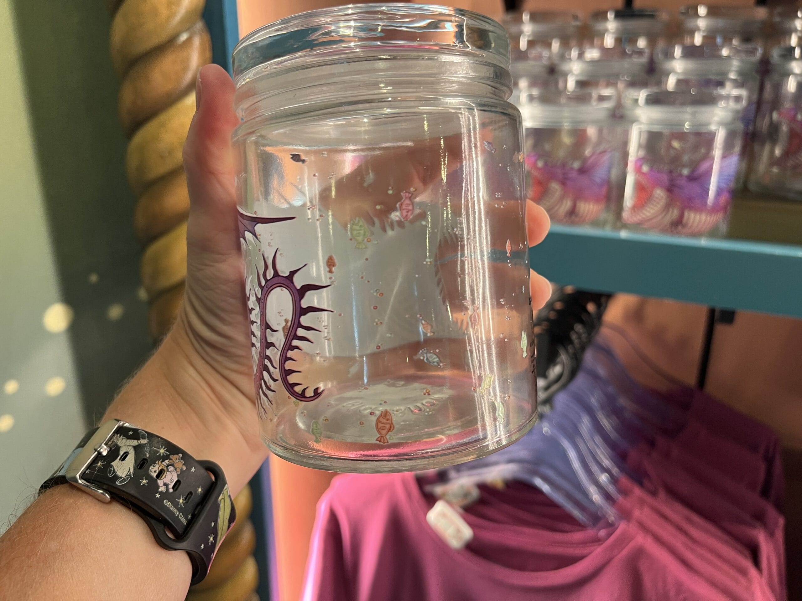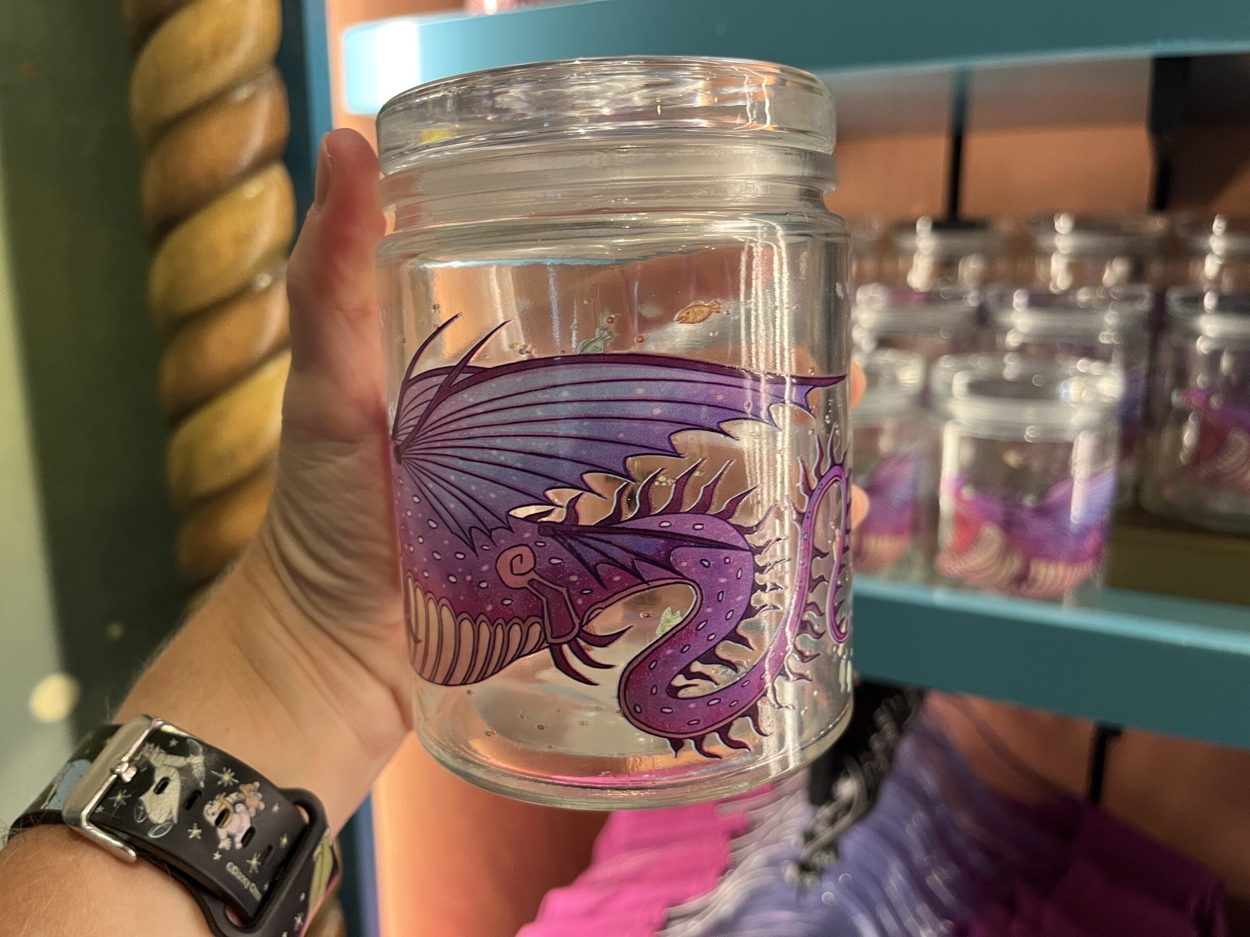 A purple dragon wraps around most of this clear glass jar. His mouth is open wide for a fish. The flat lid screws on the jar.