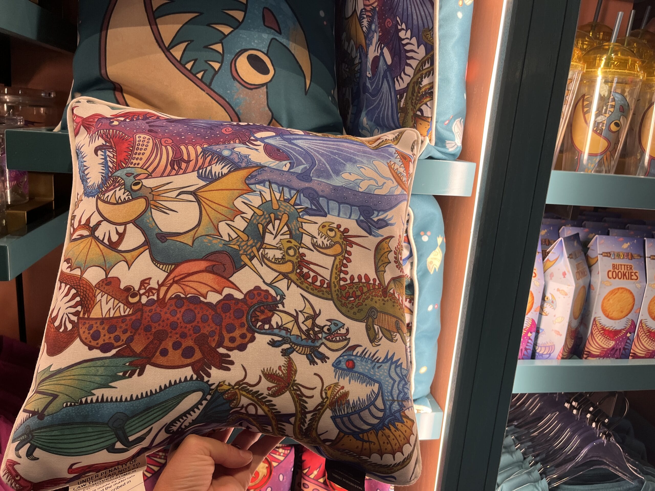 One side of the throw pillow is blue with a dragon eating small fish. The other side has several dragons overlapping each other in multiple colors.
