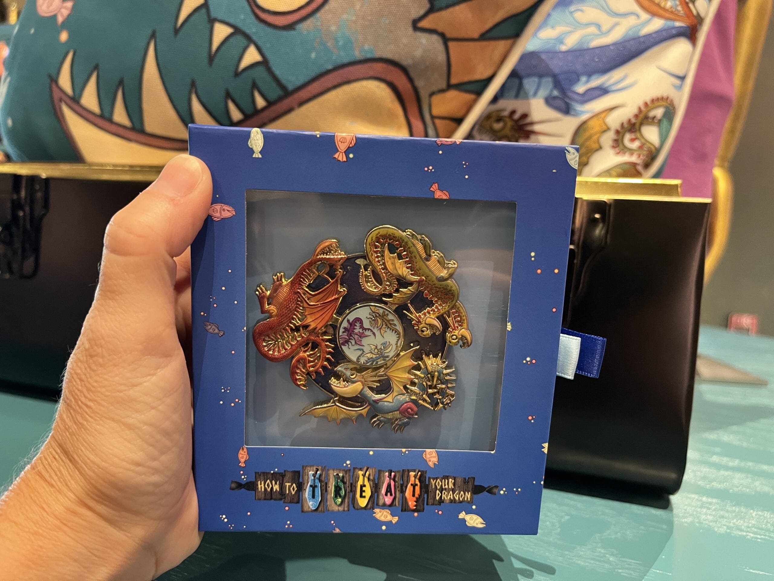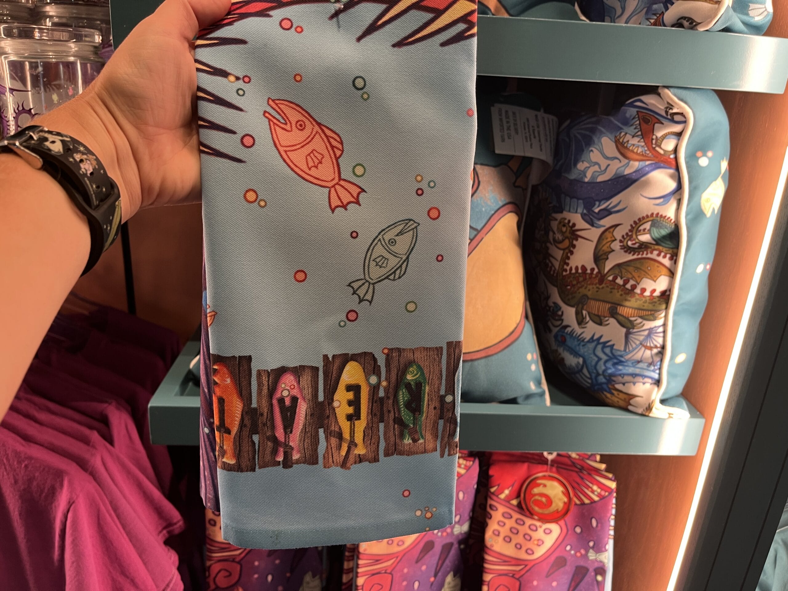 The tea towel is purple on one side with a pink dragon and small fish. The other side is blue with more fish and “How to treat your dragon” on the top.