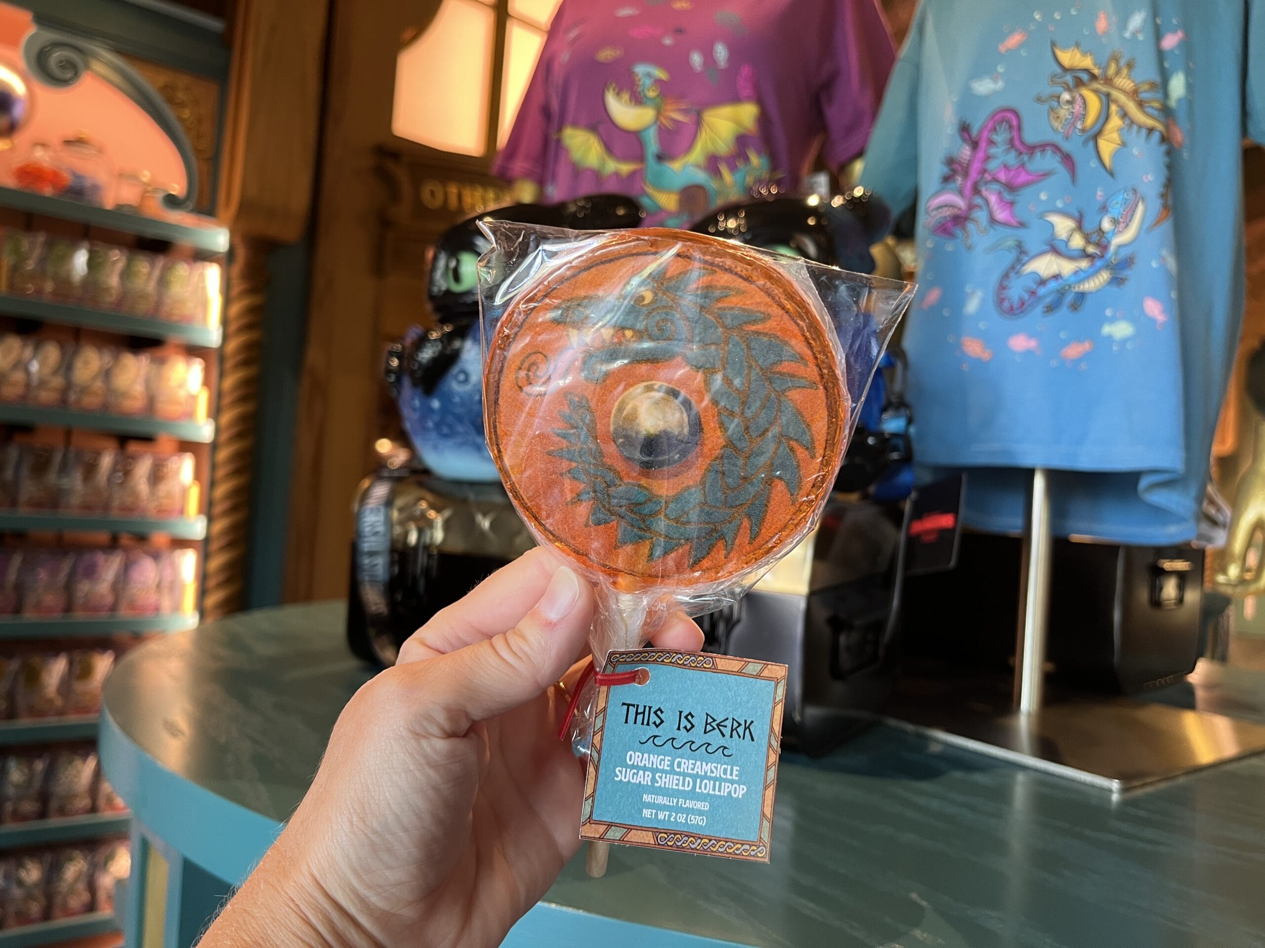 Orange, blue, and green lollipops are available. They are all the same flavor, but they do vary in color and design. They each have a dragon on them.