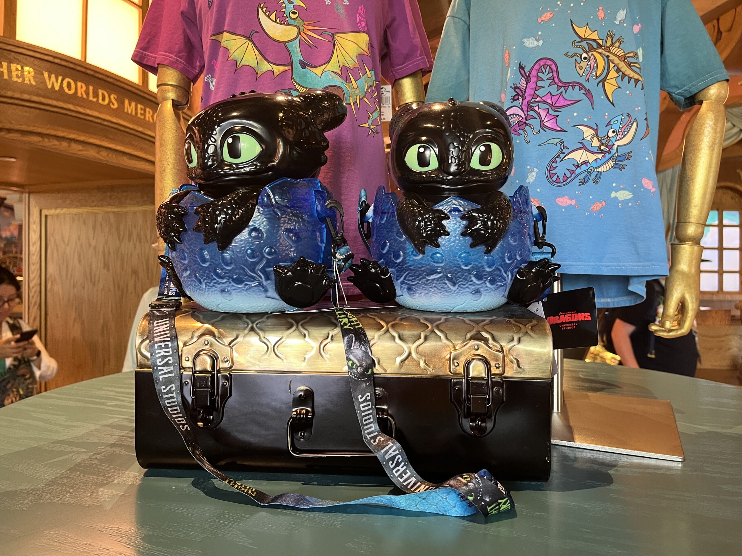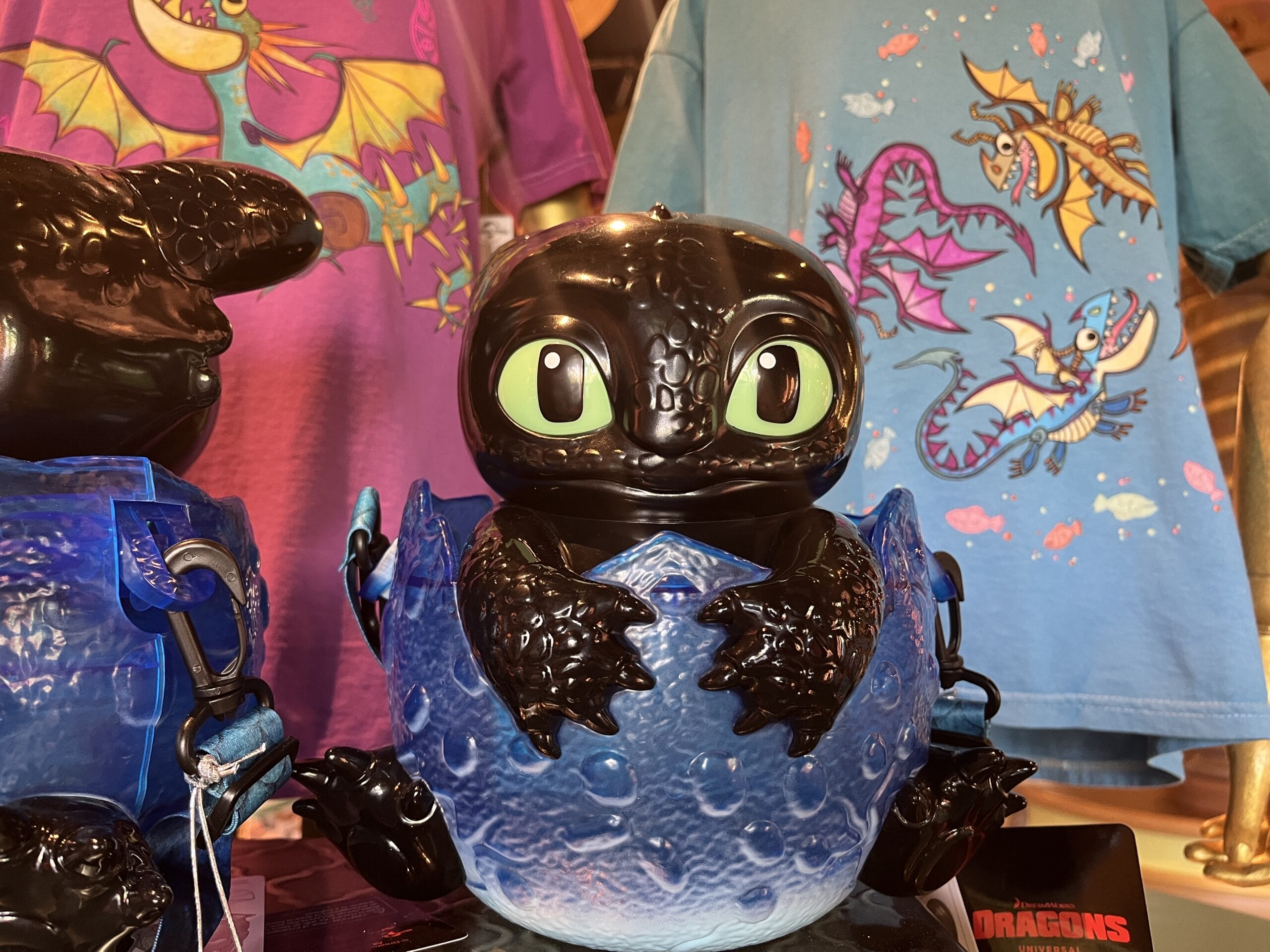 Grab this Baby Toothless popcorn bucket. He just hatched out of his egg. His feet stick out of the bottom, and he’s holding on to the front of the egg. The strap makes it easy to carry the bucket around the park or at home.