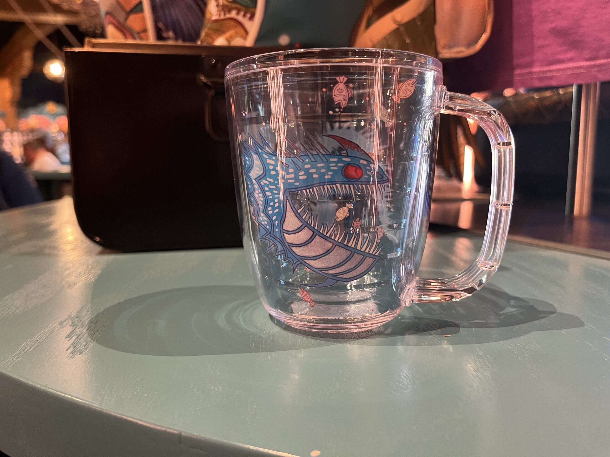 The glass cup has a blue dragon that wraps around the entirety of it. There is also a large handle.