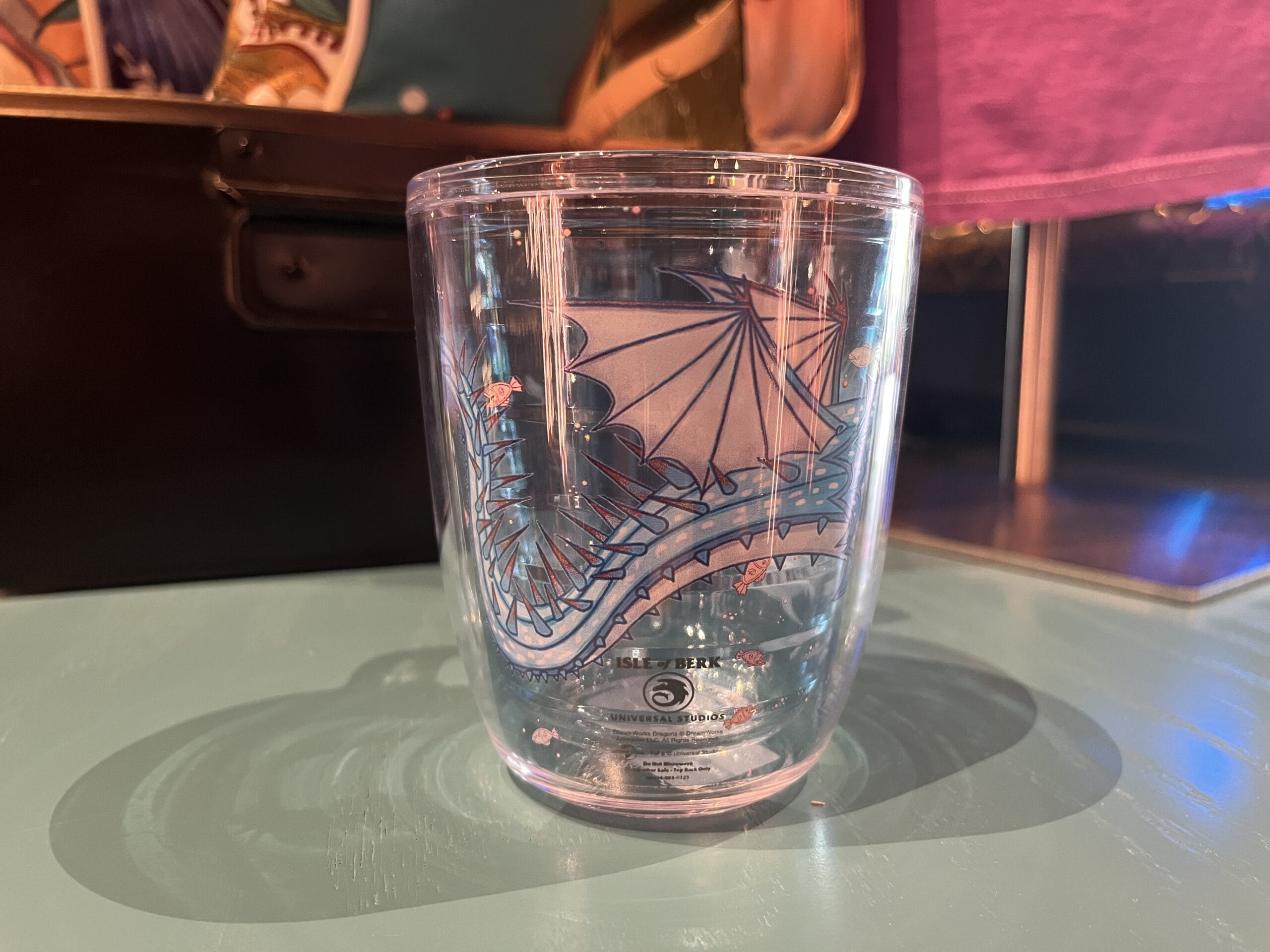The dragon dome tumbler is clear with a blue dragon. The lid is yellow and straw is blue. Be aware that it is hand wash only.