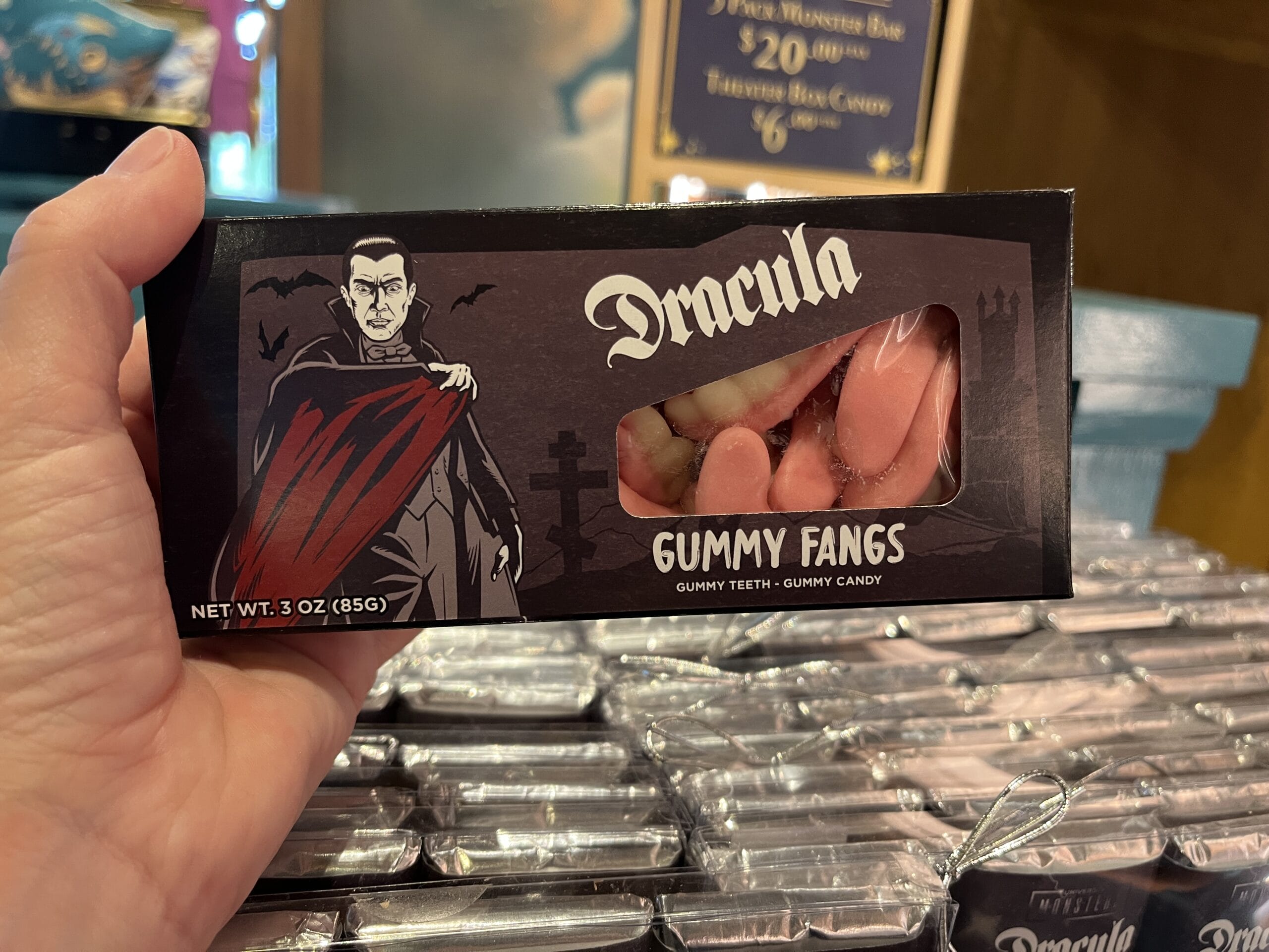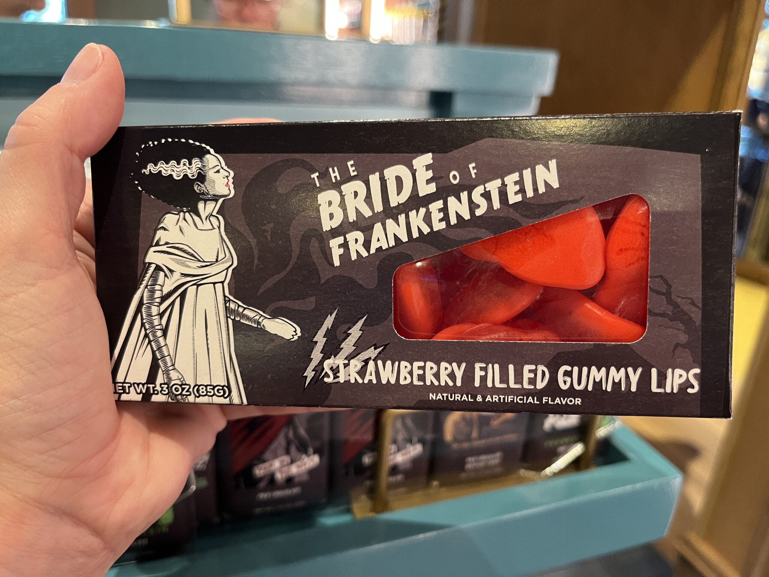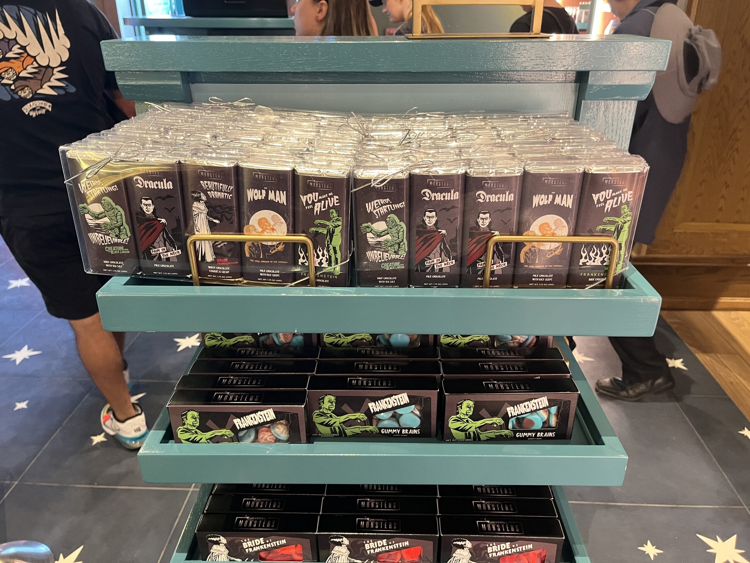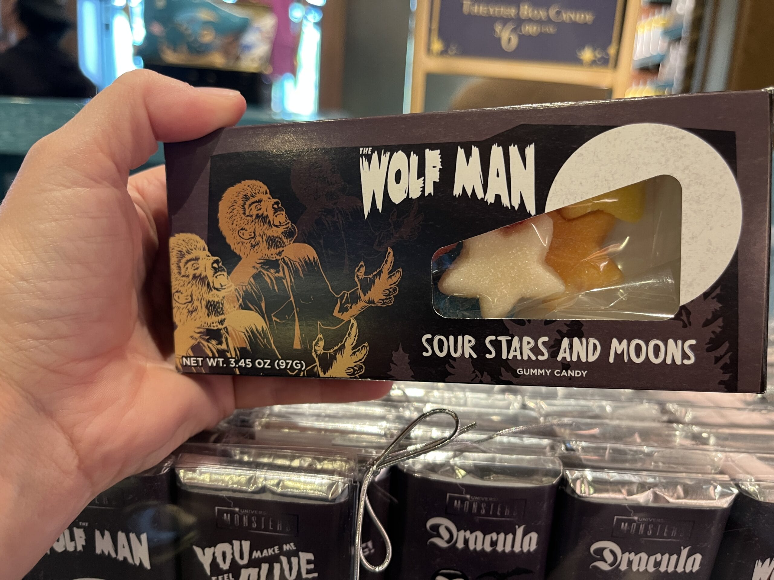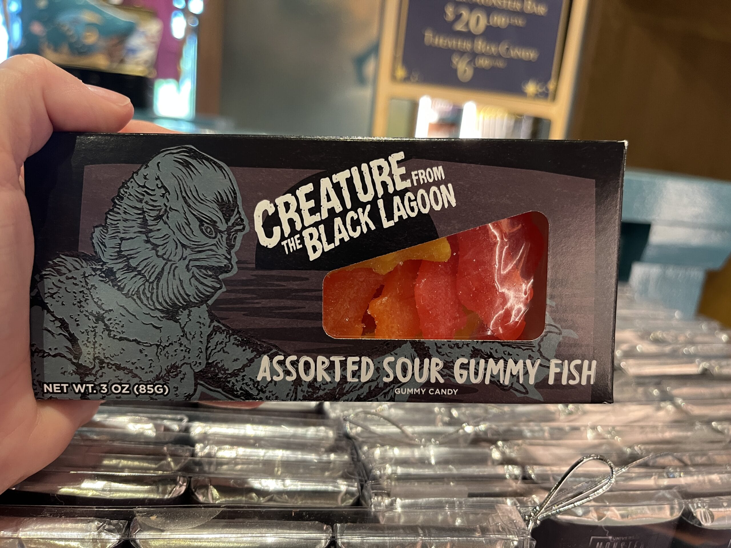 Various boxes of gummies feature sour gummy fish (Creature From the Black Lagoon), gummy fangs (Dracula), sour stars and moons (Wolf Man), strawberry filled gummy lips (The Bride of Frankenstein), and gummy brains (Frankenstein).