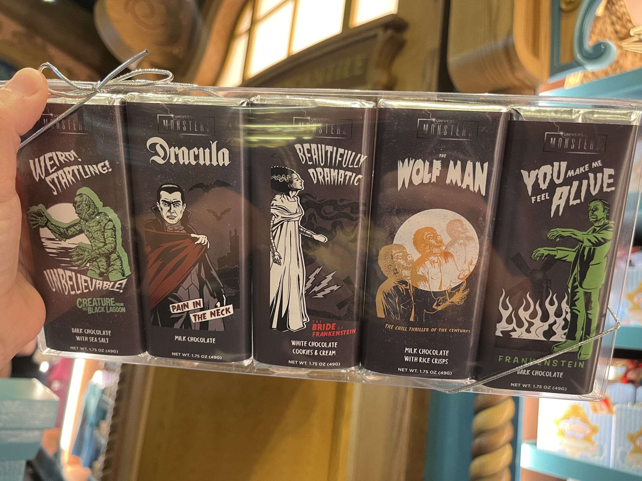 The 5 pack of chocolate bars include (from left to right): dark chocolate with sea salt, milk chocolate, white chocolate cookies and cream, milk chocolate with rice crisps, and milk chocolate. Each Monster is featured on a bar.