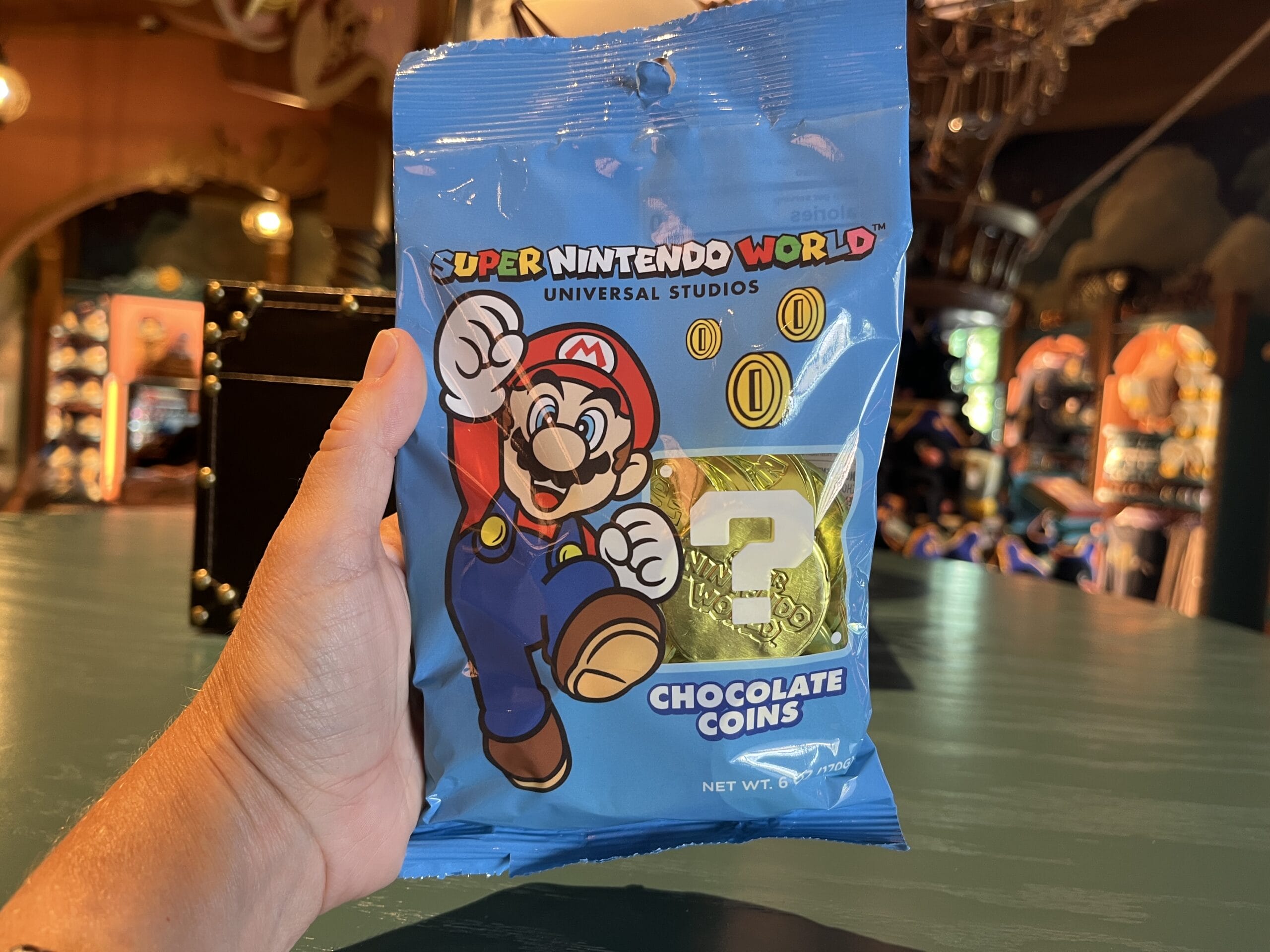 Bags of chocolate coins are available for purchase. The packaging is blue with an image of Mario.