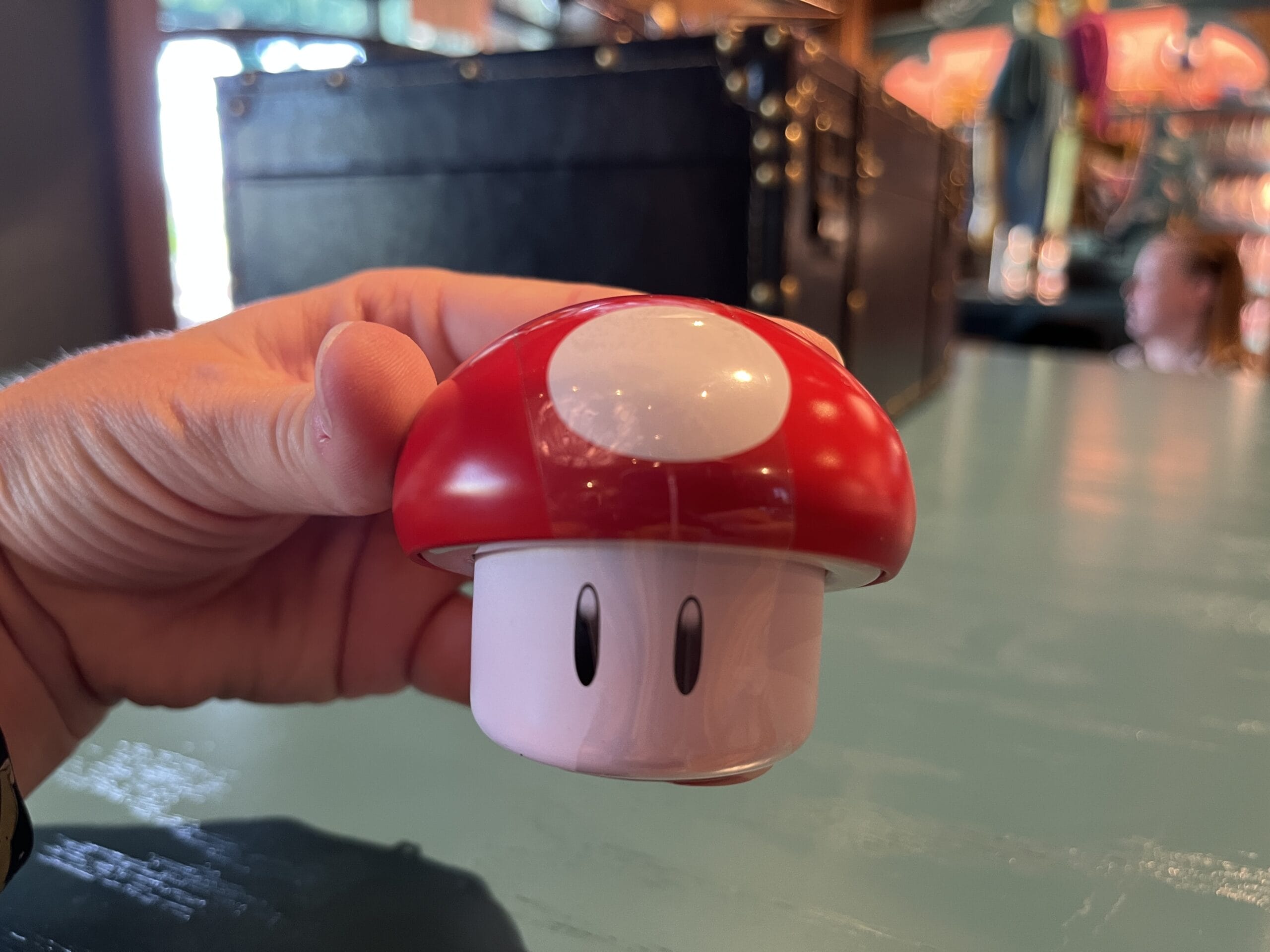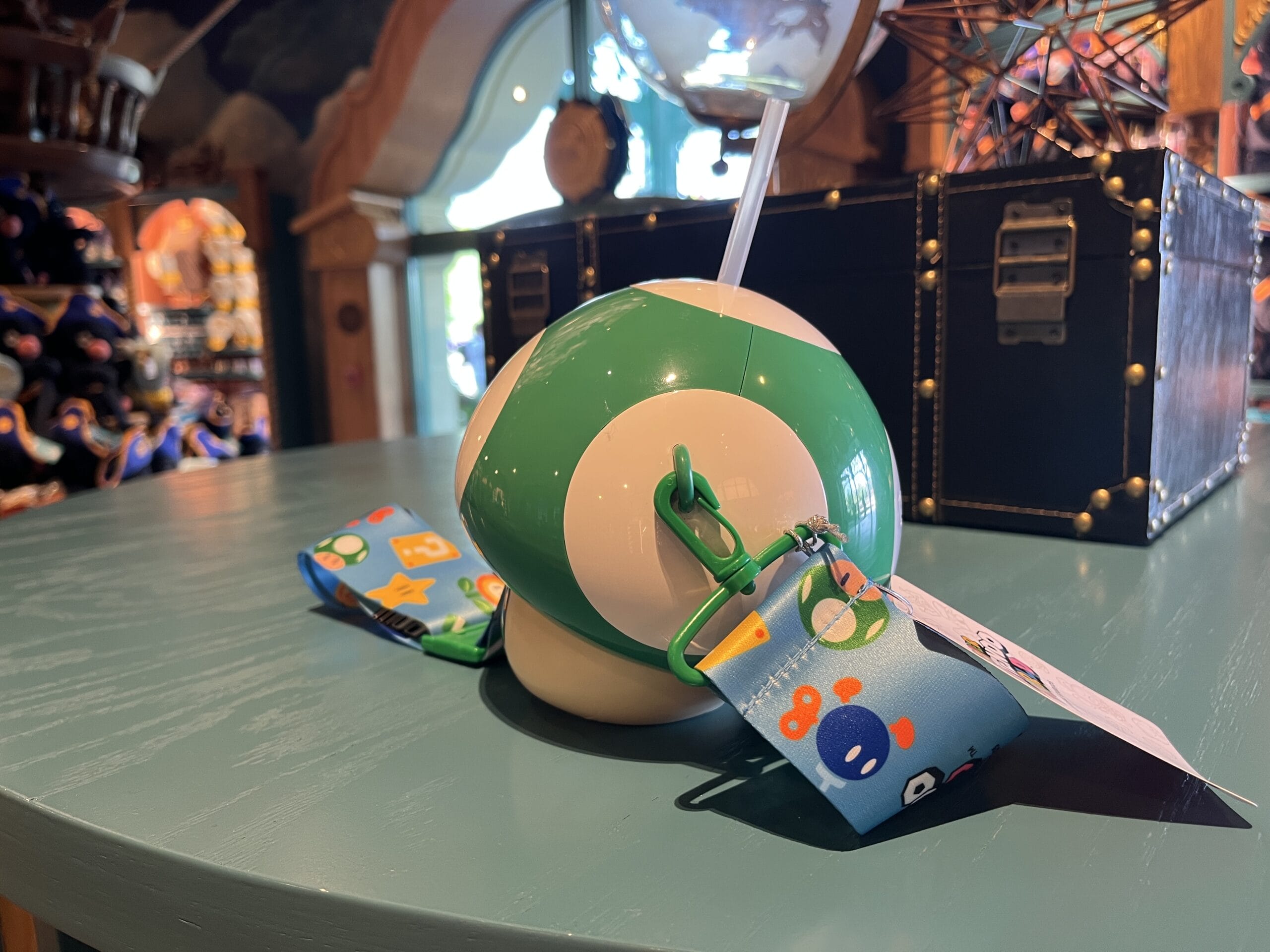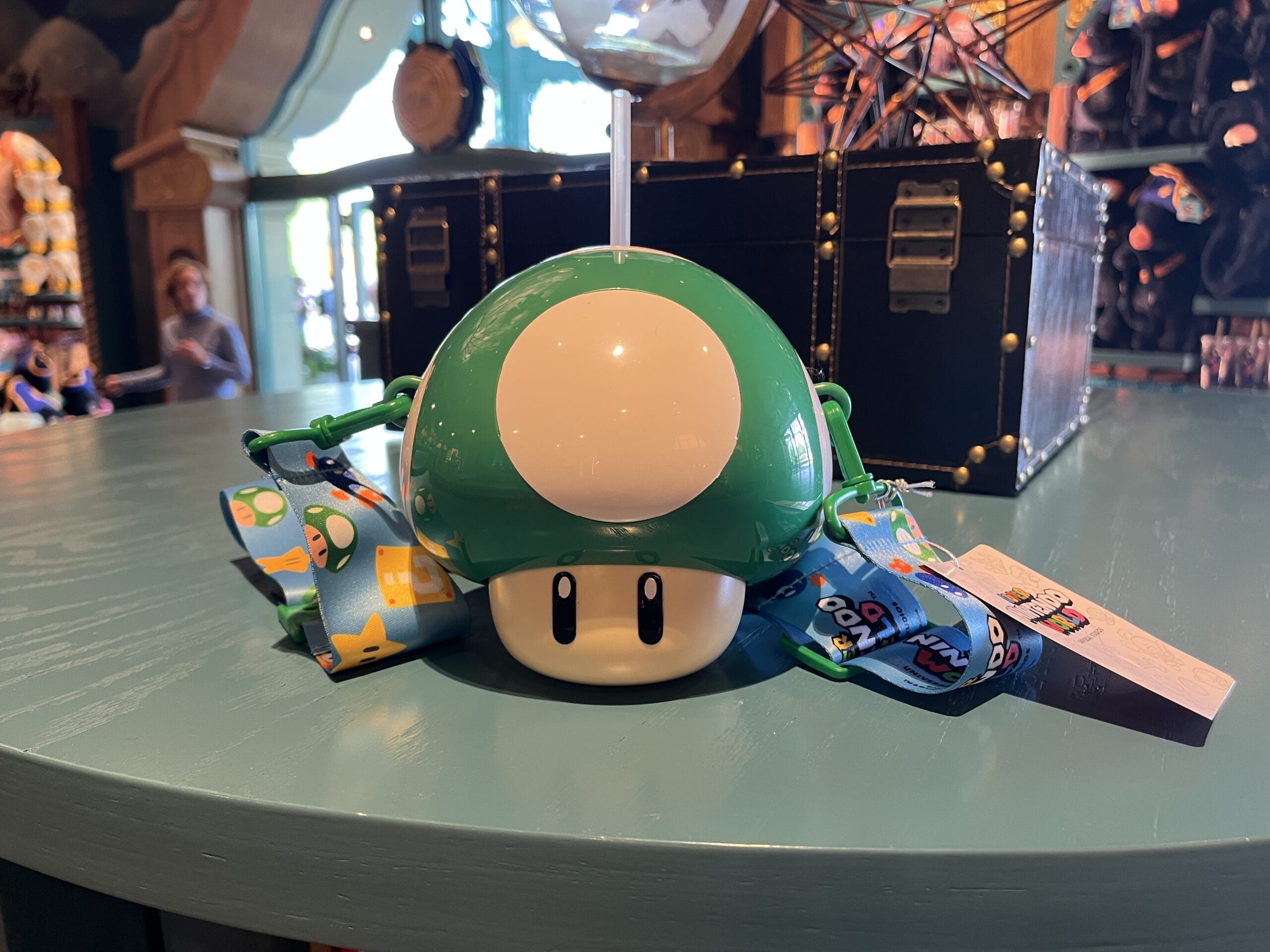 The green and red mushroom sippers include all day refills, and next day refills are available at regular menu price. The yellow strap makes it easy to carry around the park. A plastic straw sticks out of the top so you can drink out of it.