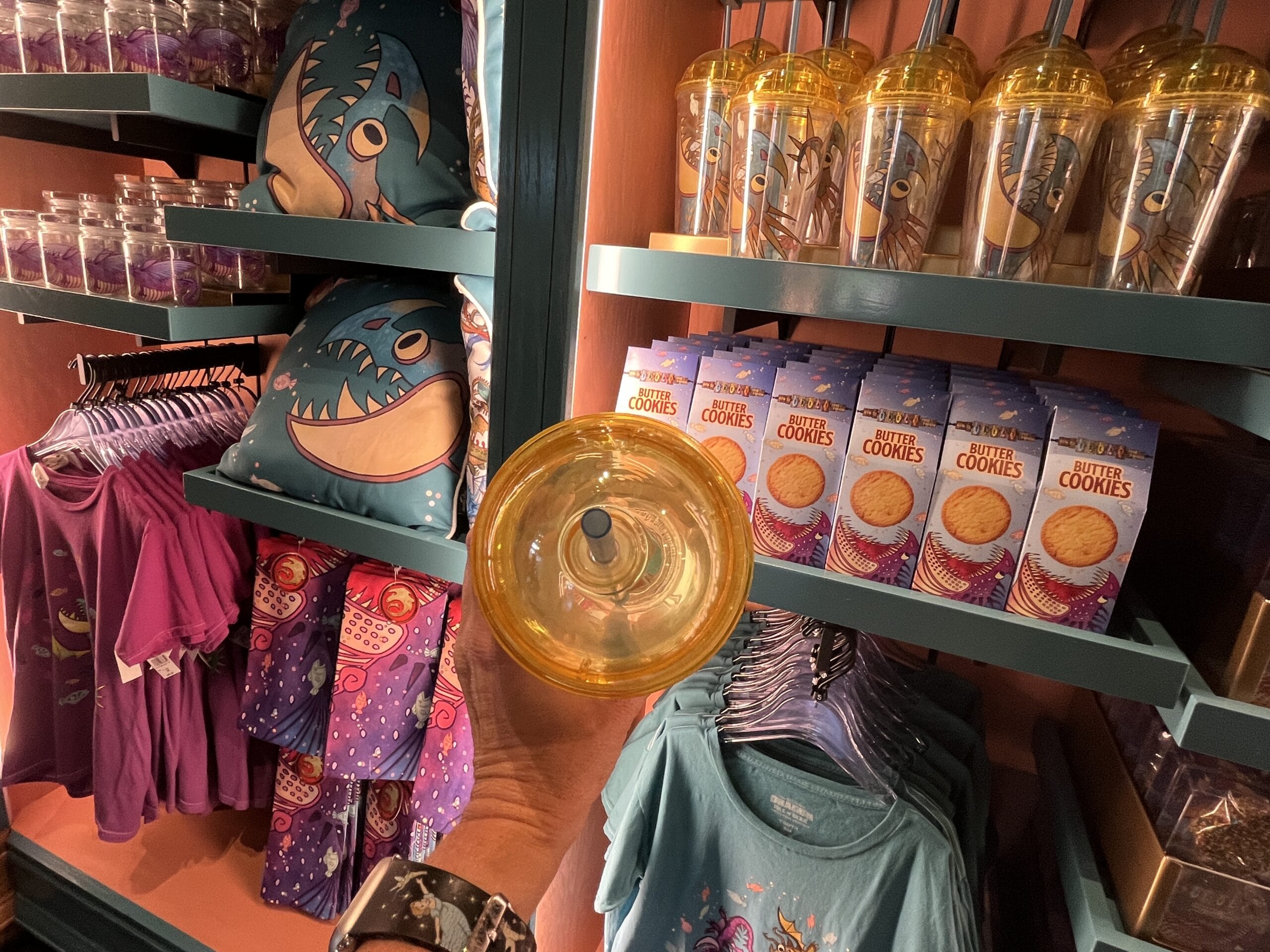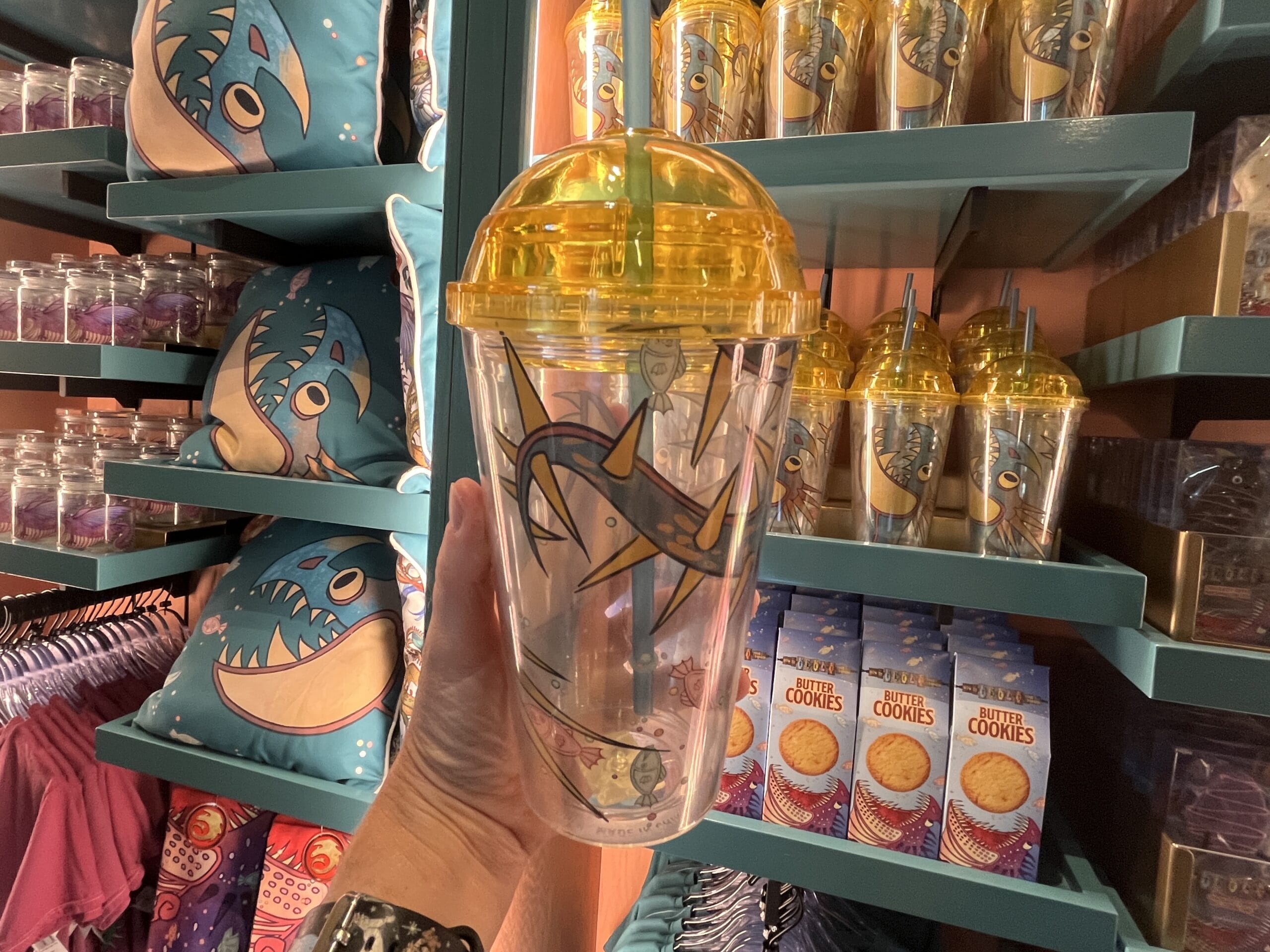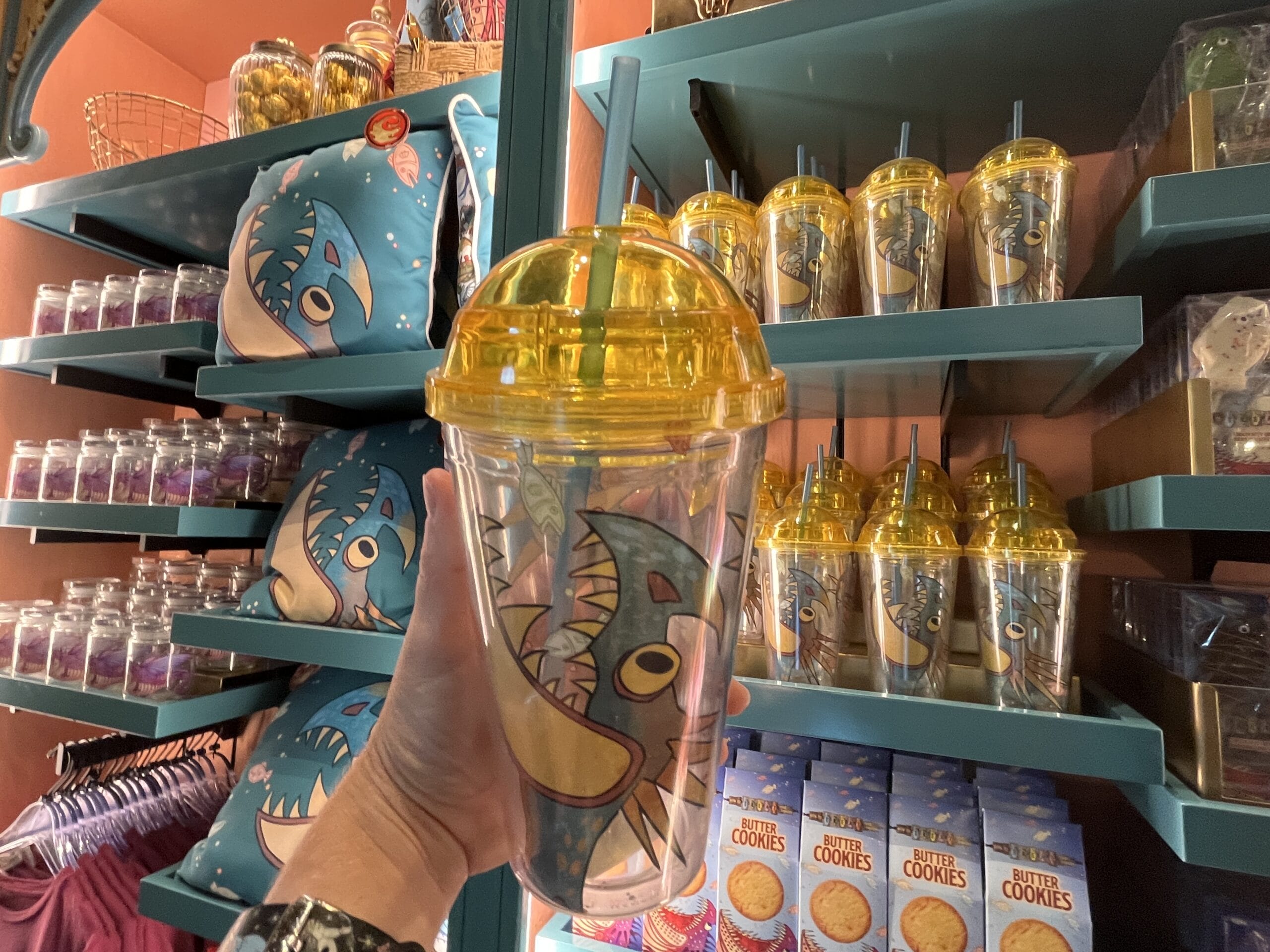 The green and red mushroom sippers include all day refills, and next day refills are available at regular menu price. The yellow strap makes it easy to carry around the park. A plastic straw sticks out of the top so you can drink out of it.