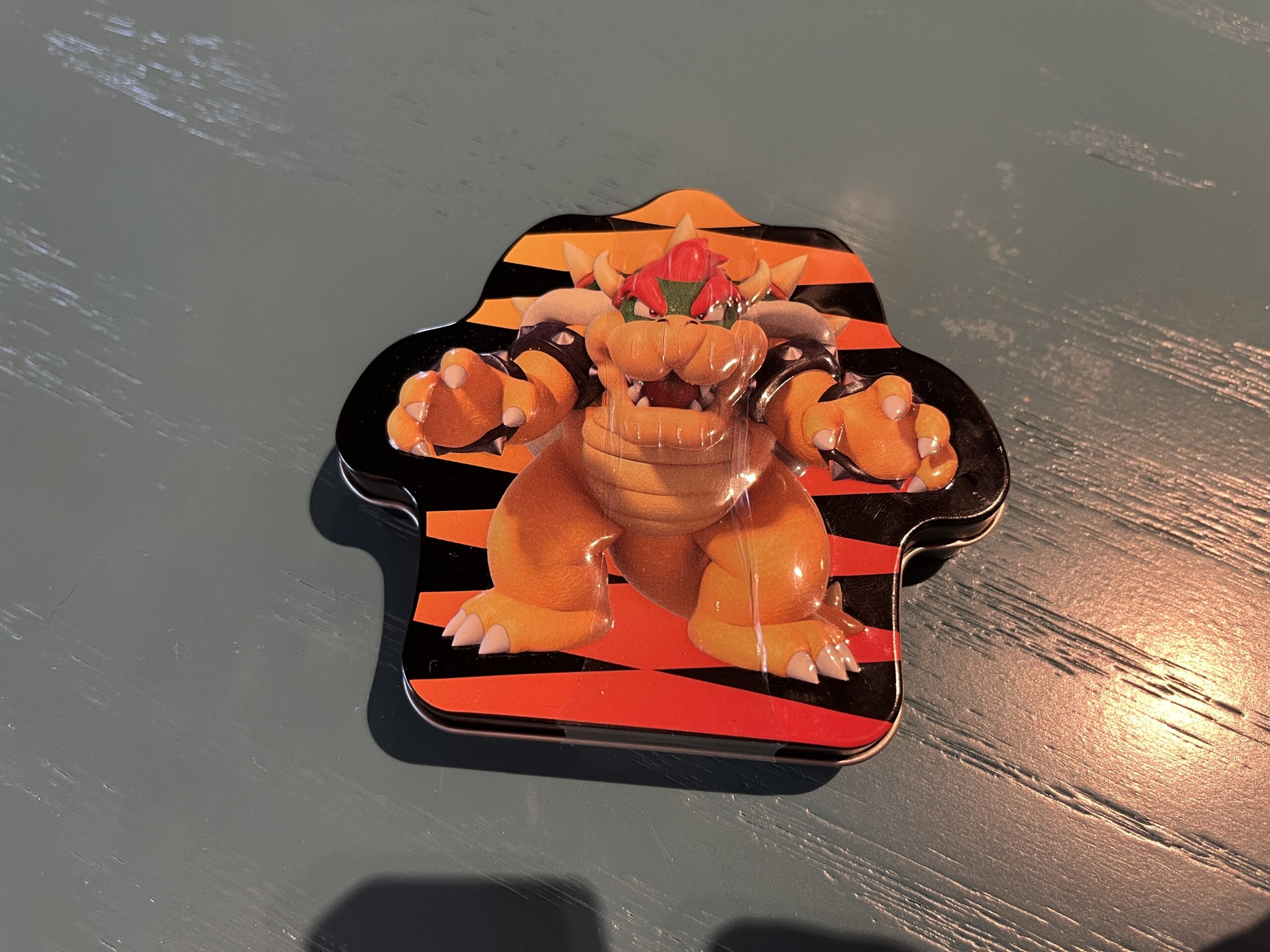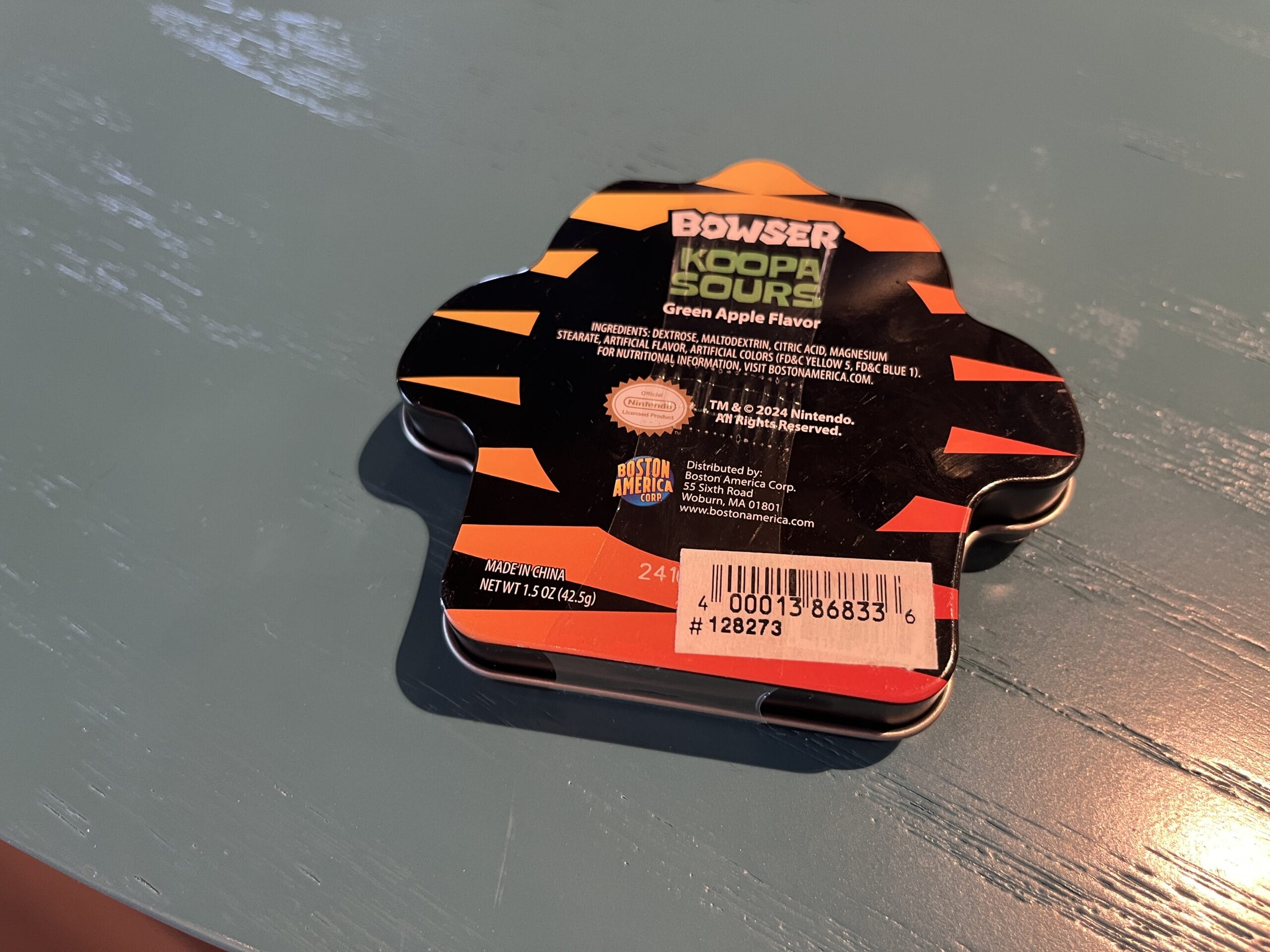 Green apple flavored sour candy is also available in Bowser tin packaging.
