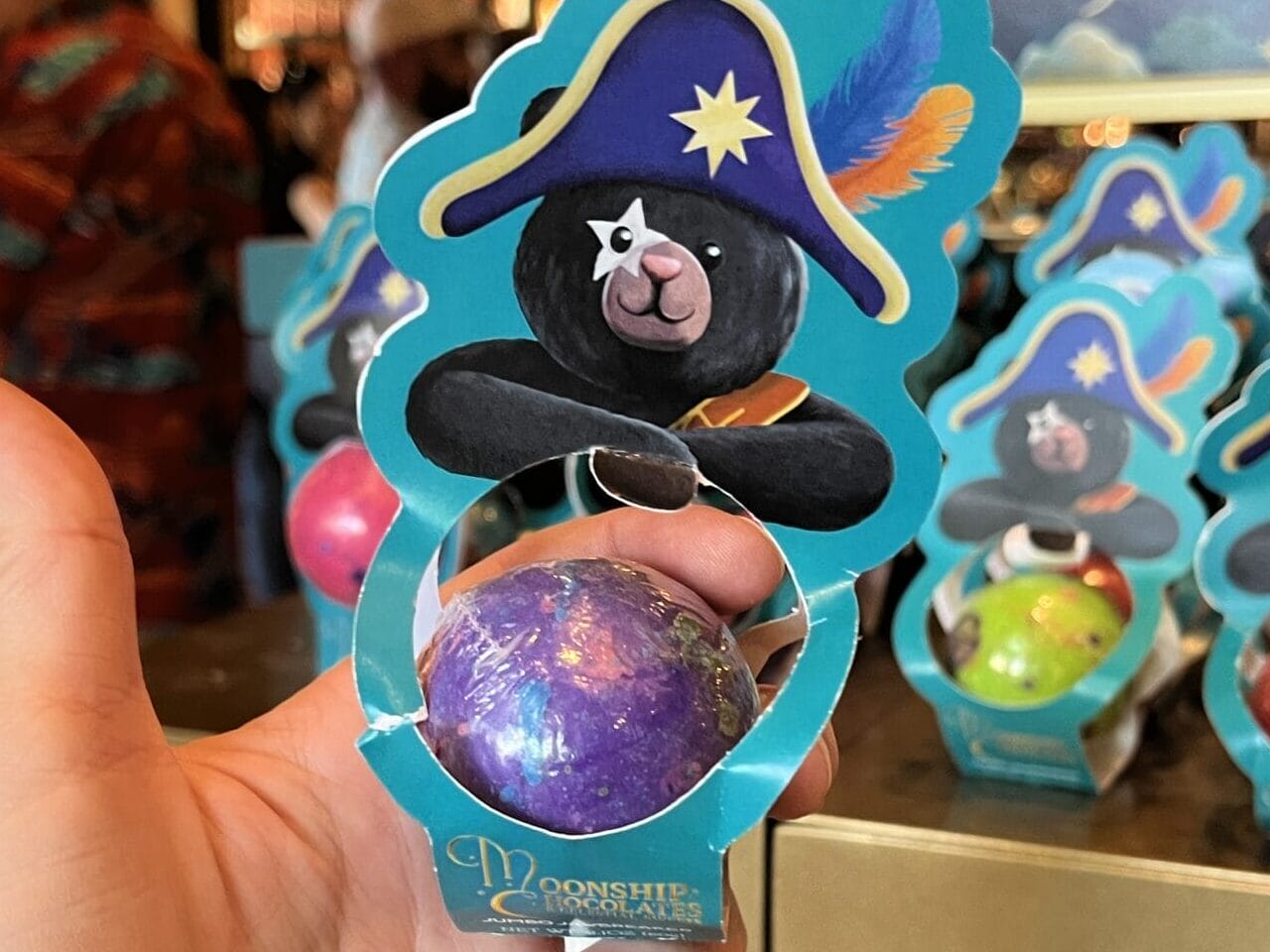 Other lollipops are in the shape of a sphere with galaxy patterns on them. They come in a variety of colors, but all have paper packaging with an image of the Captain.