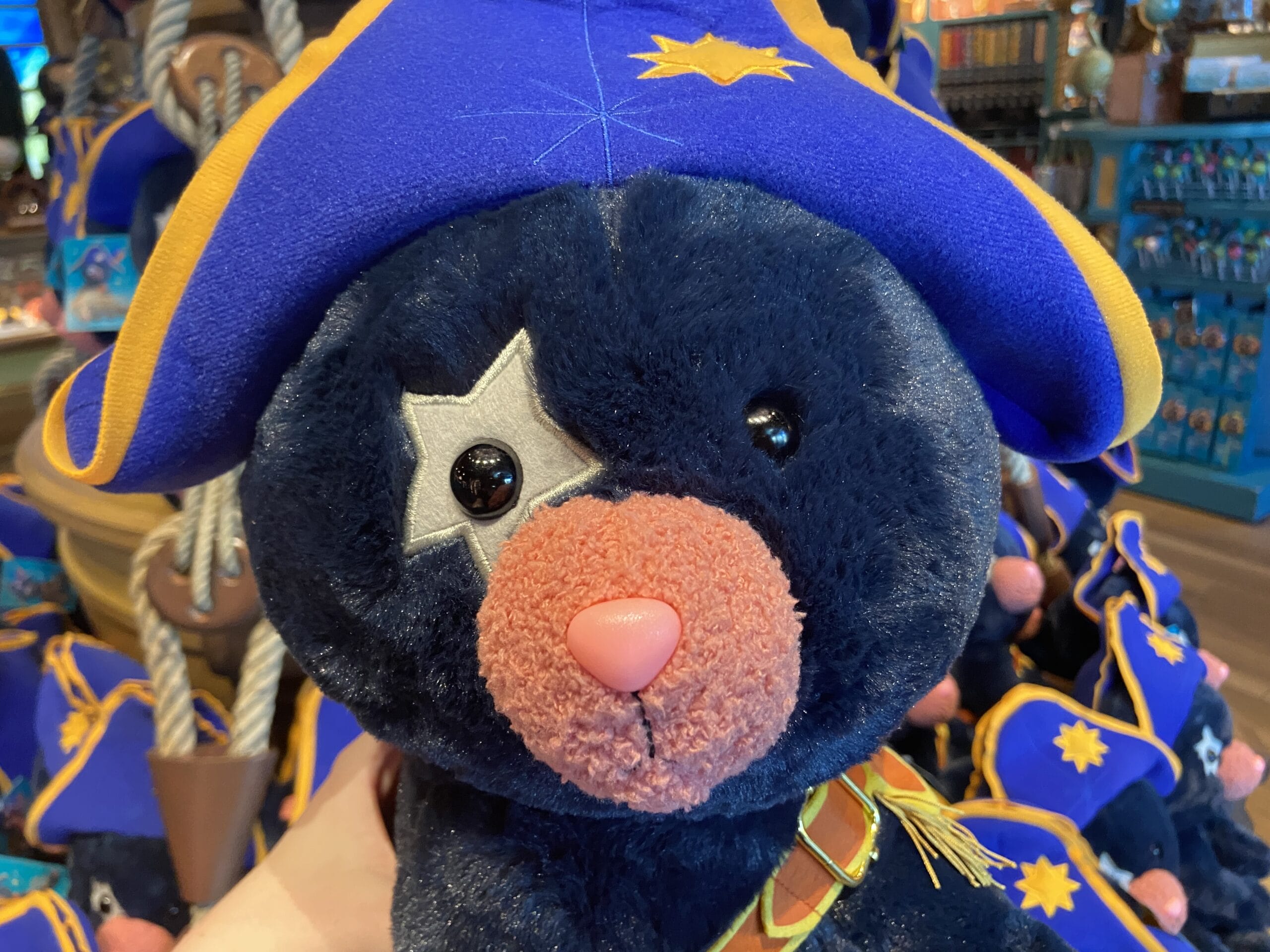 Captain Cacao is the main focus of this plush backpack. He is made of a fuzzy midnight blue color with a bright blue and gold trifold hat on top of his head. He has a star around one of his eyes and a pink snout.