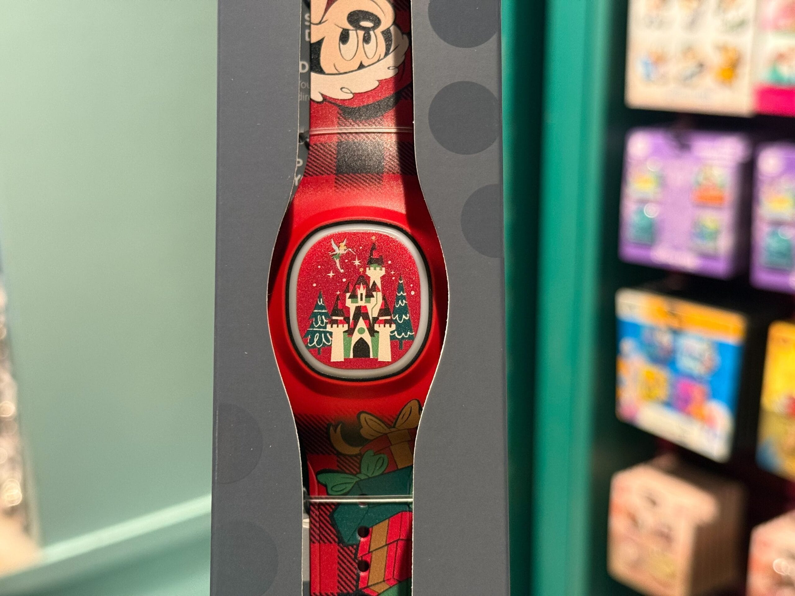 Larger artwork of a wreath featuring all of Mickey’s friends is on the back. Sleeping Beauty Castle is in festive colors within the wreath. “Happy Holidays” is on a plaid printed ribbon.