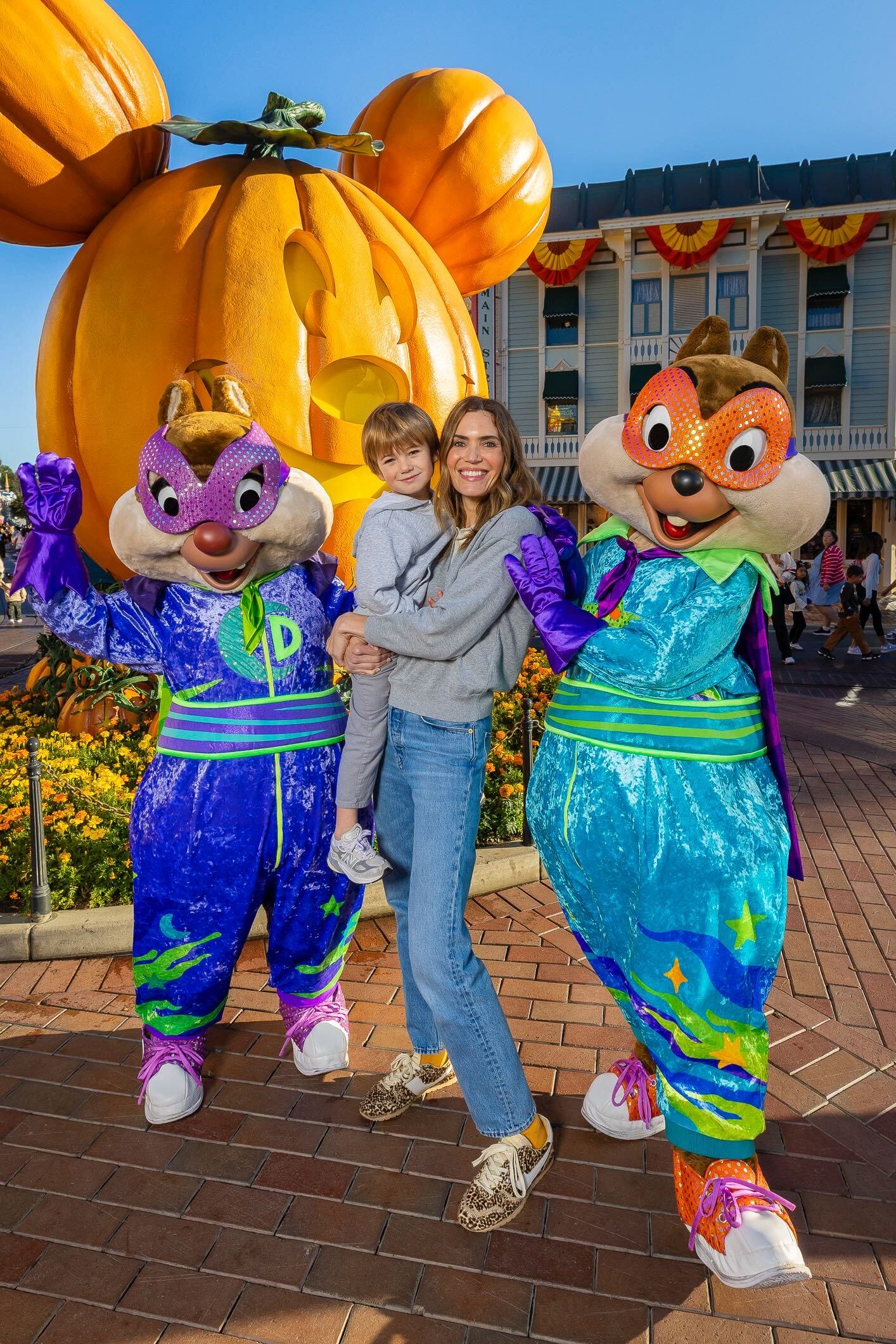Disney shared photos of Moore, her husband Taylor Goldsmith, and her sons Ozzie and Gus. The family met Chip ‘n’ Dale in their superhero costumes at the giant Mickey Pumpkin on Main Street, U.S.A.