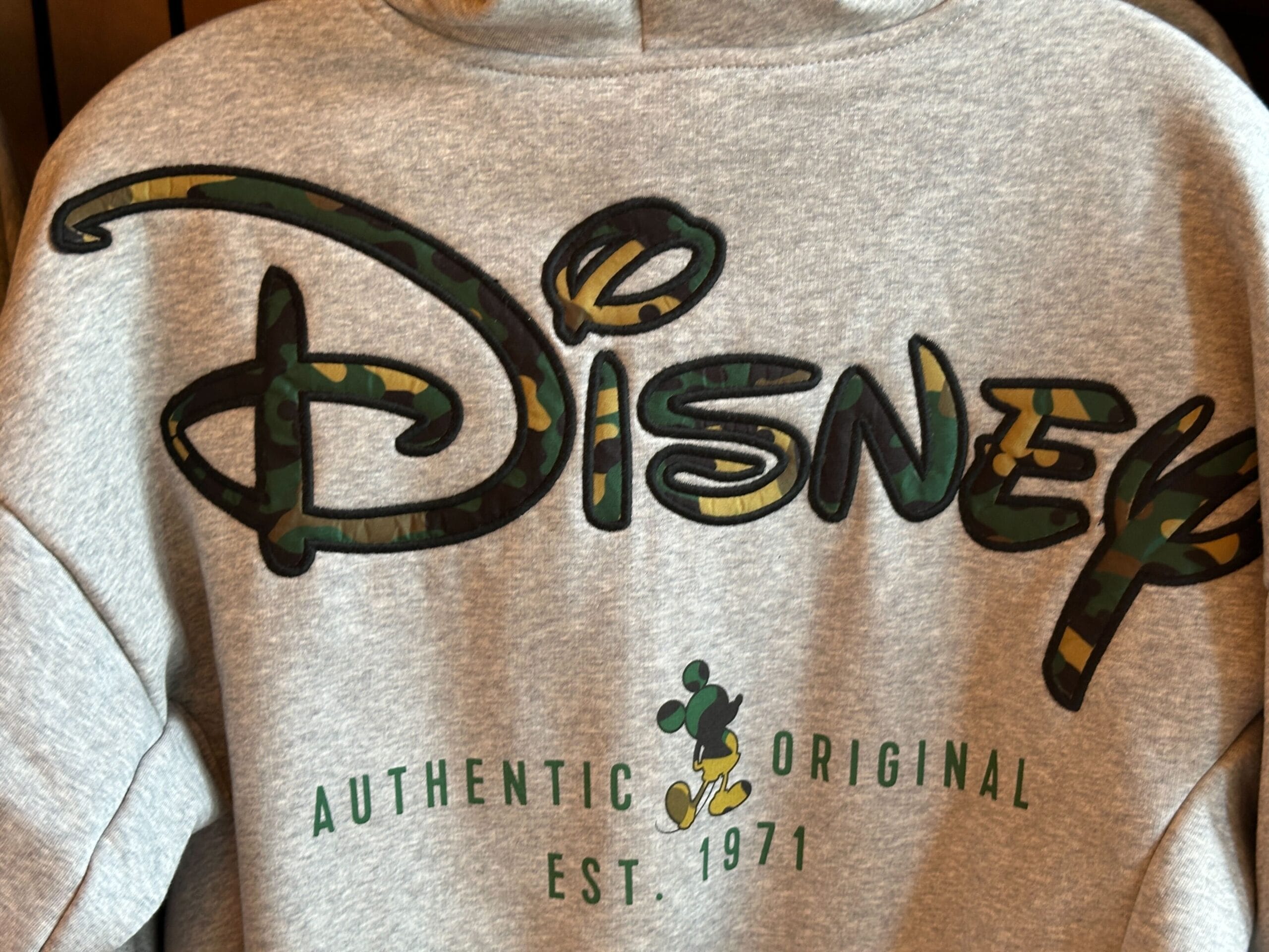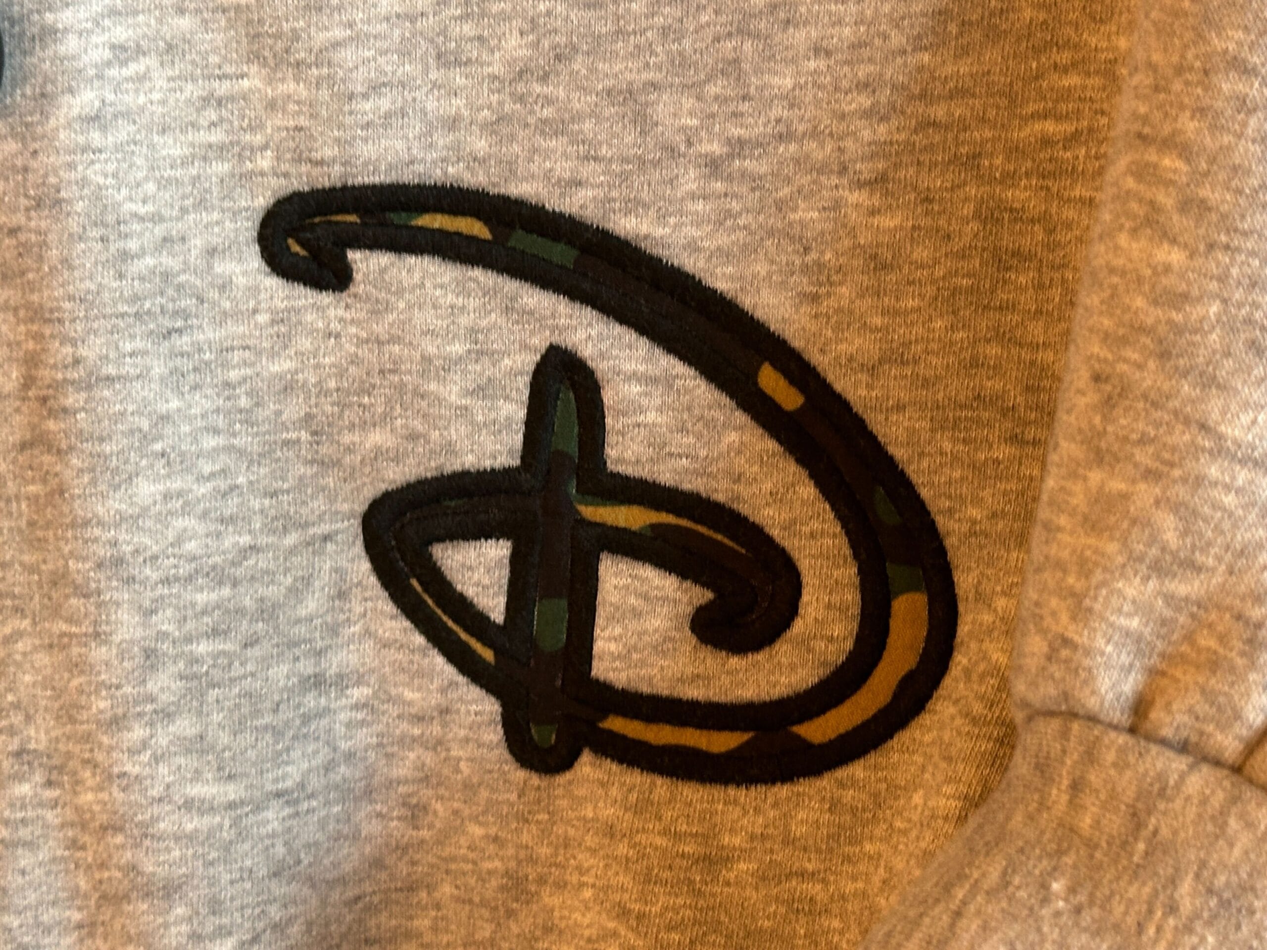 This is a heather gray zip-up hoodie with dropped shoulders. Embroidered on the left breast is the classic cursive Disney “D” logo in a green and tan camo pattern.