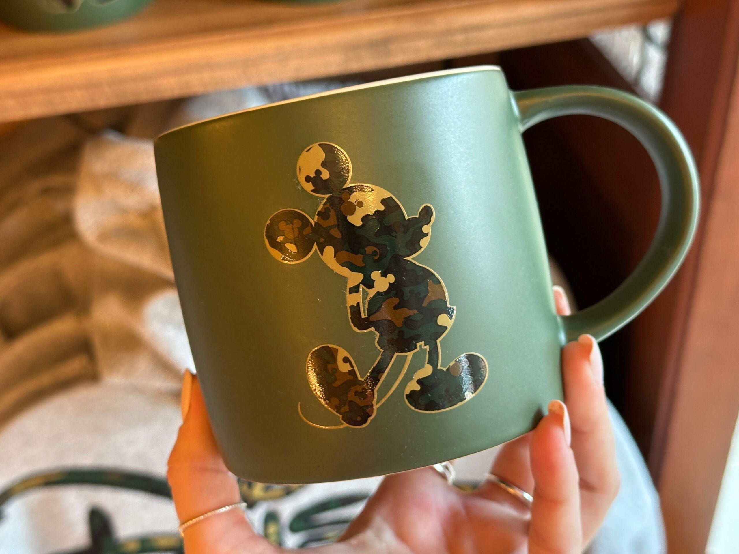 The mug is green with a matte finish. A camo Mickey silhouette is on one side.