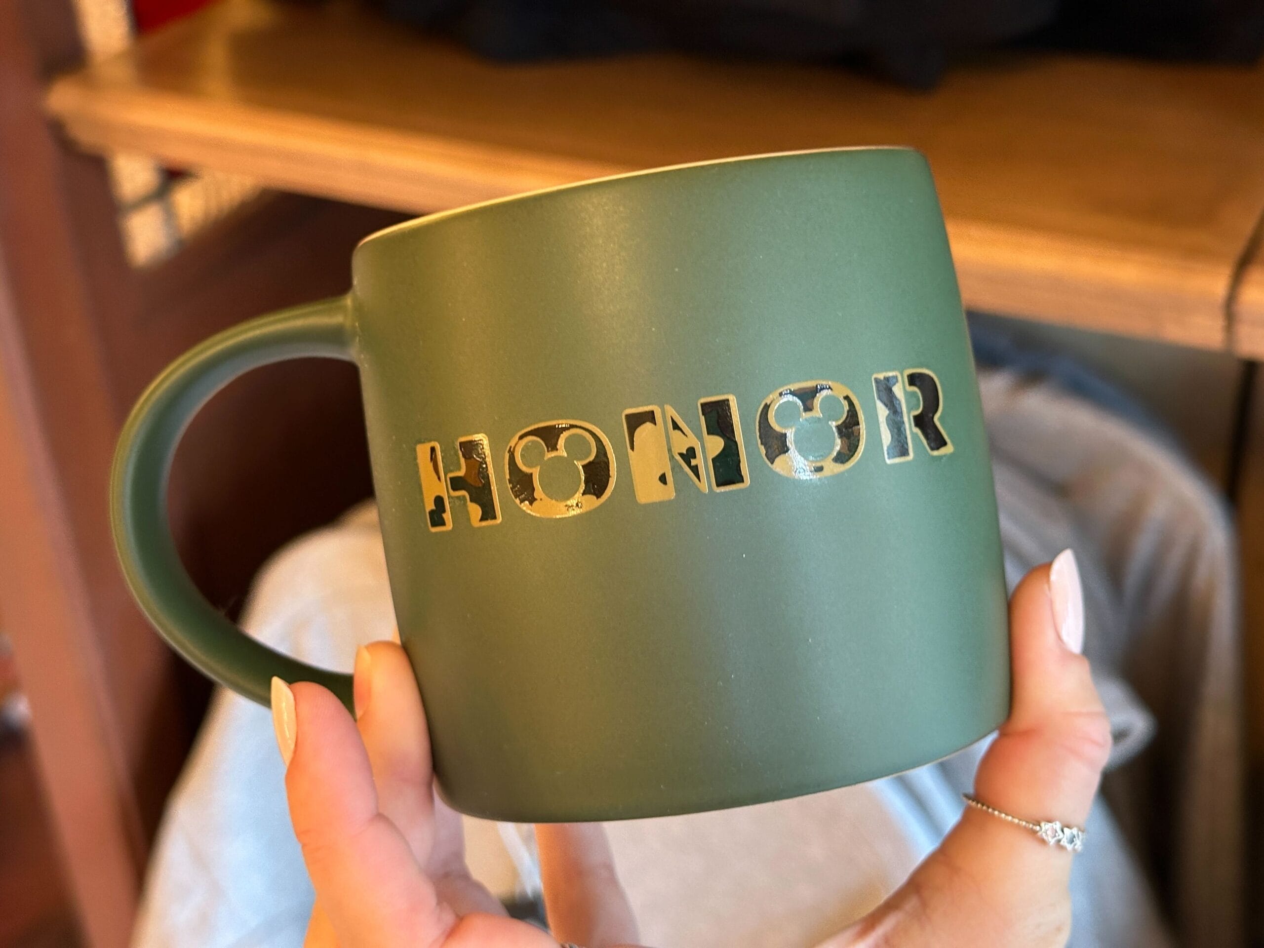 On the reverse is “Honor” with Mickey icons. The mug is hand wash only but microwaveable.
