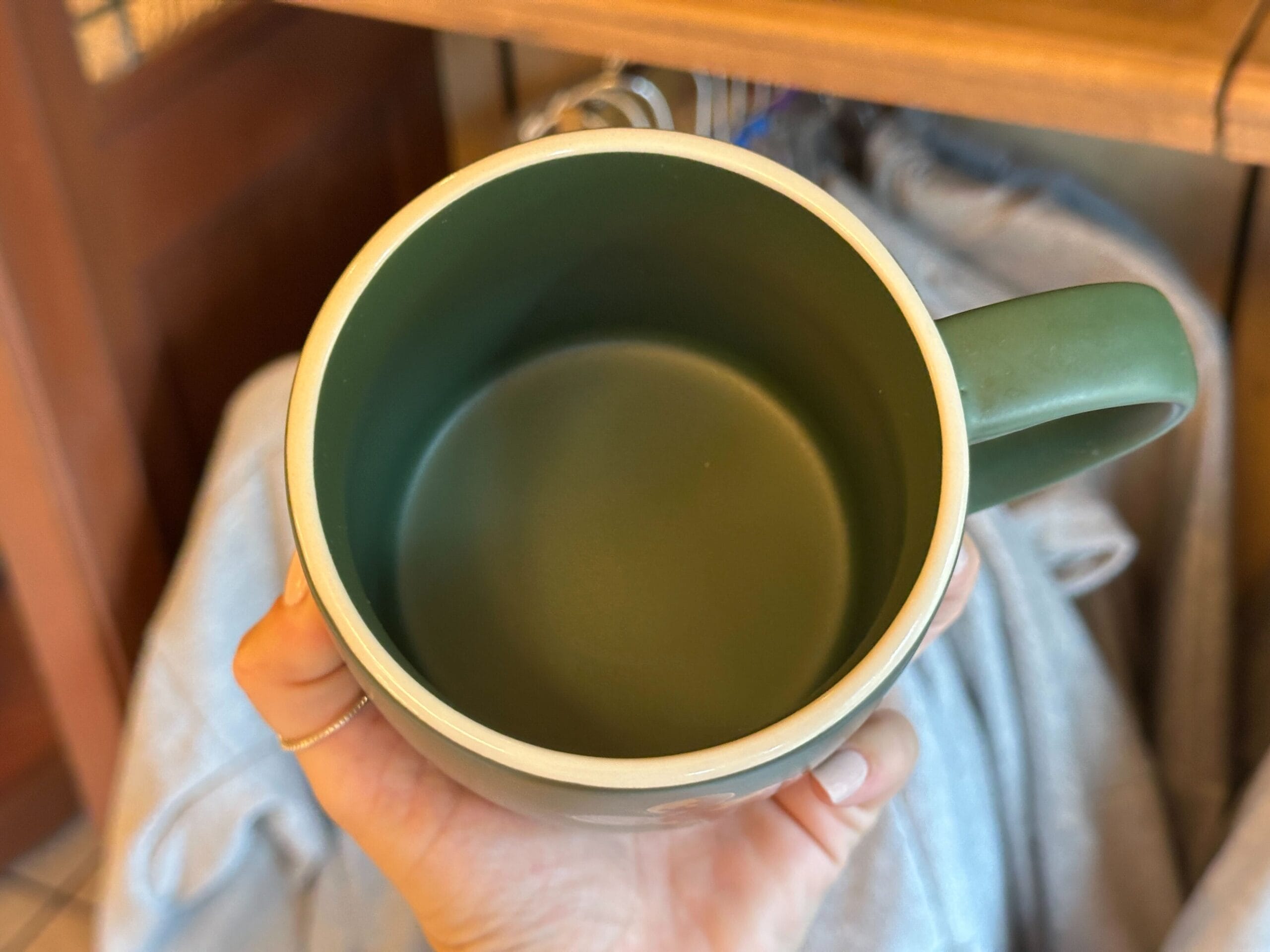 It has an off-white rim. It holds 483 mL / 17 oz.