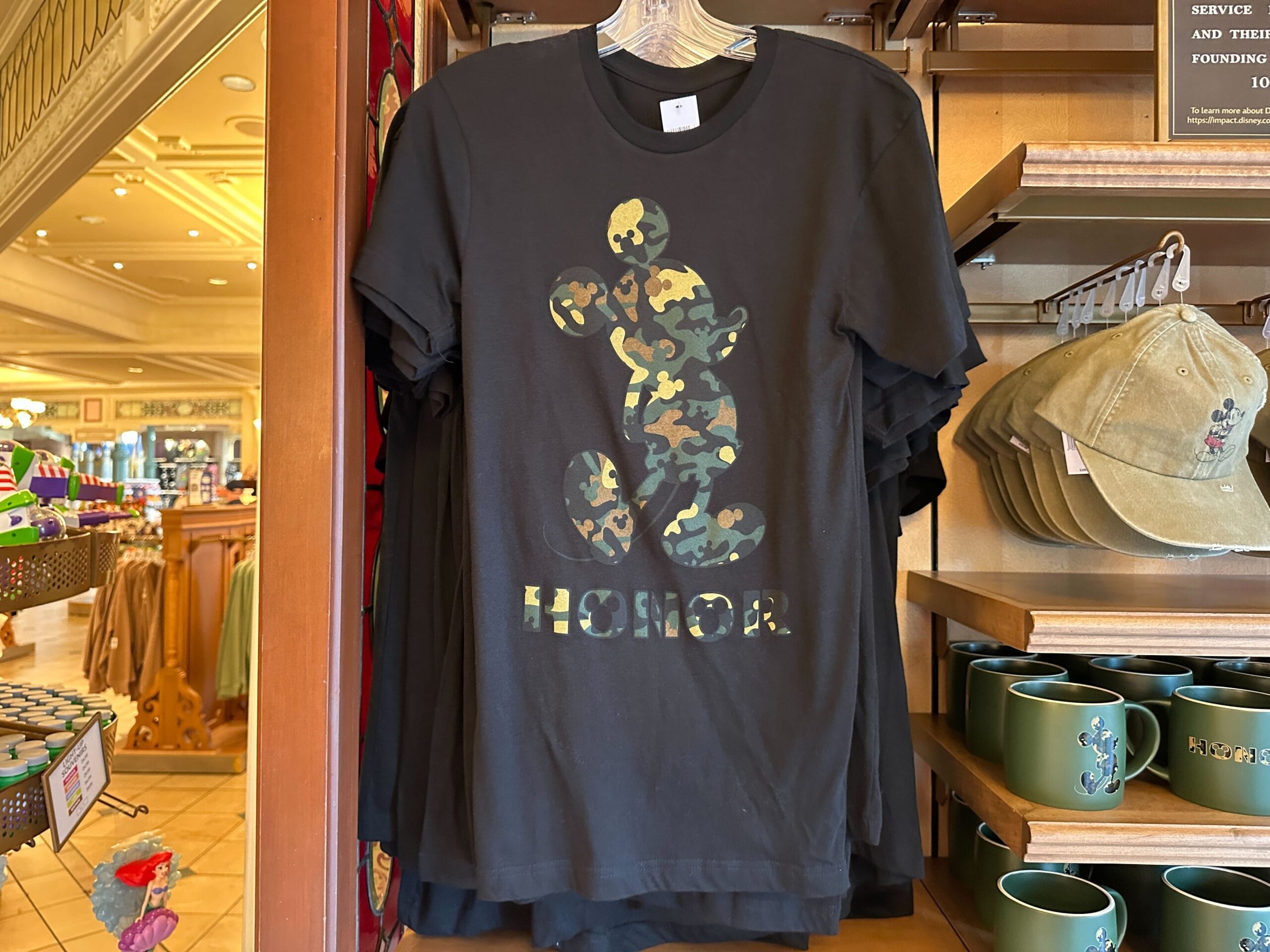 The t-shirt is black with a camouflage Mickey design featured on previous versions of this collection. The Mickey silhouette on the chest features hidden Mickey icons in the camouflage pattern. “Honor” is printed below the silhouette, with Mickey icons in the “o”s.