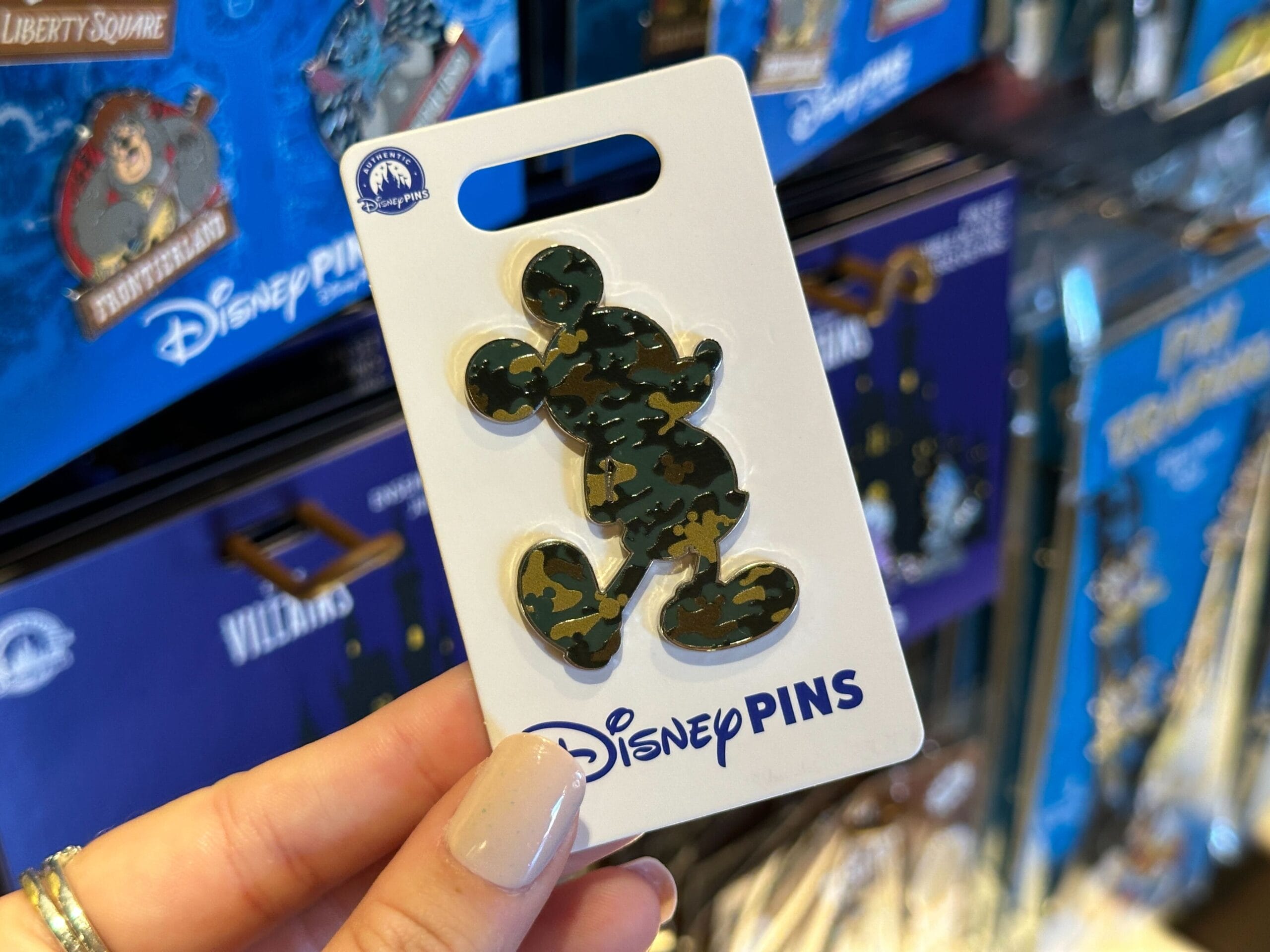 The pin is a Mickey silhouette filled with the camo pattern featuring Mickey icons.