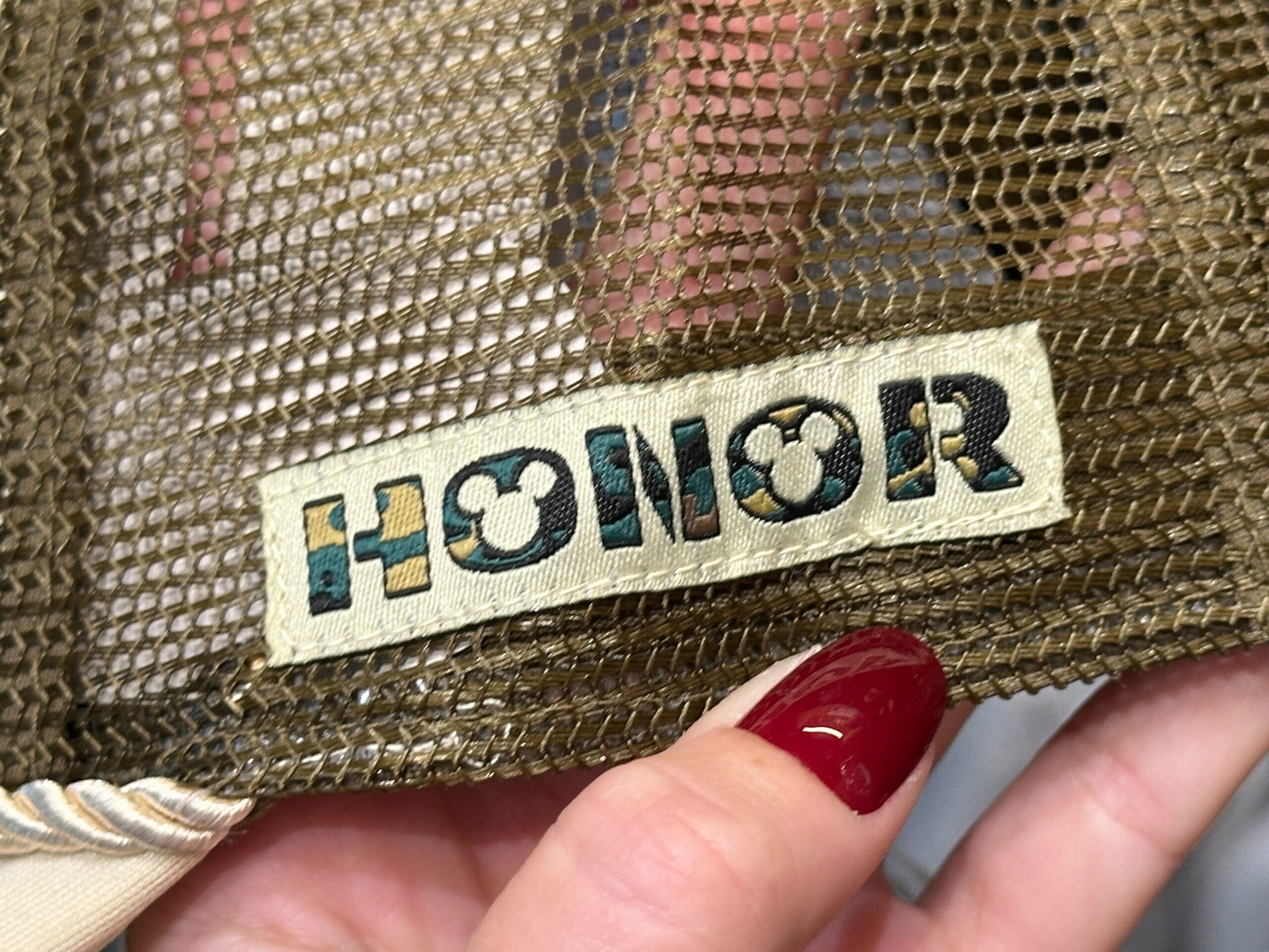 The front of this hat is off-white fabric with a rope detail between the cap and brim. Camouflage Mickey is an appliqué on the front. The back half is green mesh. An “Honor” label is on the left side.