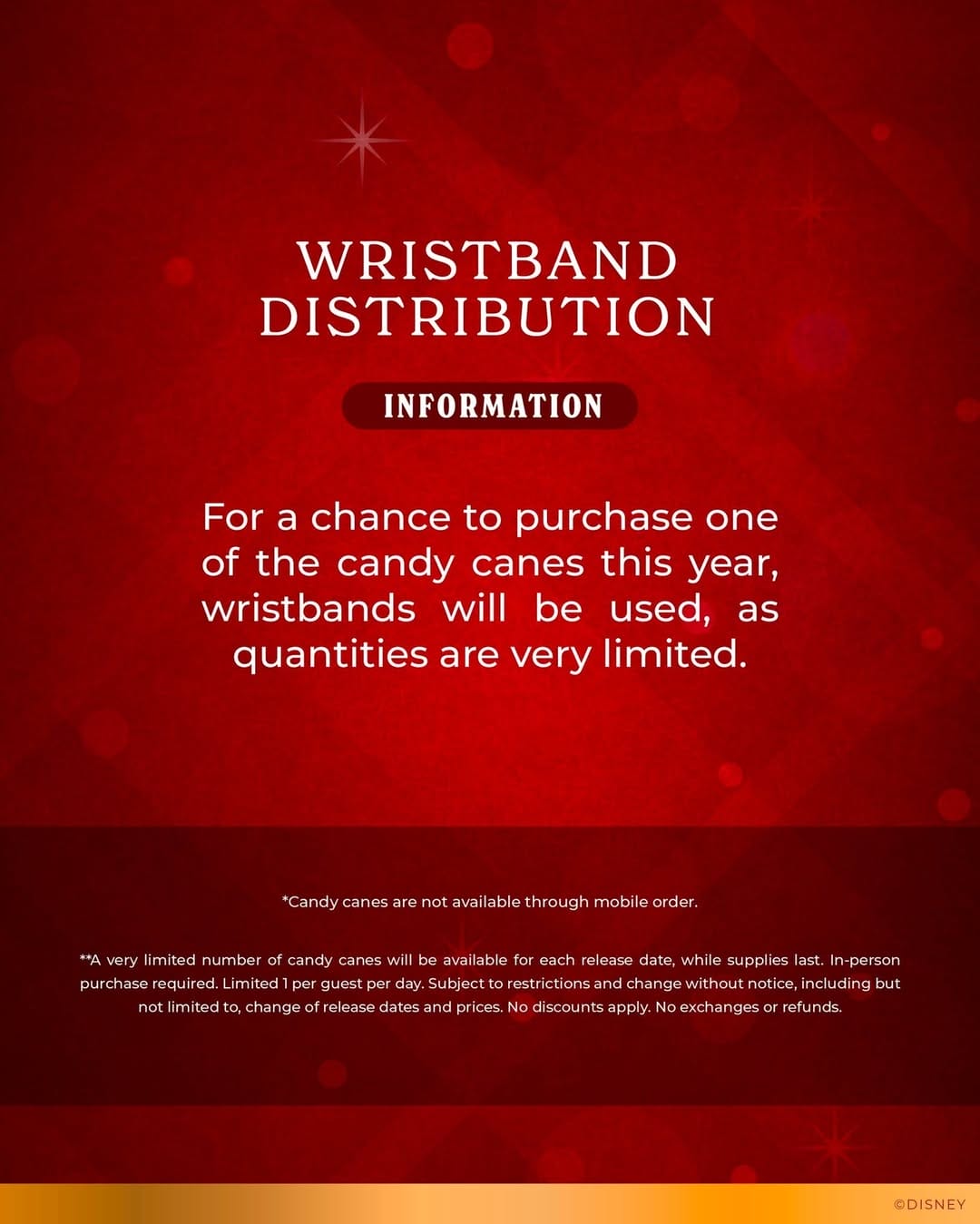While Disney has used a mobile waitlist for the candy canes since 2021, only wristbands will be used this year. Quantities are limited and each guest can only get one candy cane.