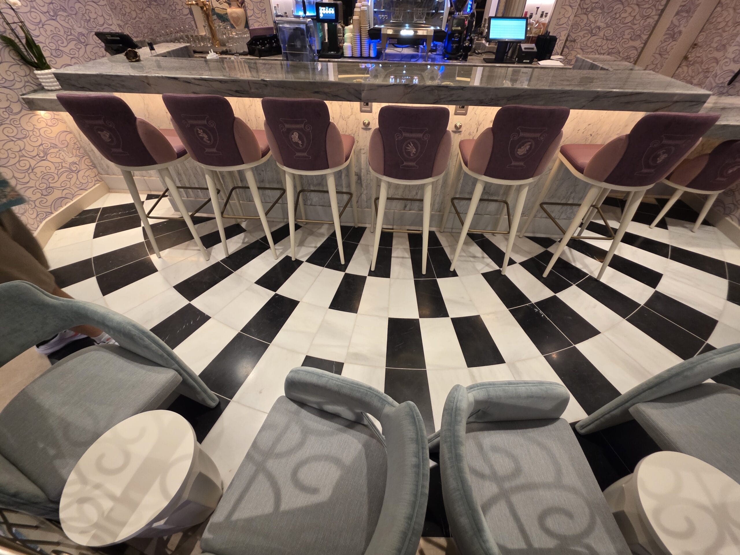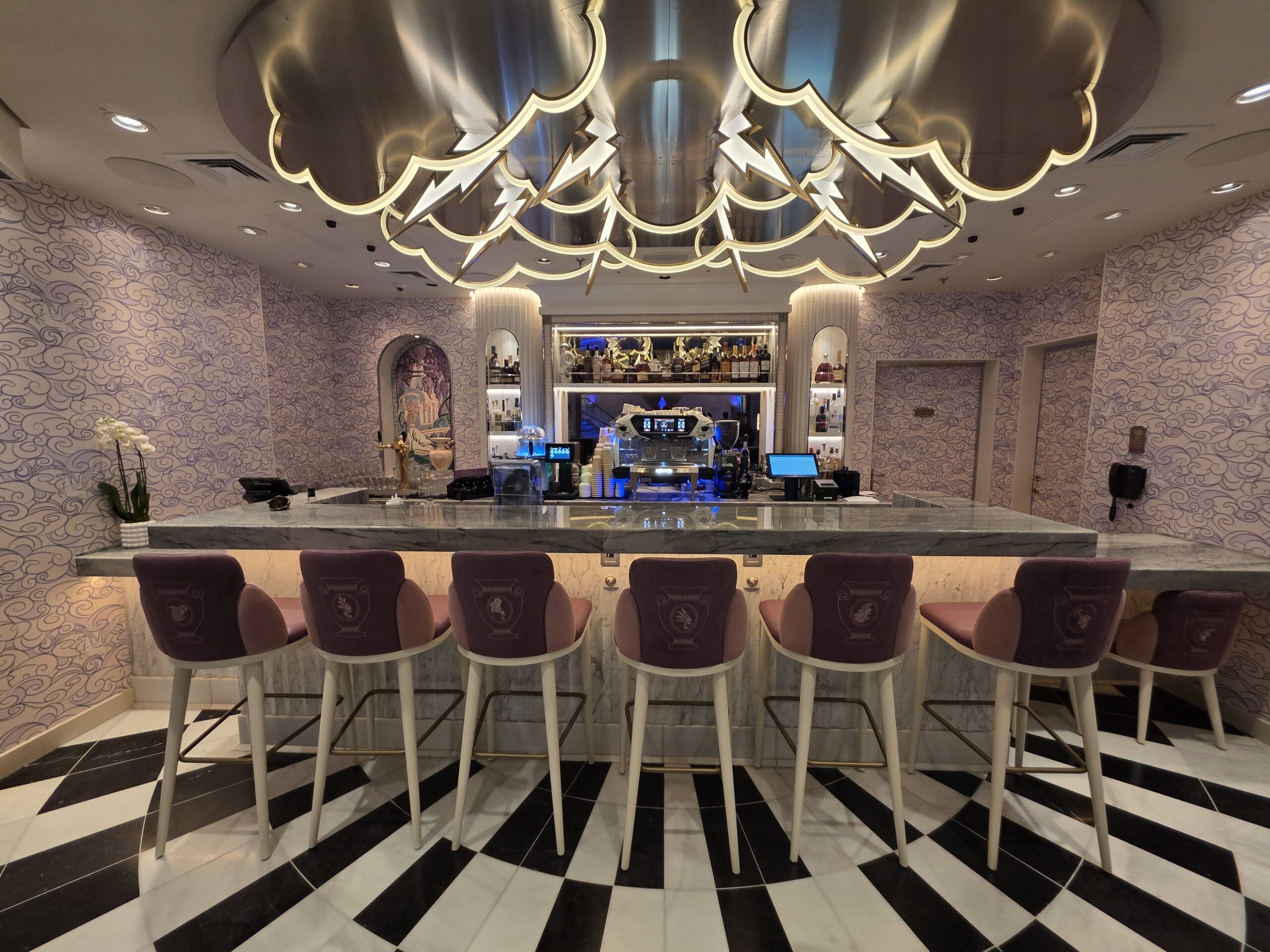 The floor has black and white marbled floors that look almost like piano keys. Lavender-colored chairs line the bar, and accessible seating is on the right.