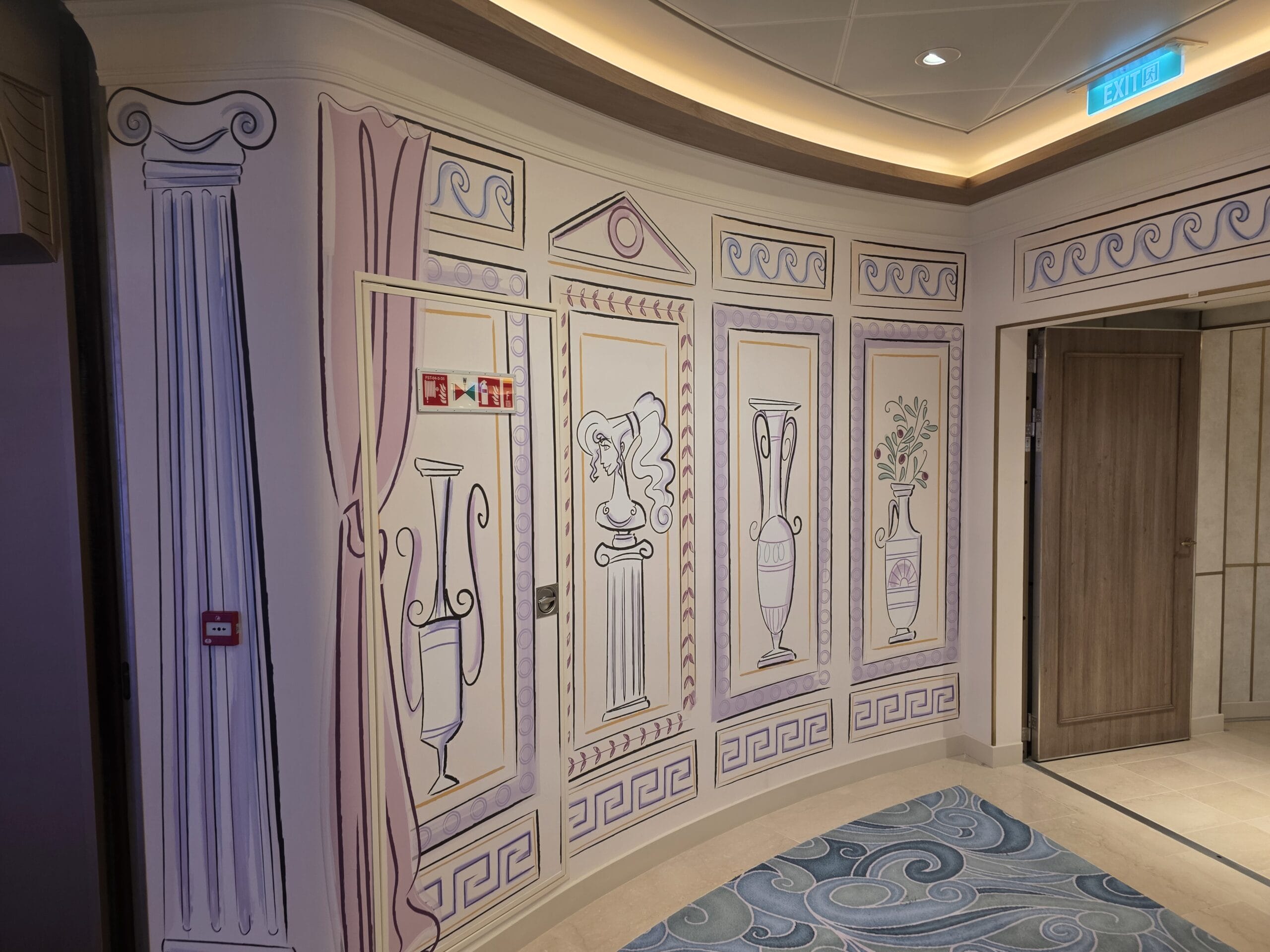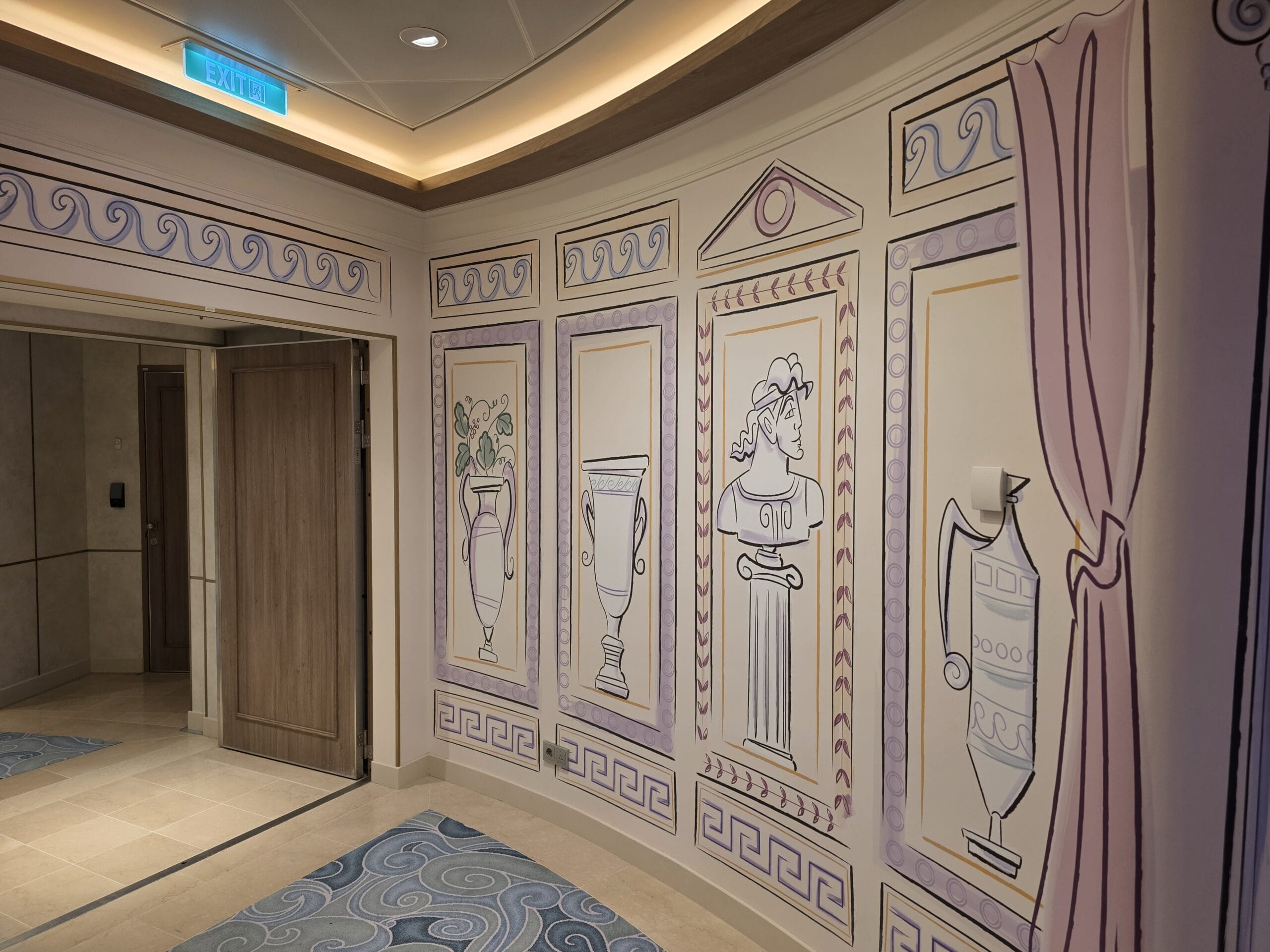 The walls also have paintings on the wall that look like portraits of various Greek mythology architecture and objects. Hercules and Megara on both on busts. Painted curtains “hang” on each side. The Greco-Disco style really shines here.