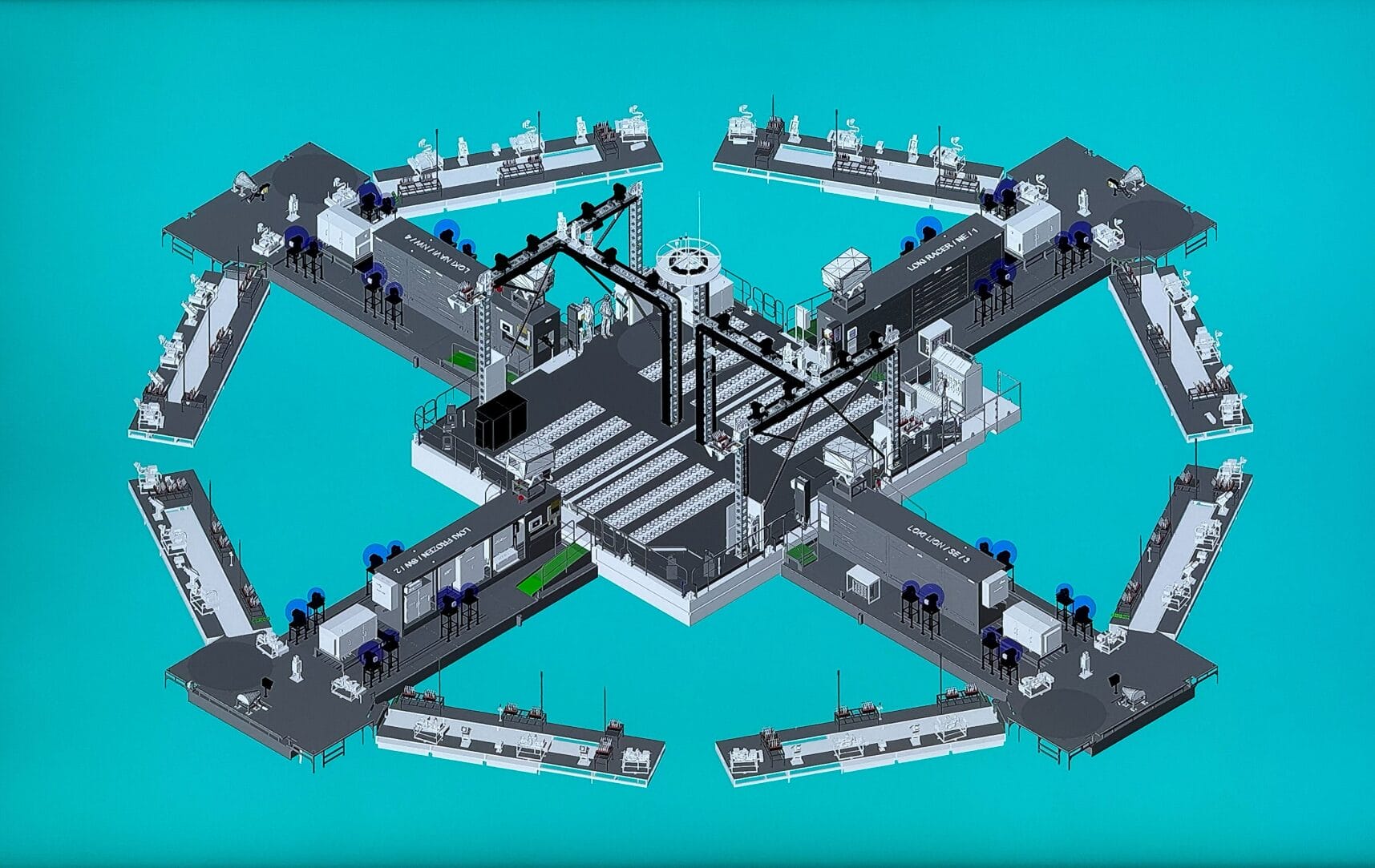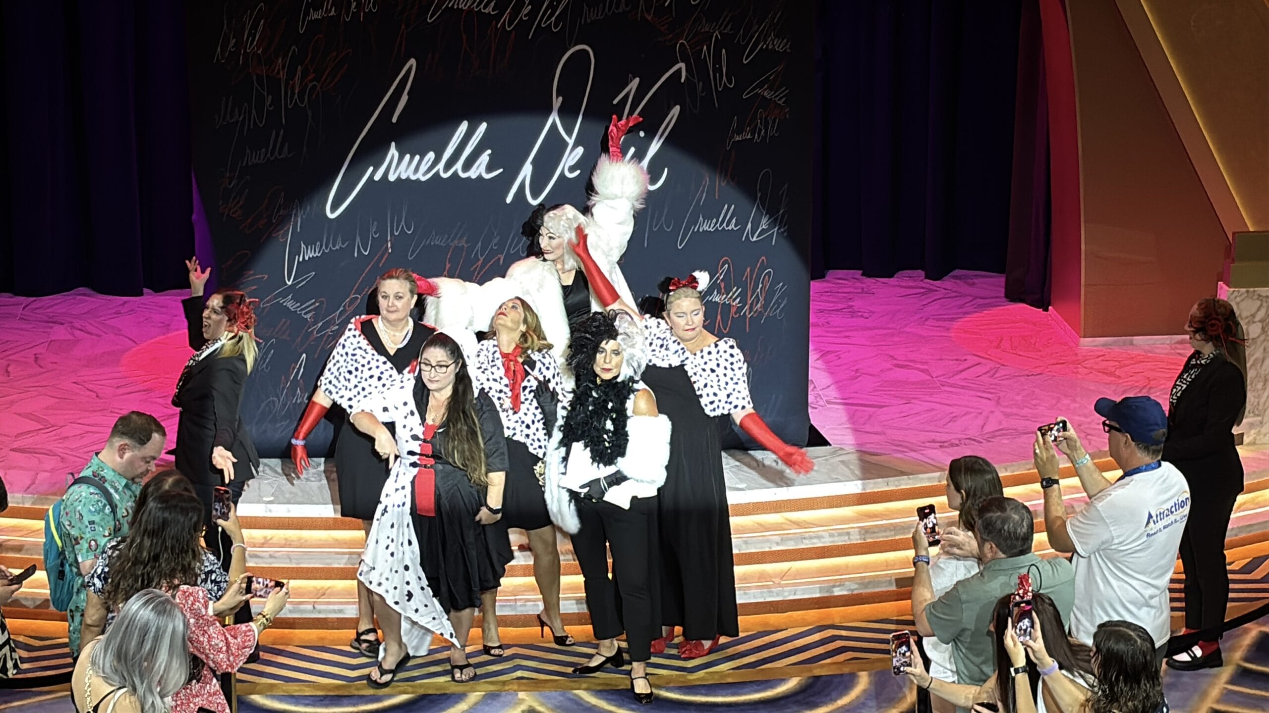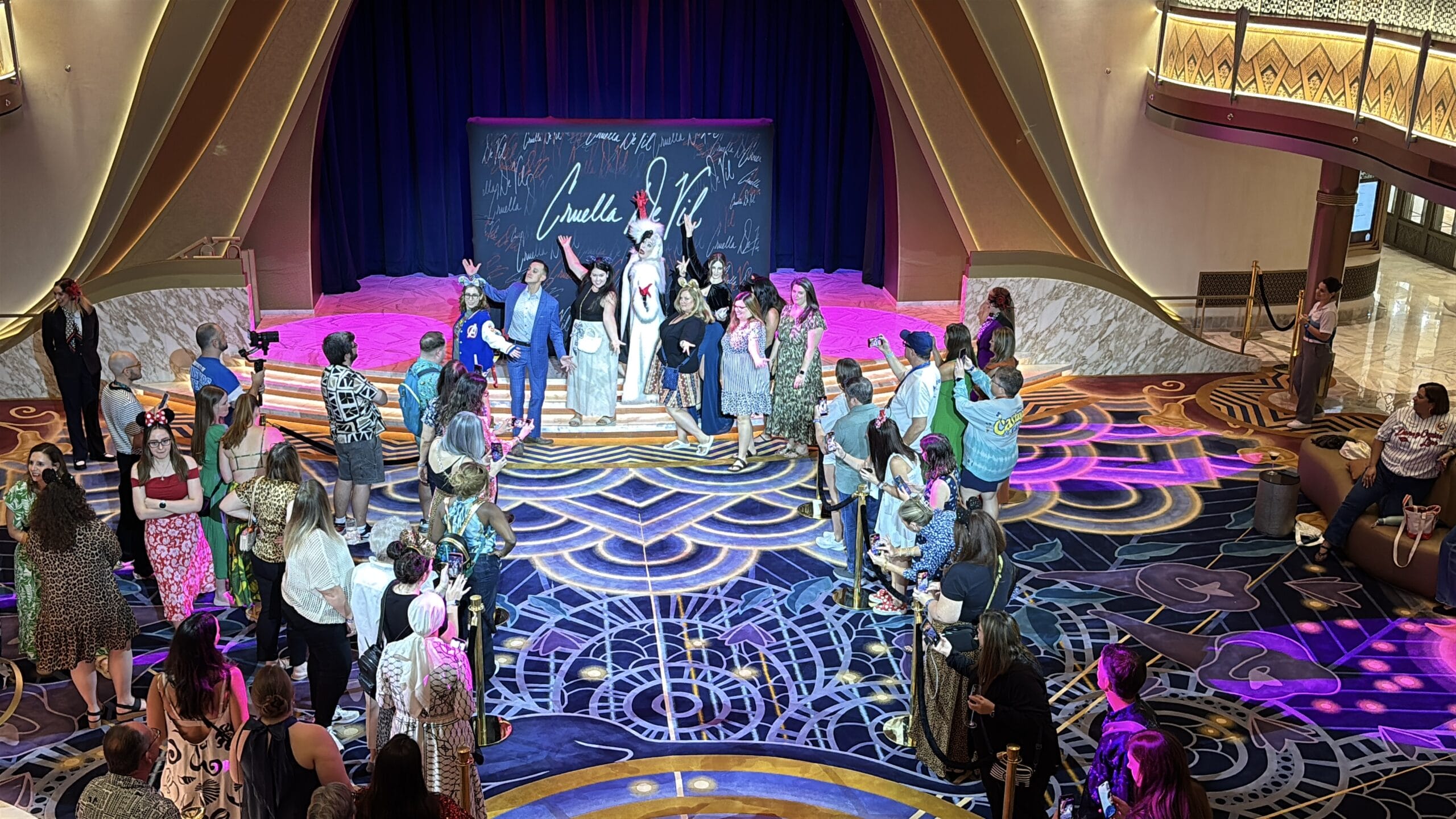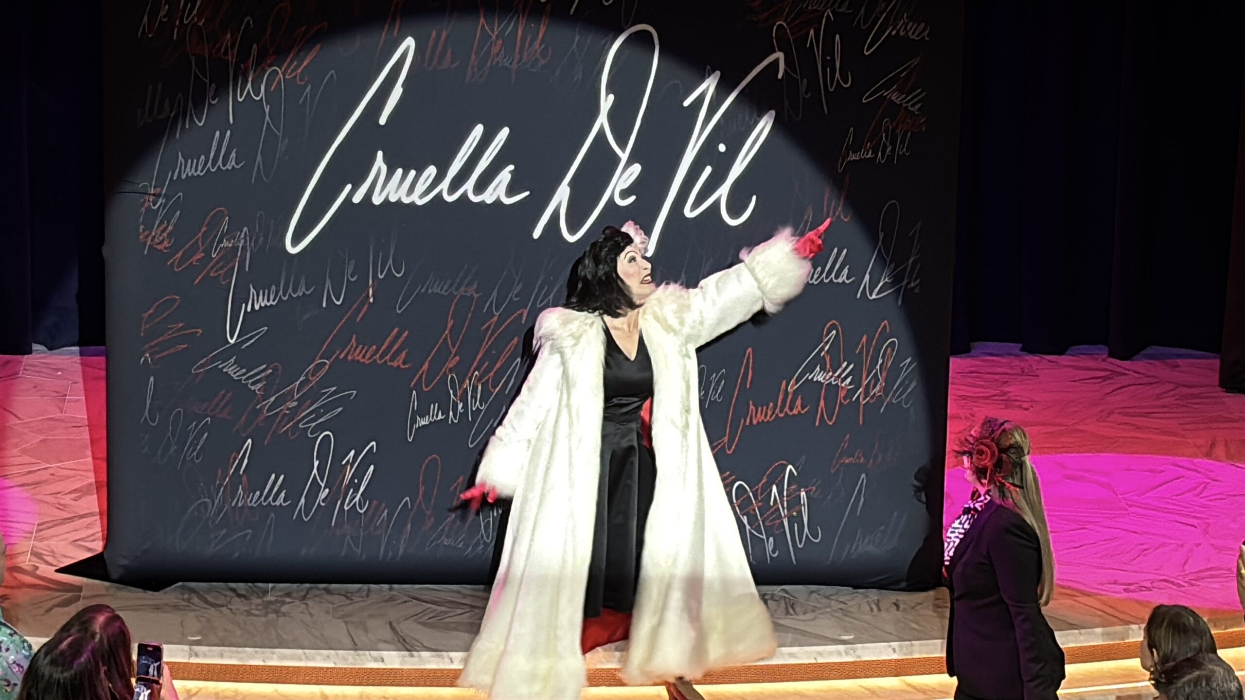 A Cruella de Vil backdrop is set up in front of the stage in the Grand Hall. It has her signature in large white text with smaller signatures surrounding it. The hosts will come out and introduce themselves and the show.