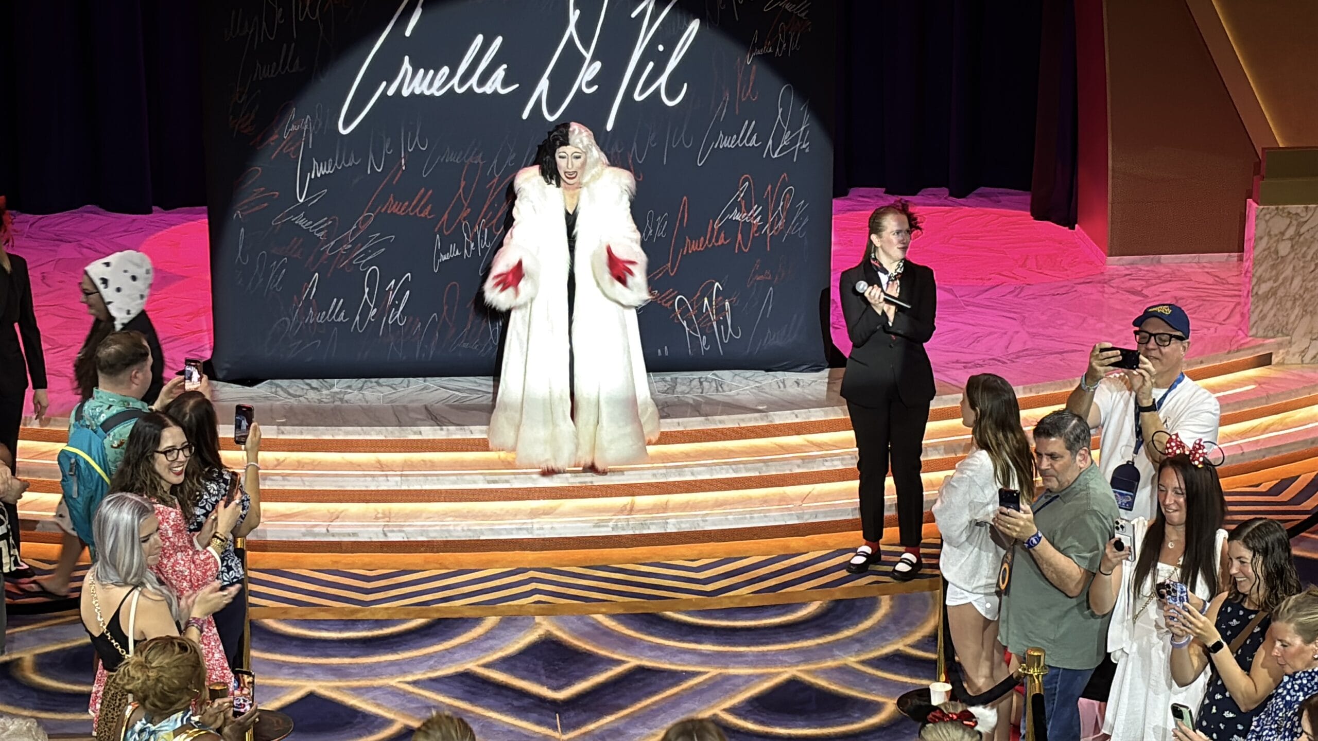 Cruella de Vil hosts Wretched Runway: A Cruella Fashion Show in the Grand Hall of the Disney Destiny. Guests are invited to participate by showing off their style.