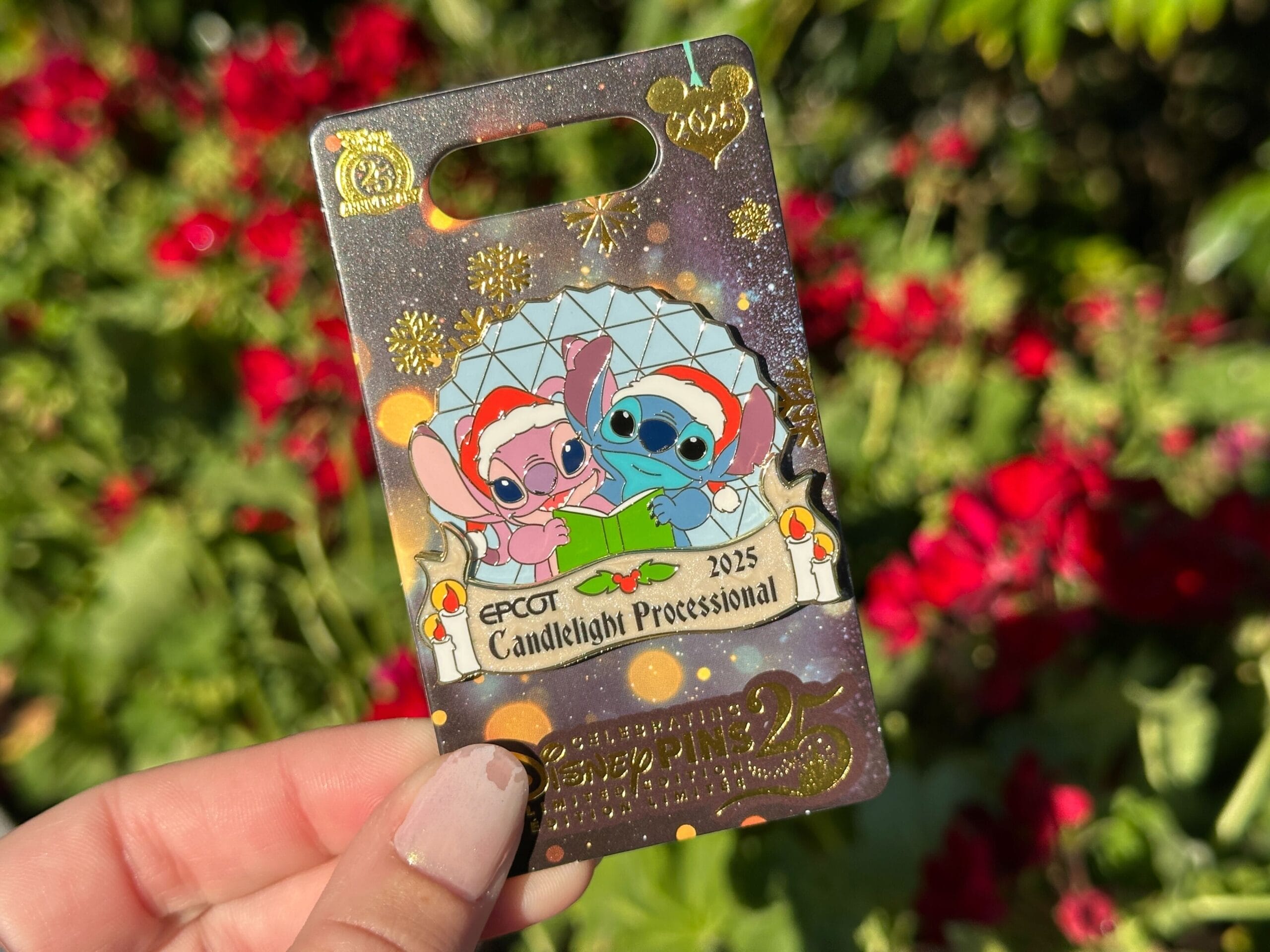 This year’s Candlelight Processional pin features Stitch and Angel in Santa hats in front of Spaceship Earth. This is limited edition 4,000.