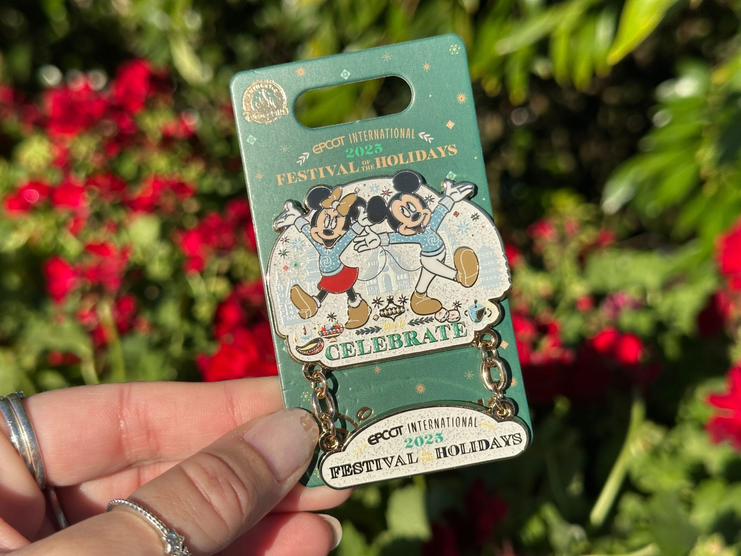 The limited release pin depicts Mickey and Minnie in holiday sweaters just like Figment’s. Behind them are World Showcase buildings in light blue against a sparkly white background. “Celebrate” is across the bottom. A EPCOT International Festival of the Holidays charm dangles.