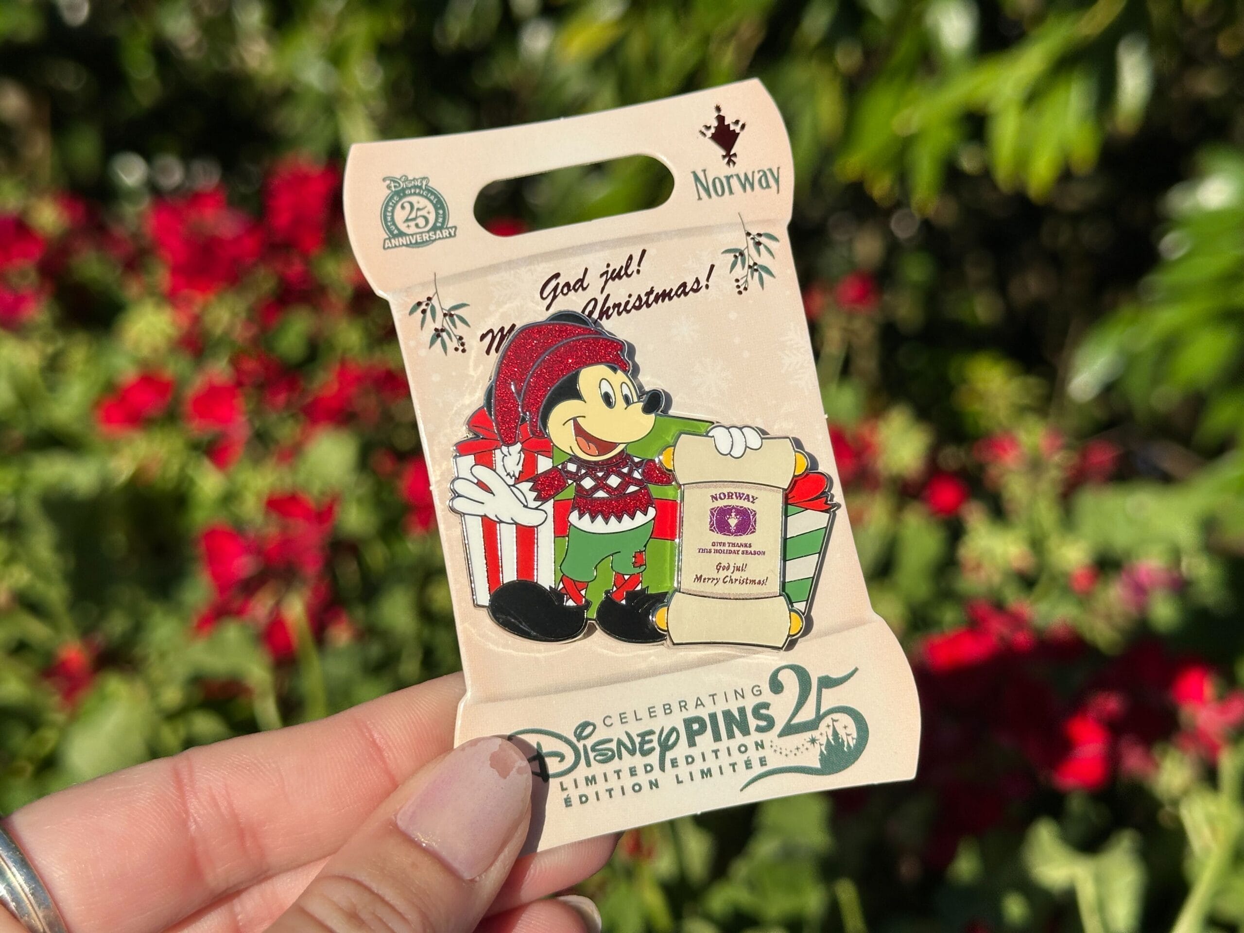 The Norway pin features Mickey as the mischievous Barn Santa. He wears a red sparkly hat, sweater, and green pants. The scroll reads “Norway – Give Thanks This Holiday Season – God jul! Merry Christmas!”