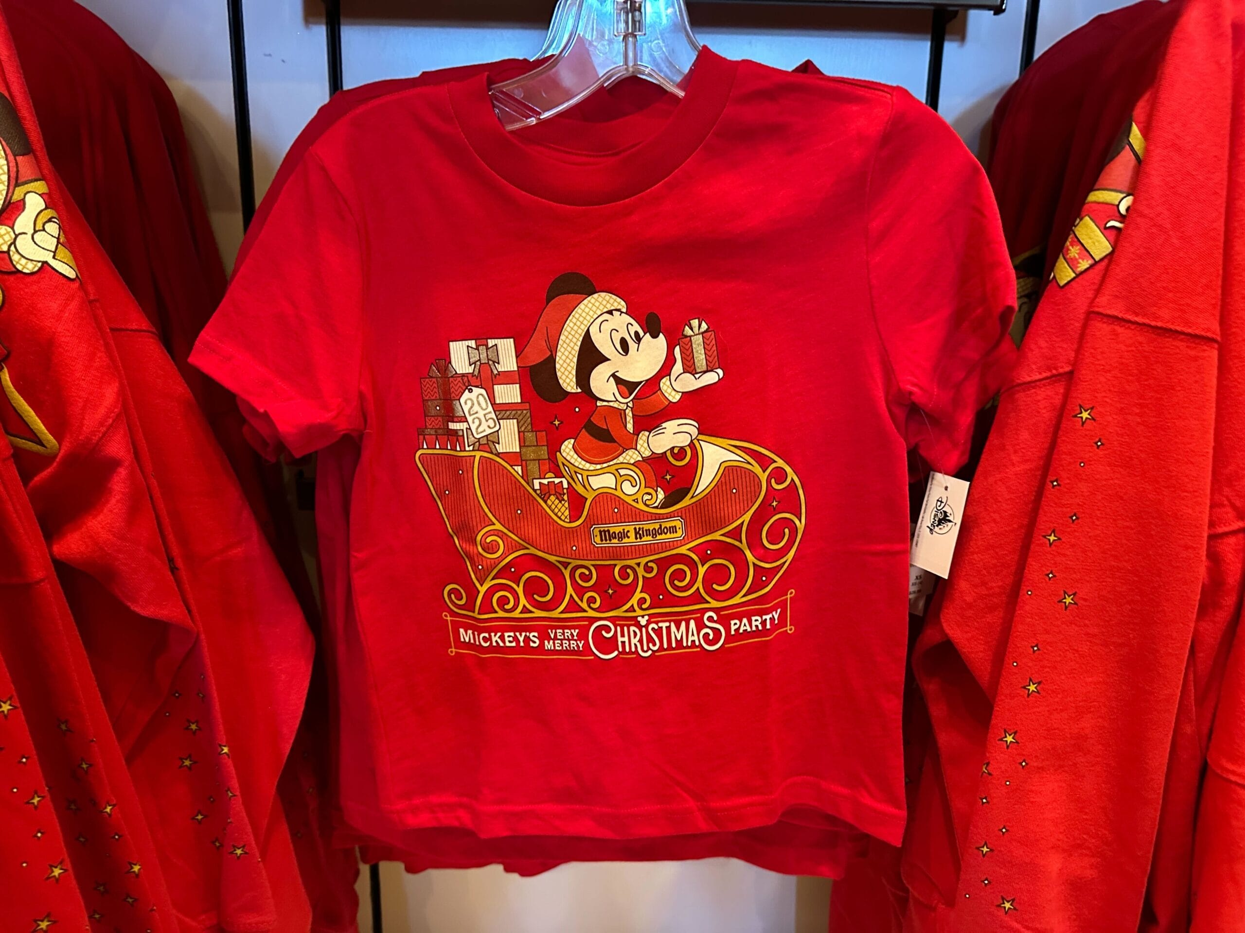 The kids T-shirt is also bright red and has Santa Mickey in a present-laden Magic Kingdom sleigh with golden swirl details. One present has a “2025” tag. The Mickey’s Very Merry Christmas Party logo is below in white. The back is plain.