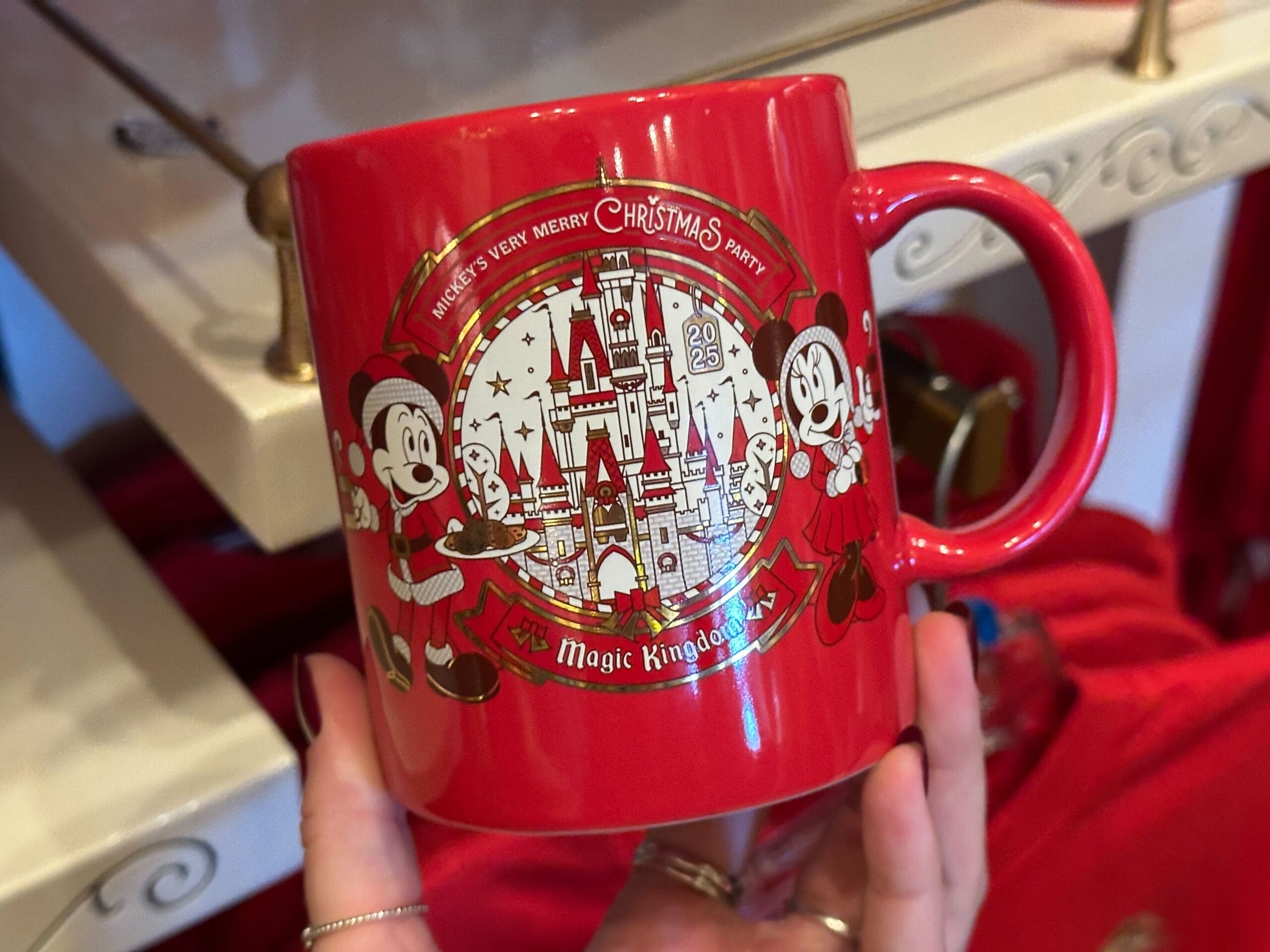 The event mug is red with the circular Mickey’s Very Merry Christmas Party logo in white and gold, featuring Mickey and Minnie and Cinderella Castle.