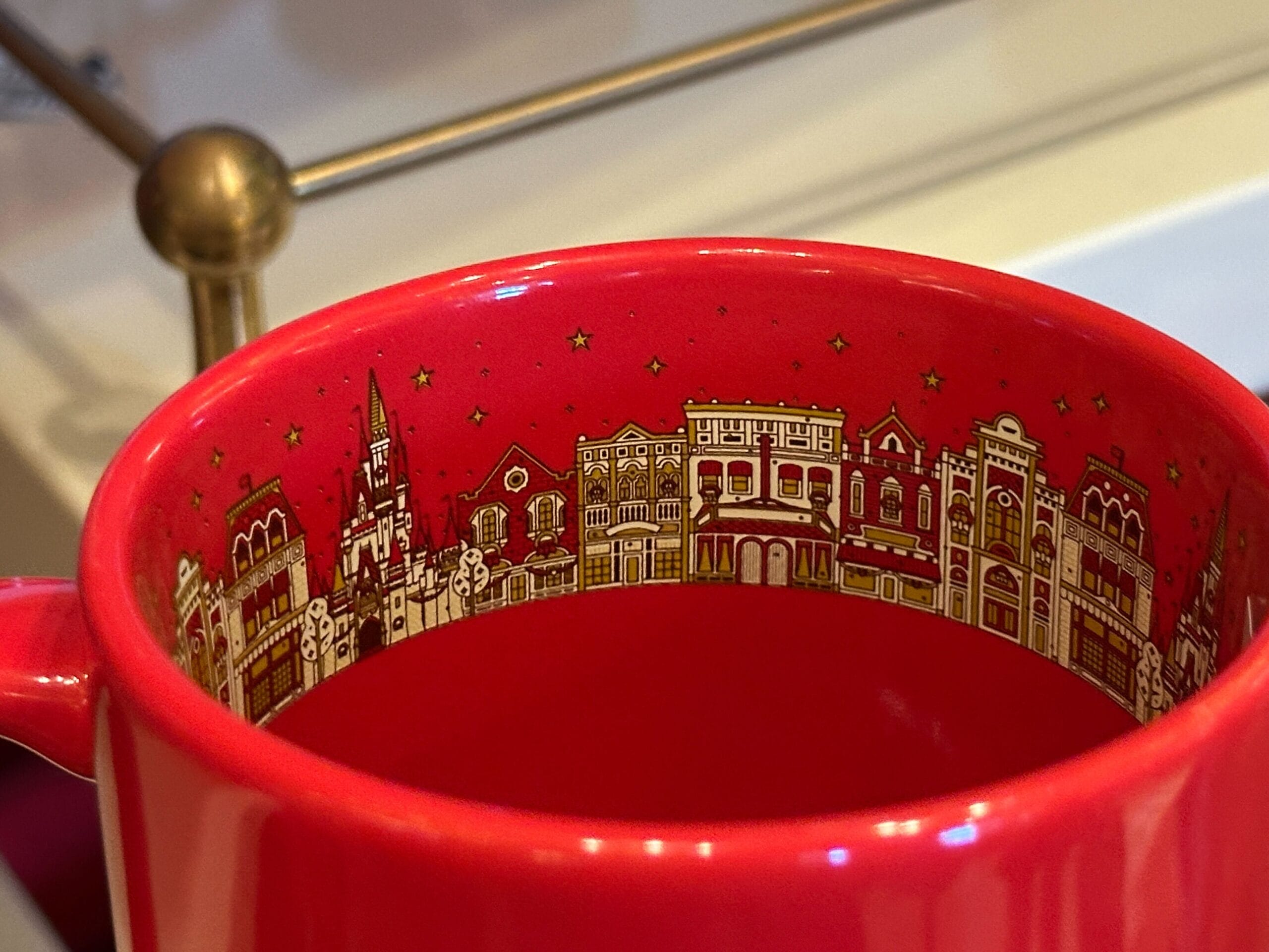 The opposite side has a trio of presents in white, gold, and red. The inside rim of the mug features a pattern of Main Street, U.S.A. facades and Cinderella Castle in the same shades with golden stars.