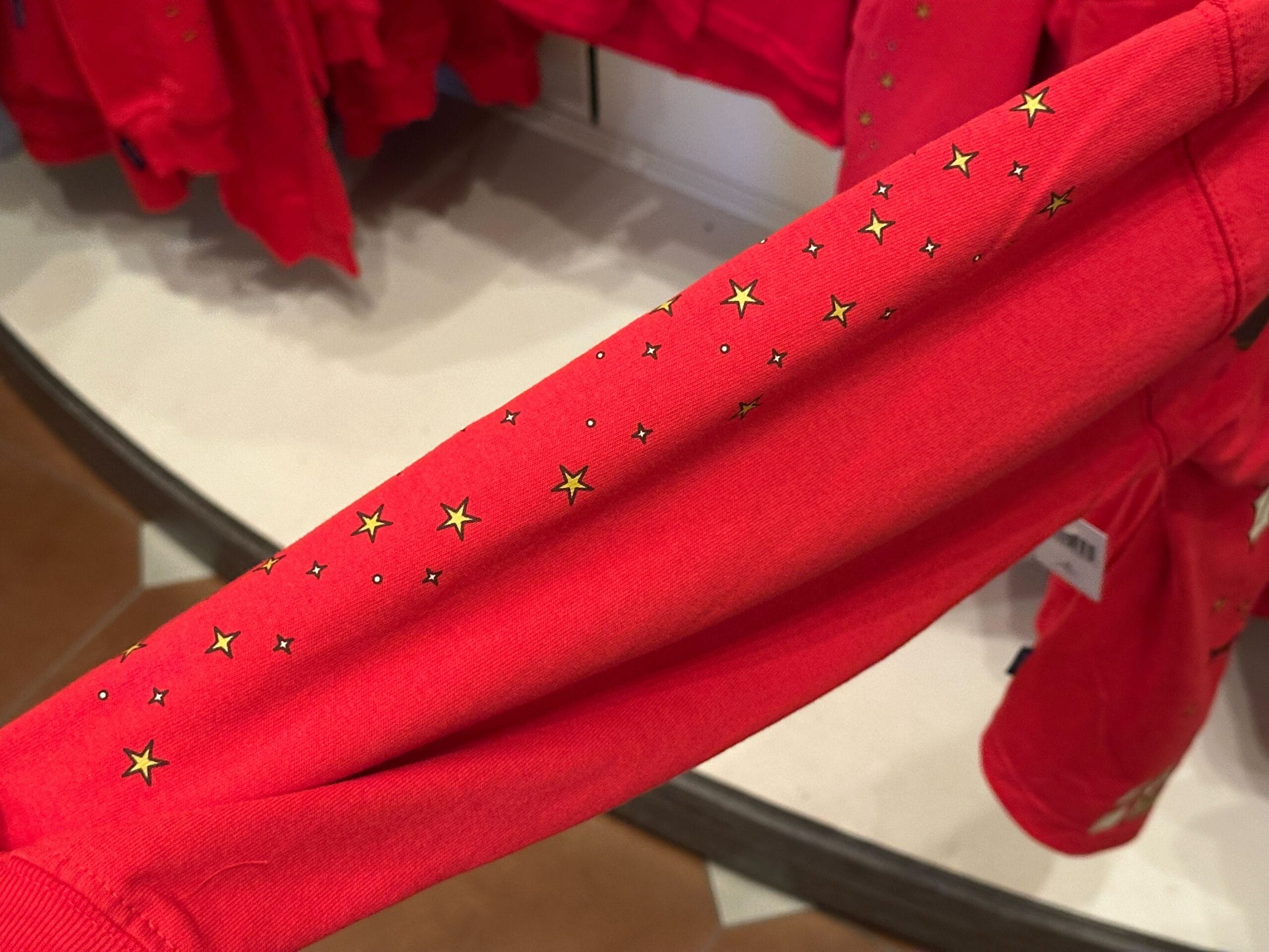 This year’s spirit jersey is red. The back features “Mickey’s Very Merry Christmas Party” in white inside a gold-trimmed ribbon. Flanking the title are Mickey and Minnie, clad in Santa and Mrs. Claus attire and holding a plate of cookies and a mug of cocoa. Stars are sprinkled across the top.